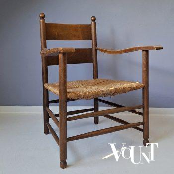 Dit kamerscherm dateert waarschijnlijk uit de jaren ’80. Een deel van de decoratie is in reliëf aangebracht. Architectonisch motief. Door de vorige eigenaar zijn er wieltjes onder het kamerscherm geplaatst. Deze kunnen er weer gemakkelijk afgehaald worden, maar ze maken het scherm wel beter verplaatsbaar. Het scherm heeft naast de voor de leeftijd normale gebruikssporen aan de linkerbovenzijde een bijgewerkte beschadiging. Deze valt echter niet op. Dit houten kamerscherm bestaat uit drie panelen. Aan de achterzijde is het zwart.