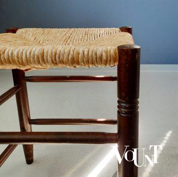 Vintage driepoot houten kruk met biezen, Frankrijk