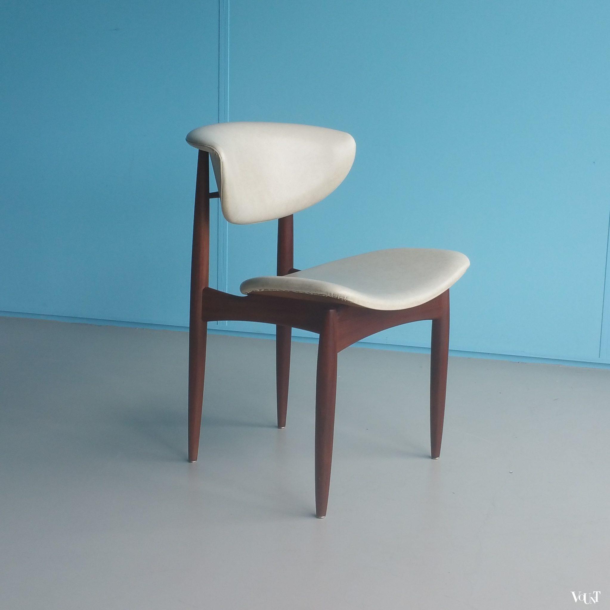 Deze stoelen worden ook wel toegeschreven aan de Nederlandse ontwerper Rudolf Wolf (1919 – 1989). Dit is begrijpelijk gezien de vorm van de rugleuning van de stoelen (vgl. Alpha Meander stoel). Ons is geen documentatie bekend over deze stoelen. Waarschijnlijk moet eerder gedacht worden aan een Deens ontwerp. De stoelen zitten door de brede zitting en de mooi gevormde rugleuning heel comfortabel. Het teakhout en skaileer zijn in goede staat. Op een van de rugleuningen bevinden zich 3 minieme sneetjes, nauwelijks opvallend.