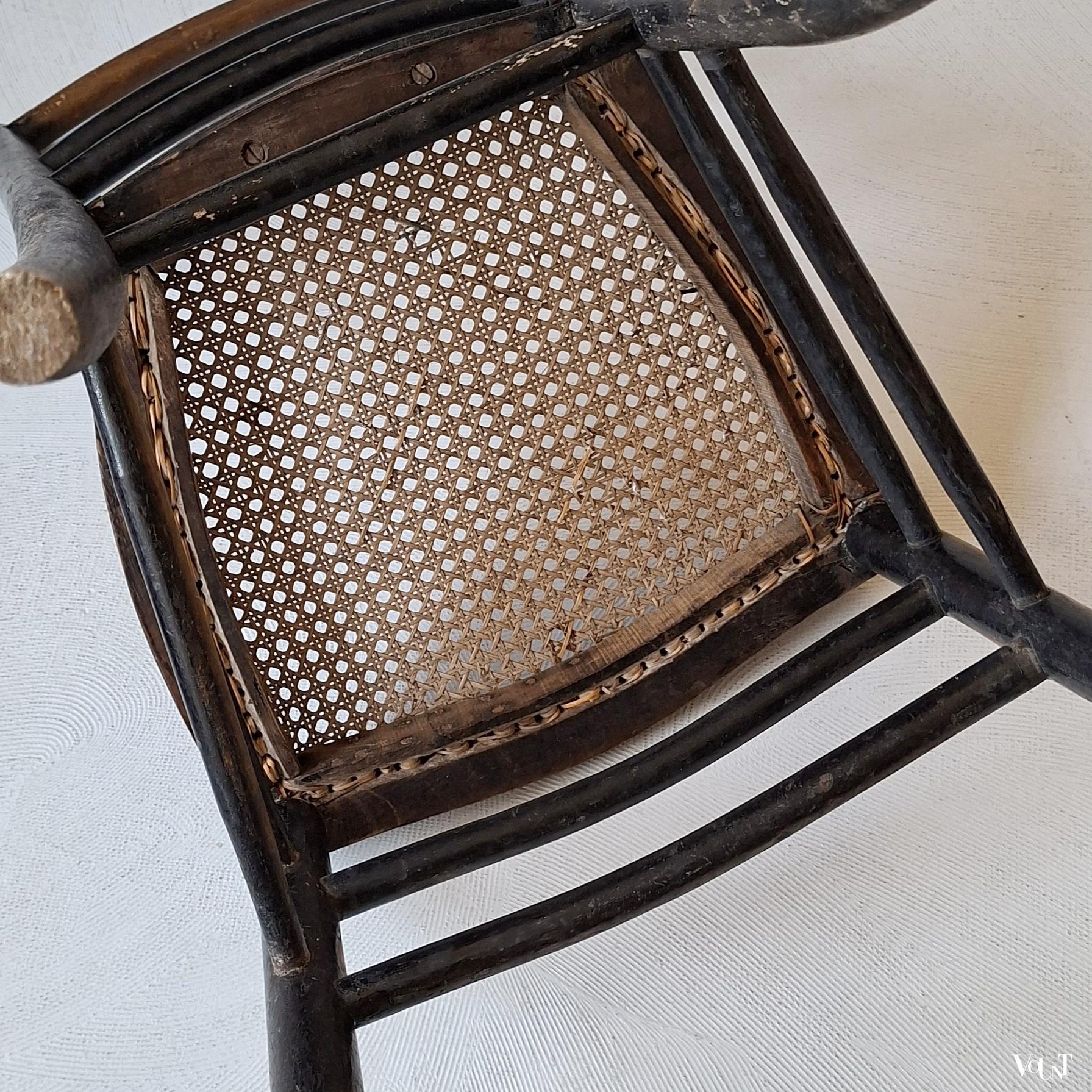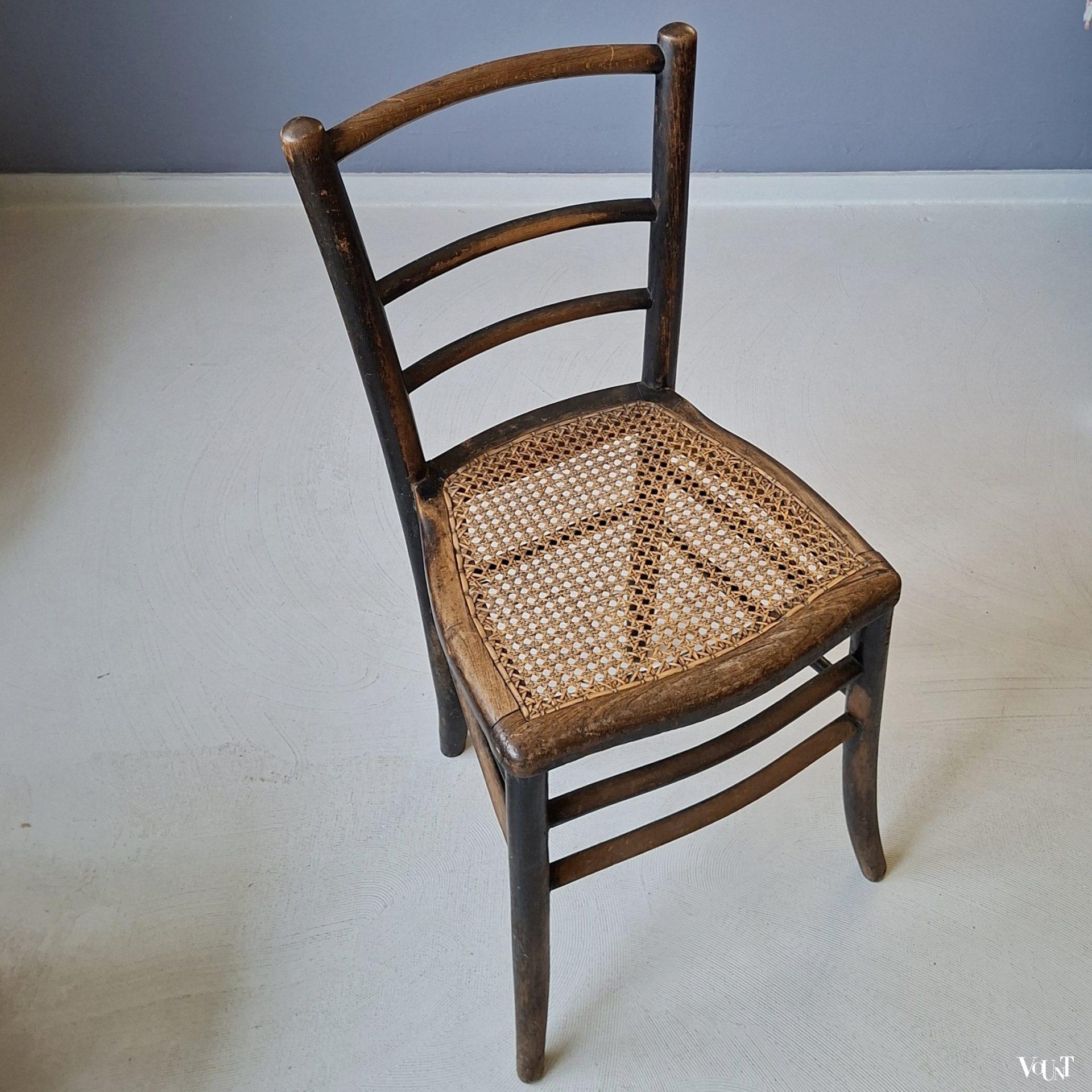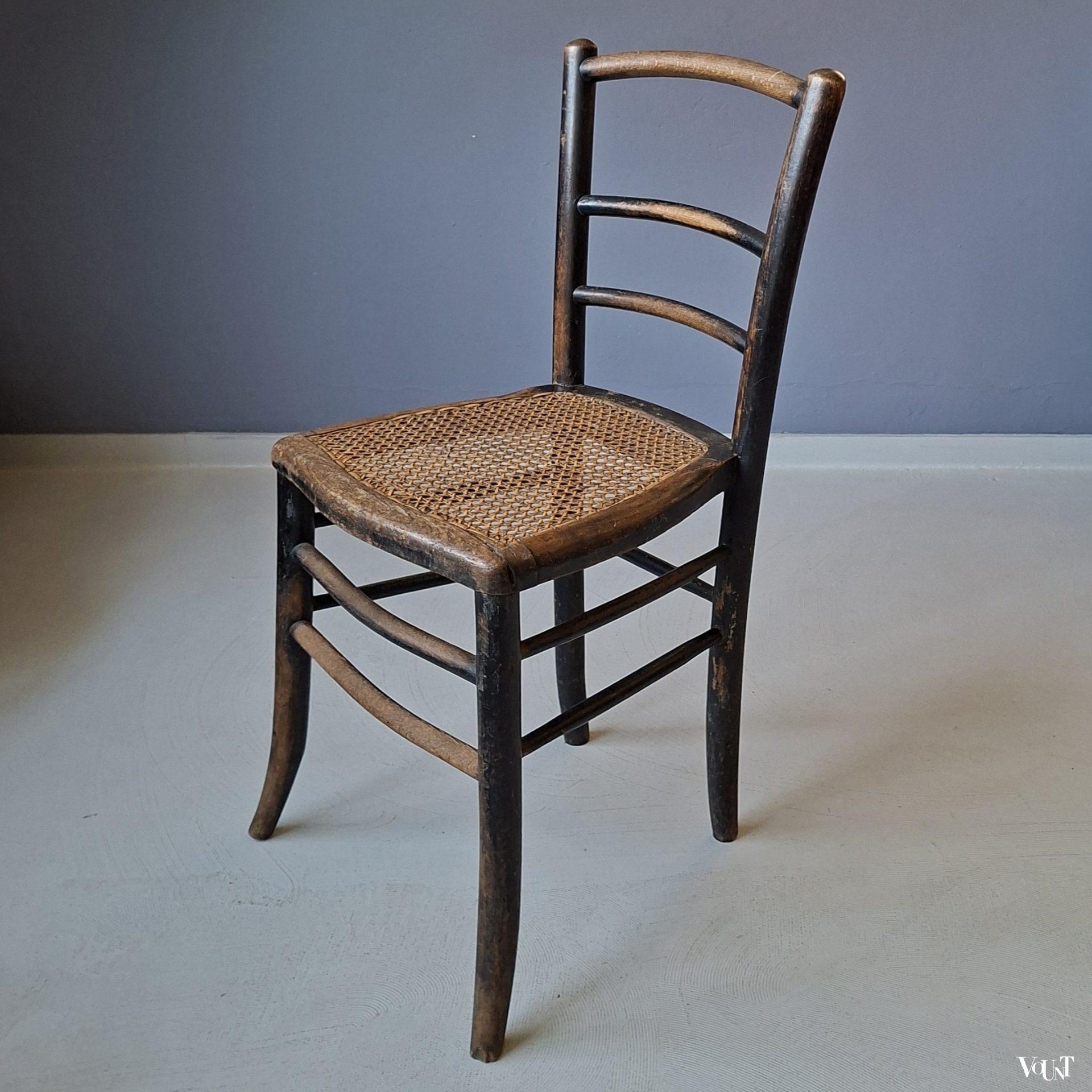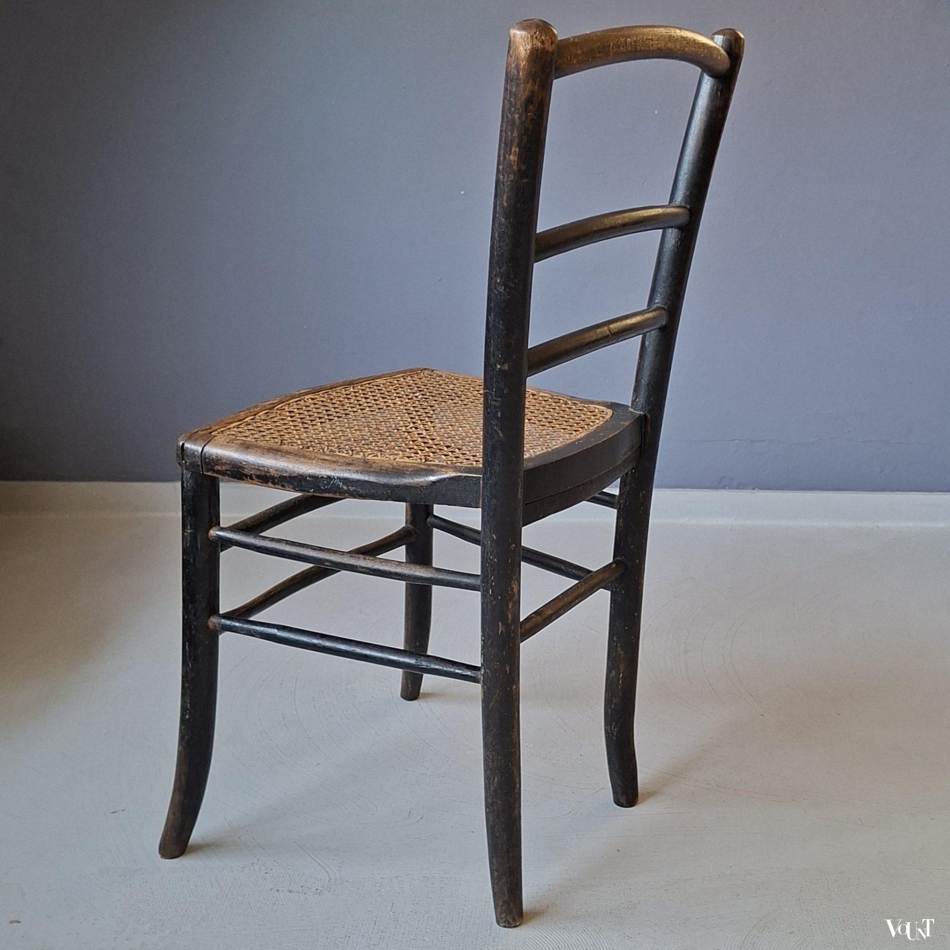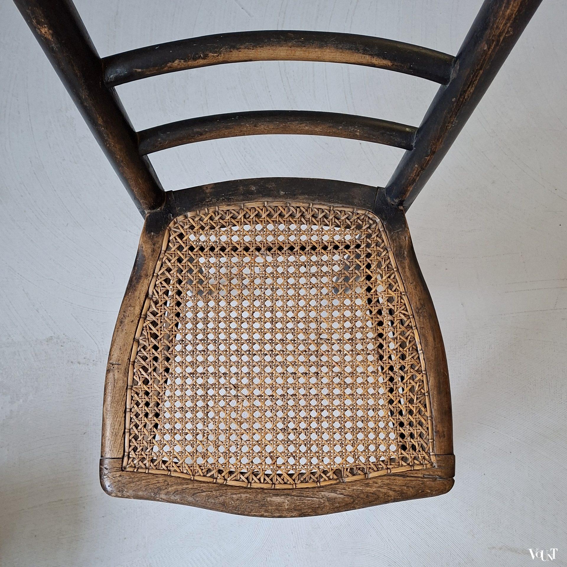 Dit antieke Franse caféstoeltje is in originele conditie. De zwarte verflaag is op verschillende plekken zo goed als helemaal afgesleten en de met de hand geweven rotan zitting heeft een warme kleur. Bijzonder decoratief. Hoewel stevig, is dit geen stoel voor dagelijks gebruik; eerder te gebruiken als decoratie-item of bijvoorbeeld als stoel in een slaapkamer.