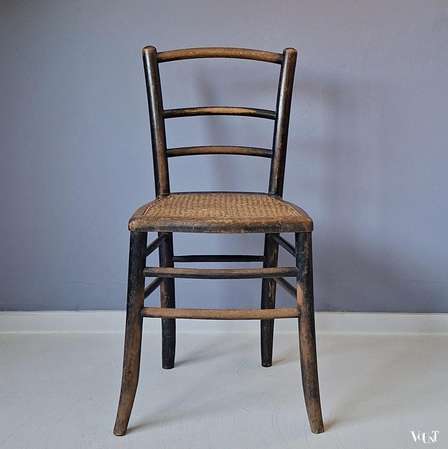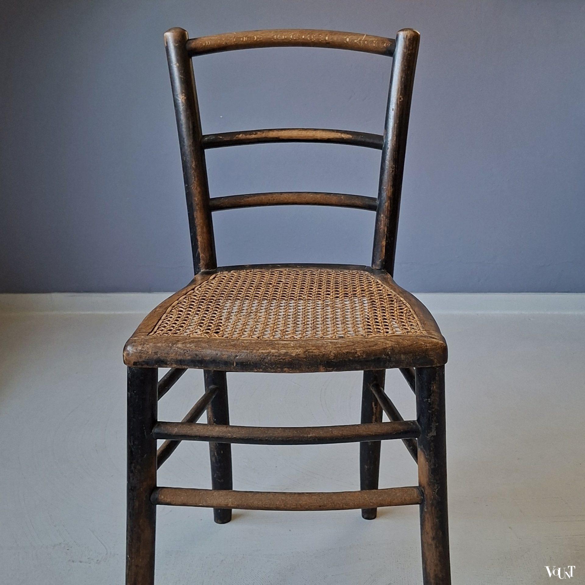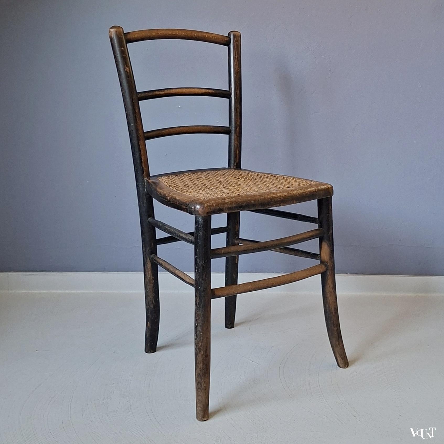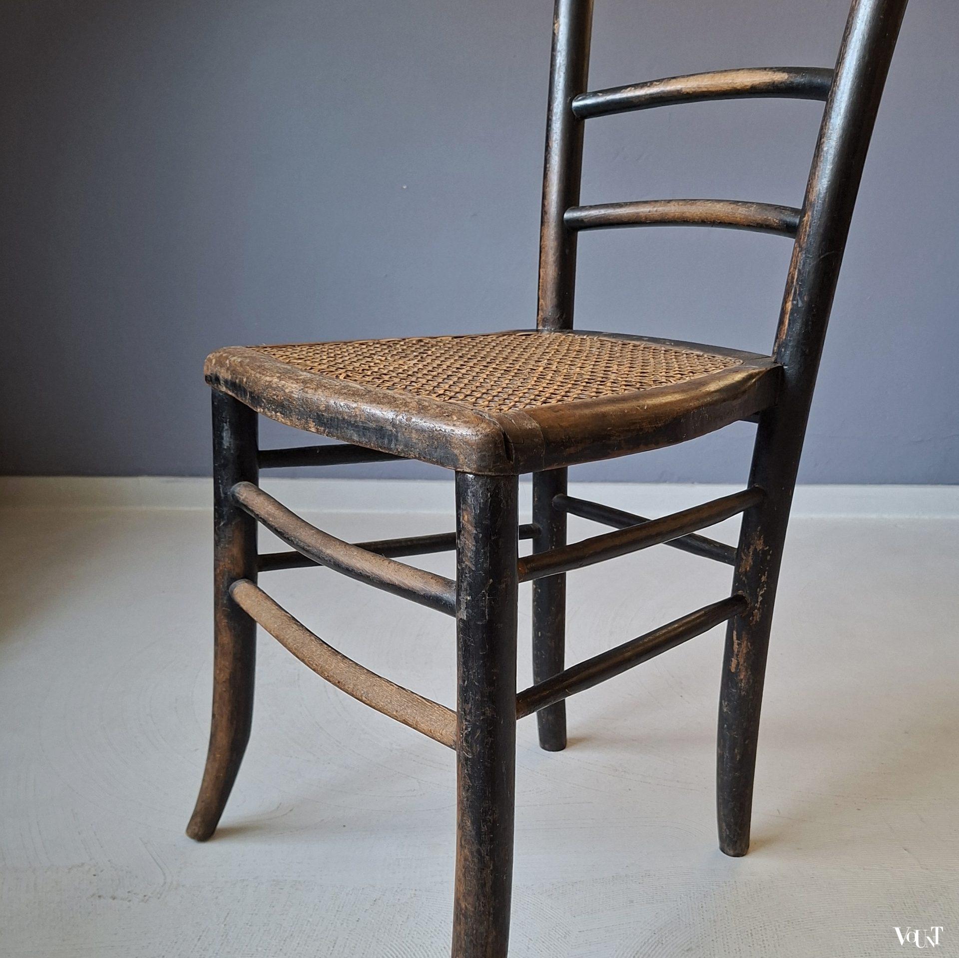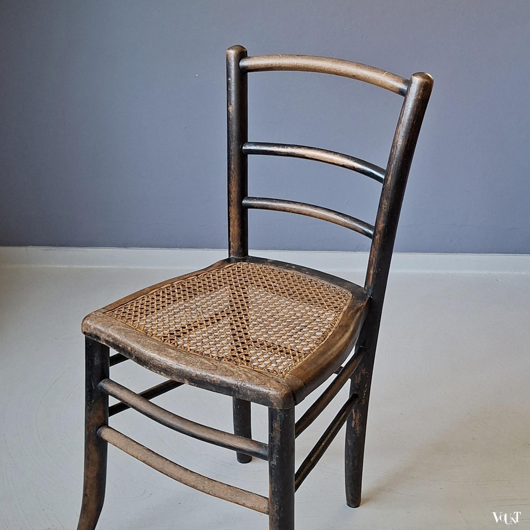Dit antieke Franse caféstoeltje is in originele conditie. De zwarte verflaag is op verschillende plekken zo goed als helemaal afgesleten en de met de hand geweven rotan zitting heeft een warme kleur. Bijzonder decoratief. Hoewel stevig, is dit geen stoel voor dagelijks gebruik; eerder te gebruiken als decoratie-item of bijvoorbeeld als stoel in een slaapkamer.