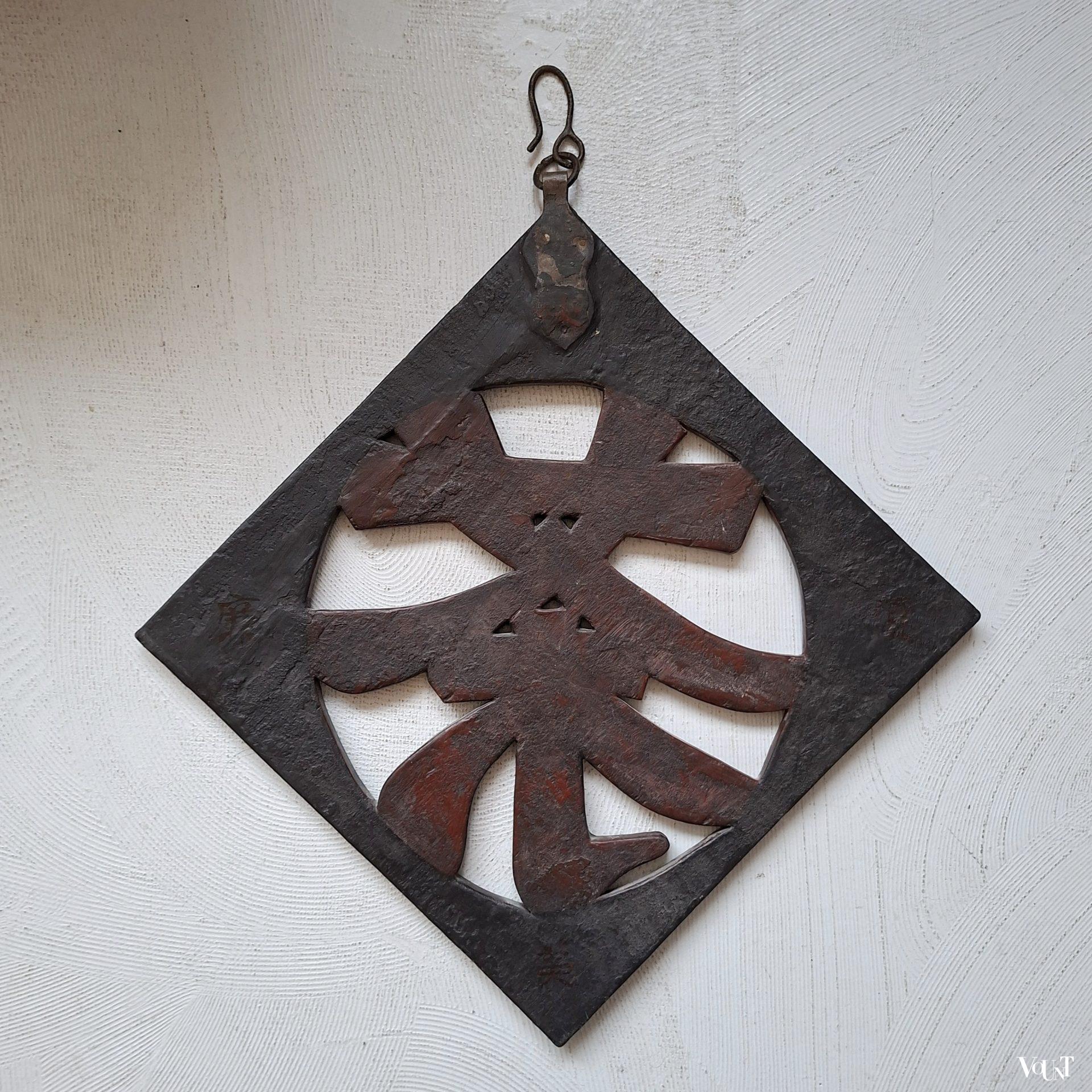 Dit uithangbord is samengesteld uit een houten handbewerkte Japanse Jizai Kagi vis en een zwart houten bord met daarop in donker rood het Japanse karakter voor thee; waarschijnlijk een uithangbord voor een theehuis of theewinkel.