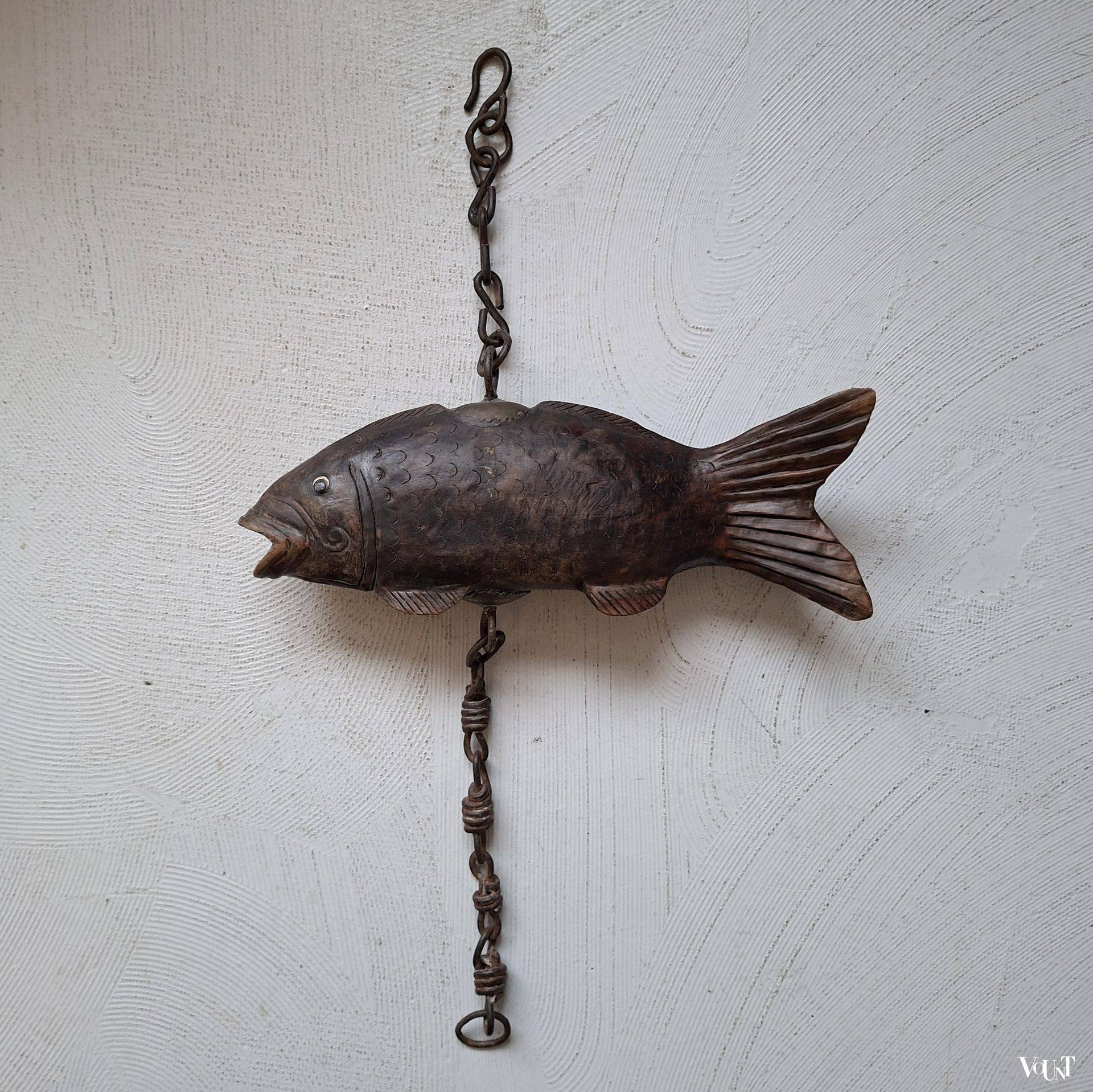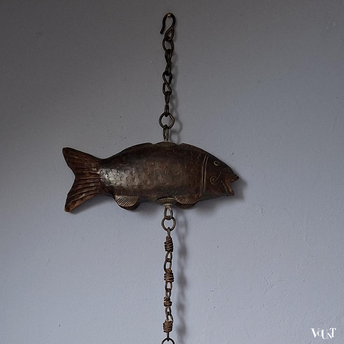Afmetingen: uithangbord met ketting hoog 110 cm, vis 12 x 30 x 6 cm, uithangbord 45 x 45 x 1 cm