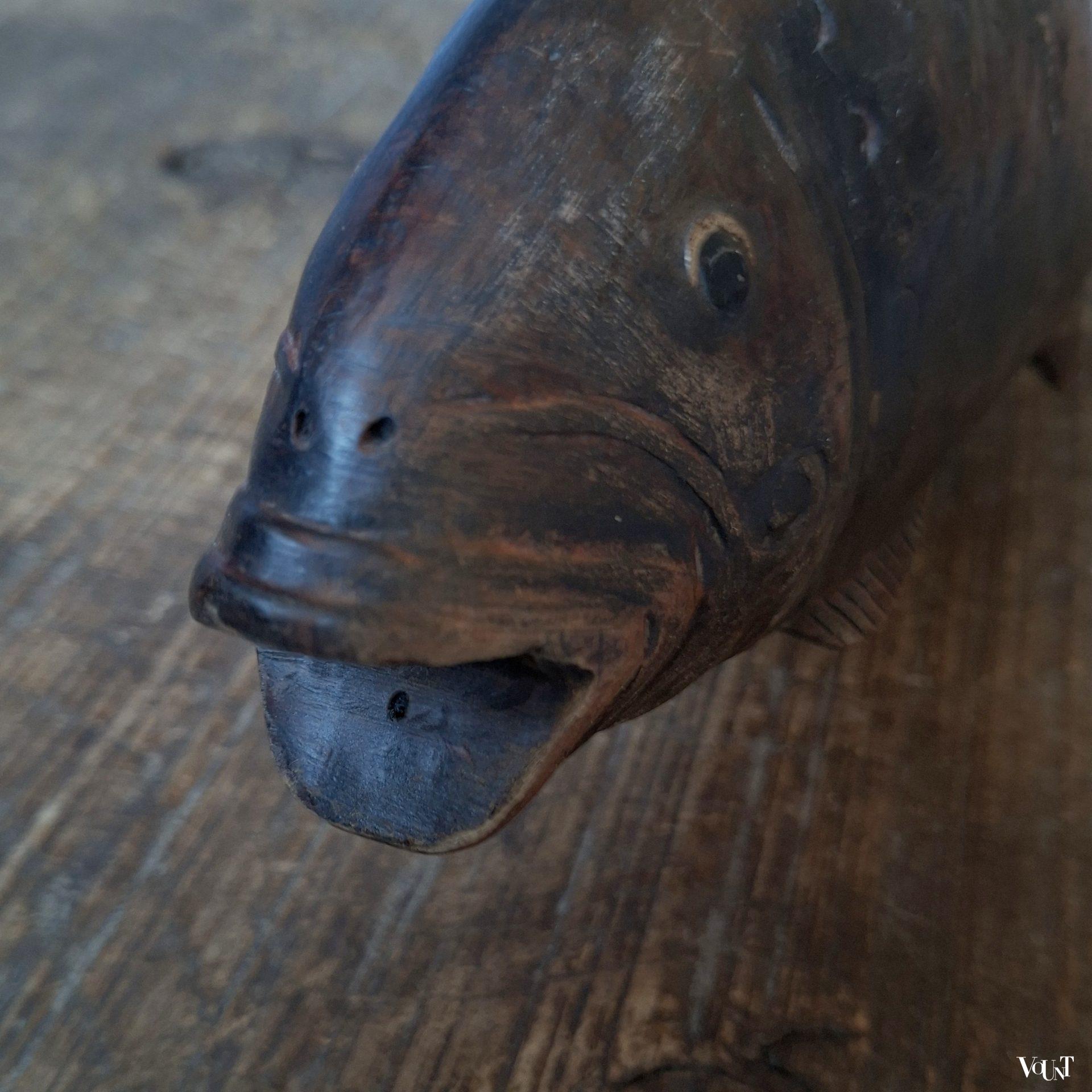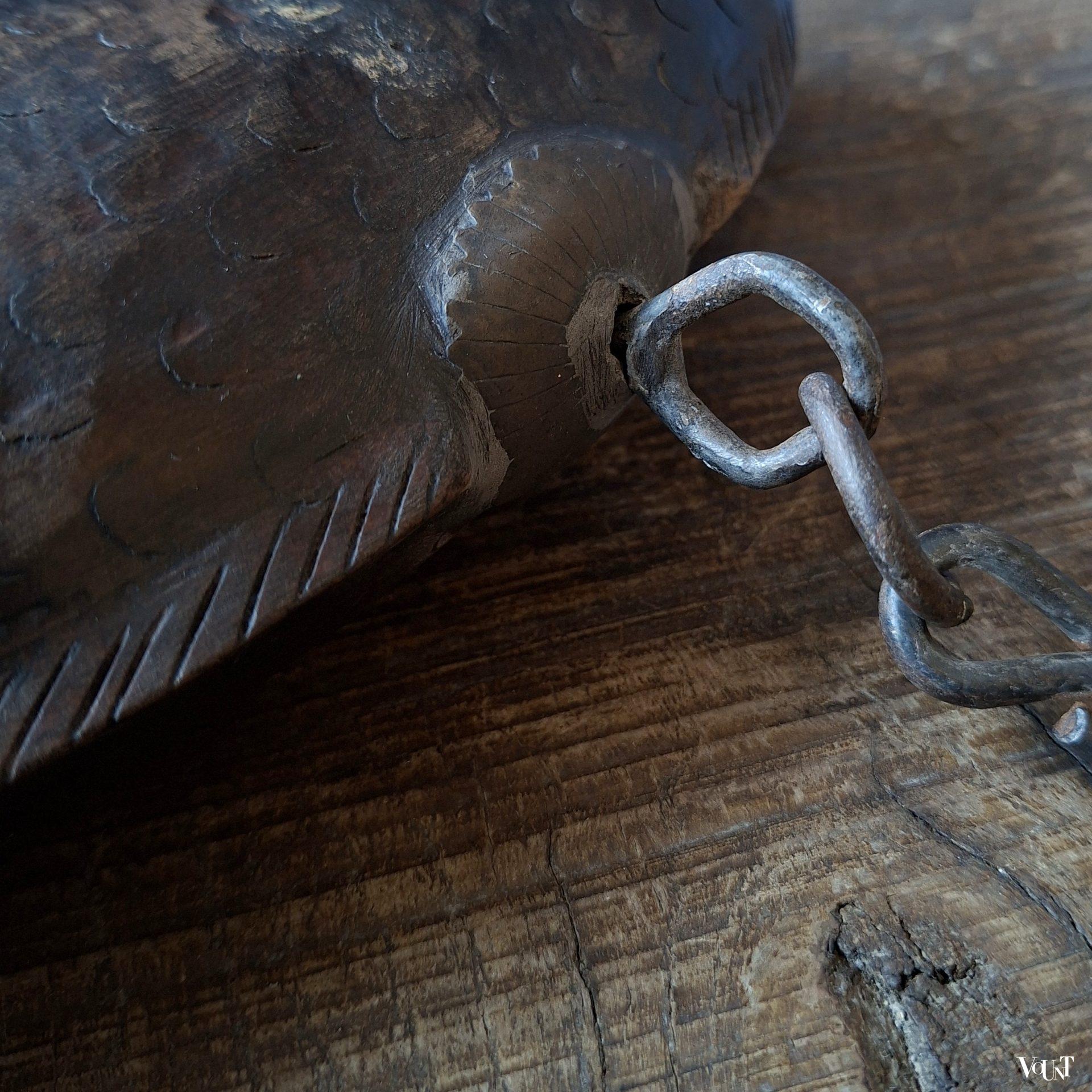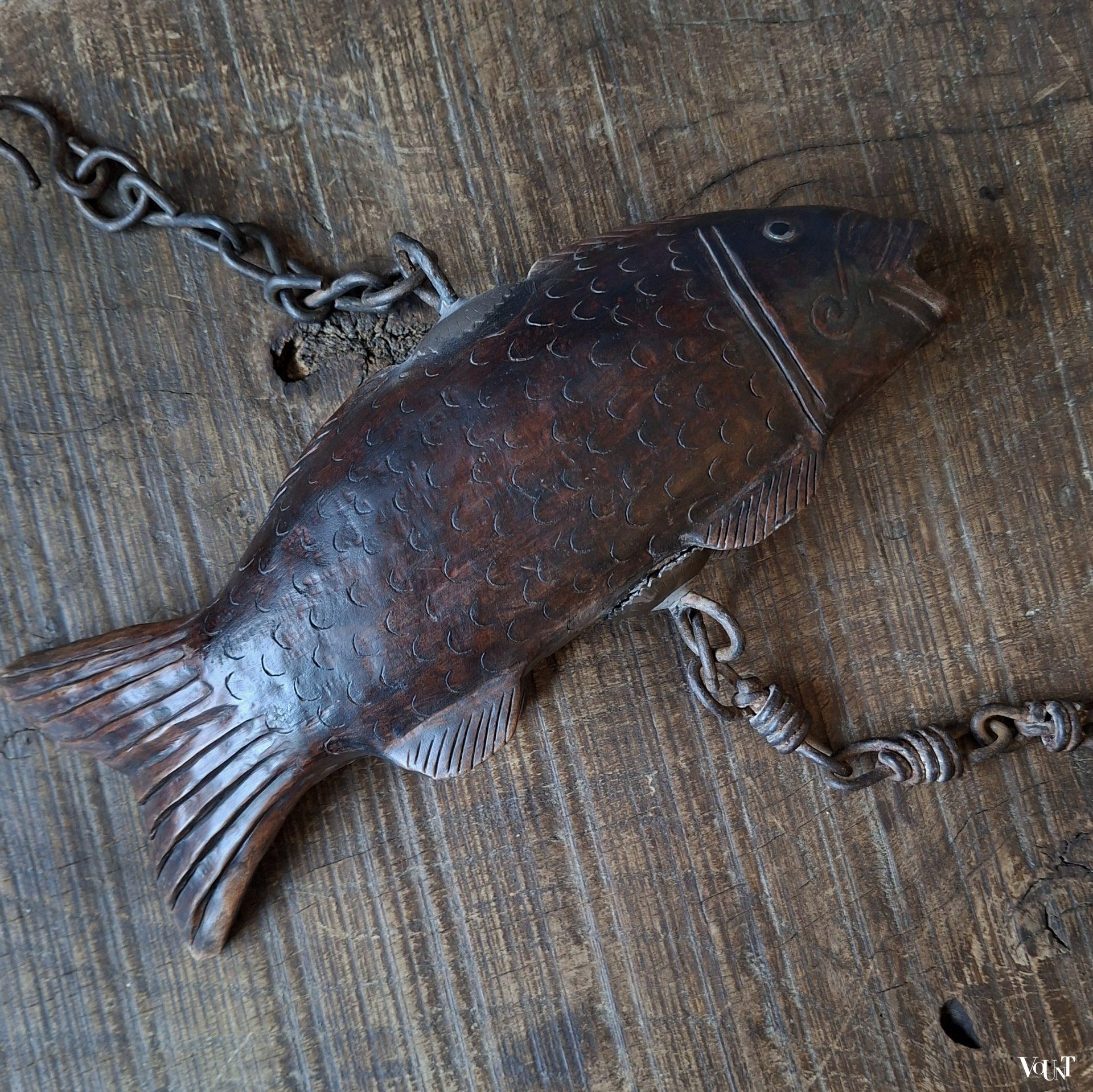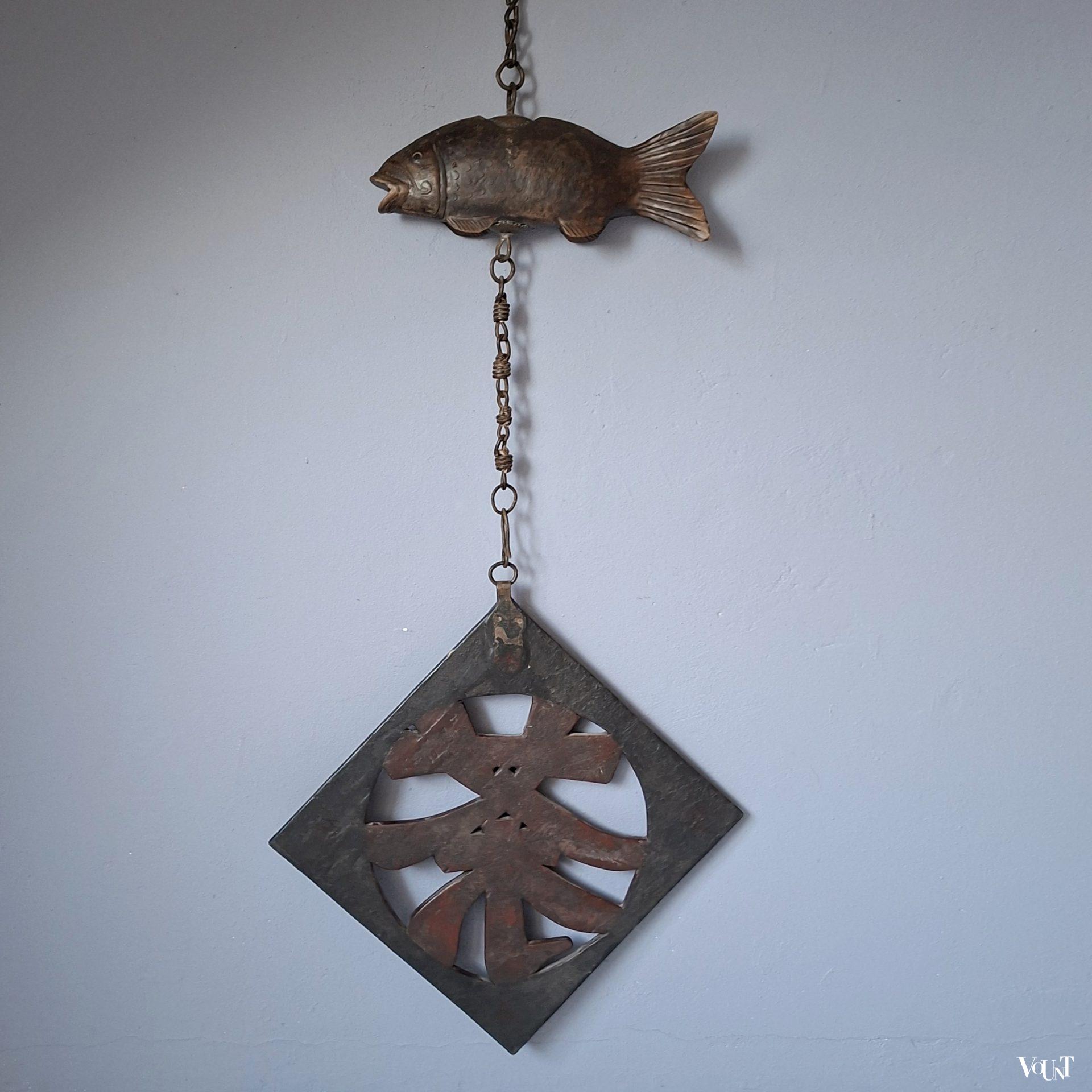 Oude Japanse huizen hadden (hebben) een verzonken vuurhaard (irori) waarboven een Jizai Kagi (haardhaak) hing. Deze verstelbare Jizai Kagi werd gebruikt om ketels en potten boven het vuur te hangen; houten vissen als deze maakten vaak onderdeel uit van de haardhaak, waarbij de vis ook bescherming tegen vuur symboliseerde.