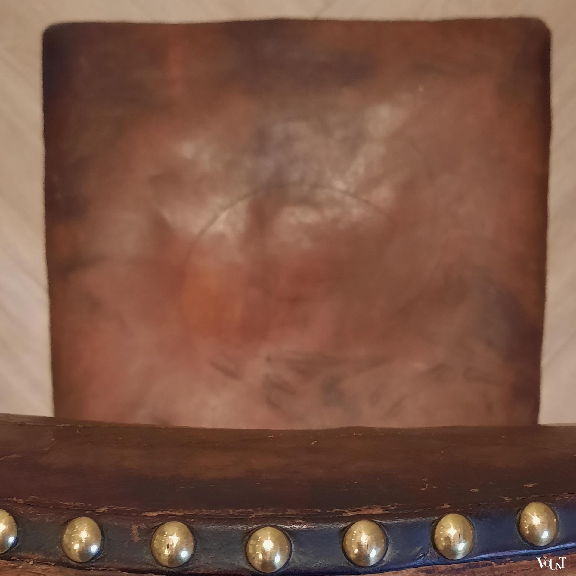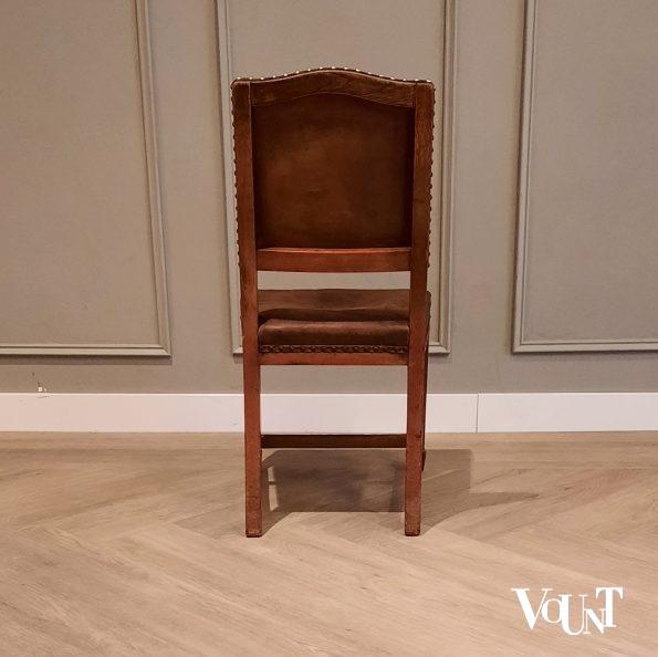 Eikenhouten frame en bruine leren bekleding. Nog helemaal in originele staat, daardoor wat de leren zitting betreft niet meer geschikt voor dagelijks (intensief) gebruik. Gebruikssporen overeenkomstig leeftijd. Mooi decoratie-item.