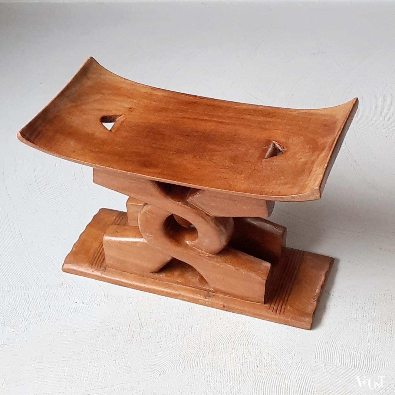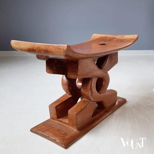 Deze kruk is afkomstig uit Ghana en is verbonden met de Asante / Ashanti-cultuur. Oorspronkelijk werd de kruk speciaal voor de eigenaar gemaakt en mocht deze ook door niemand anders worden gebruikt. Hierdoor bestaat er een grote variëteit aan vormgeving van deze krukken (dit ontwerp: “Tafohene Gwa”). De krukken worden uit één stuk hout gemaakt. Dit exemplaar is gekocht in de jaren ’60. In goede conditie. Voor de leeftijd normale gebruikssporen. Mooi, decoratief item. Gewicht: 3,9 kg.