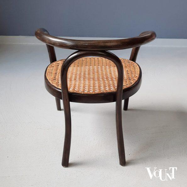 Dit kinderstoeltje van gebogen beukenhout doet denken aan stoel nr. 201 van Thonet*, ontworpen rond 1900. Het stoeltje bestaat uit een donkerbruin bentwood (met behulp van stoom gebogen houten) frame en een met de hand geweven rotan zitting (ofwel Wiener Geflecht). Niet gemerkt, maar wij beschikken of een ander (zwart) exemplaar van dit stoeltje met een papieren label SL. Dit papieren label wordt zowel toegekend aan de Italiaanse firma Salvatore Leone, Modena, Noord-Italië als aan Sautto e Liberale, Campanië. Over beide firma’s is slechts summiere informatie te vinden. Salvatore Leone werd in de 19e eeuw opgericht en heeft tot de jaren ’70 bestaan. Het produceerde veel stoelen naar Thonet-model. Van Sautto e Liberale (1935 opgericht) weten wij dat ze op dezelfde wijze te werk gingen Datering: 1e helft 20e eeuw. Met de hand geweven rotan webbing. Hout en rotan in goede conditie.