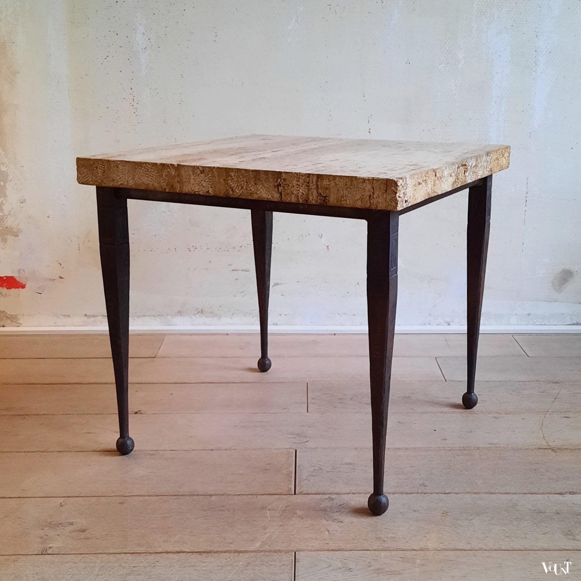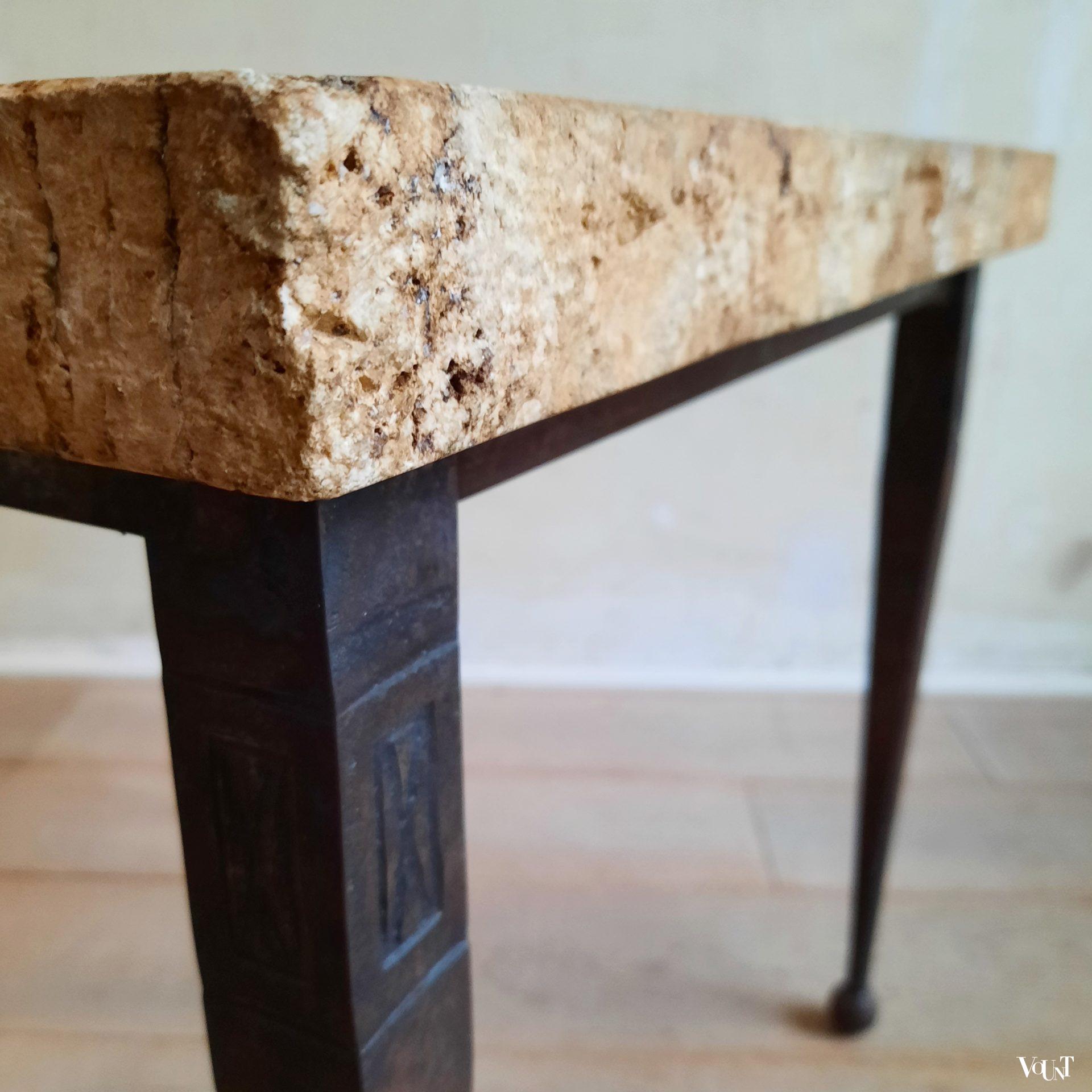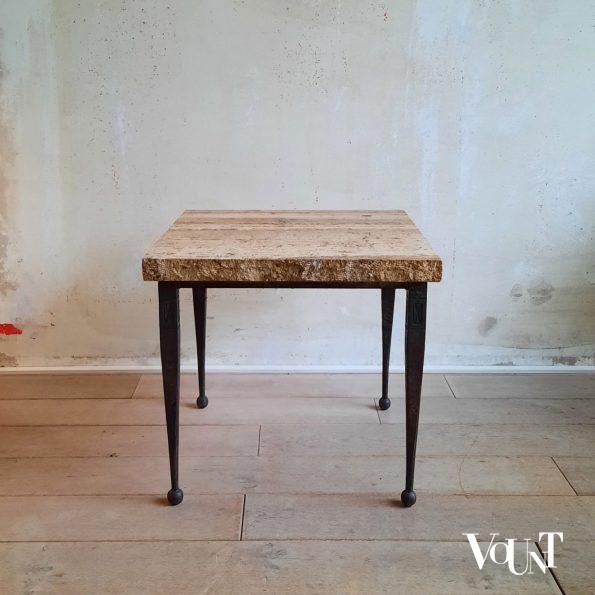 In de jaren ’80 was travertin weer helemaal de trend. Anders dan in bijvoorbeeld de jaren ’60 en ’70 waren de ontwerpen vaak grof vormgegeven en soms ook wat over de top, niet alleen qua gewicht. Deze bijzettafel hoort ook in die trend thuis, maar is zeker niet over de top en goed in balans. Massief metalen frame met enige decoratie aan de bovenzijde van de poten die op bolvoetjes staan en een dik travertin blad (27 kg). Voor vervoer kan het blad gemakkelijk van de tafel worden gescheiden. Voor de leeftijd normale, lichte gebruikssporen.