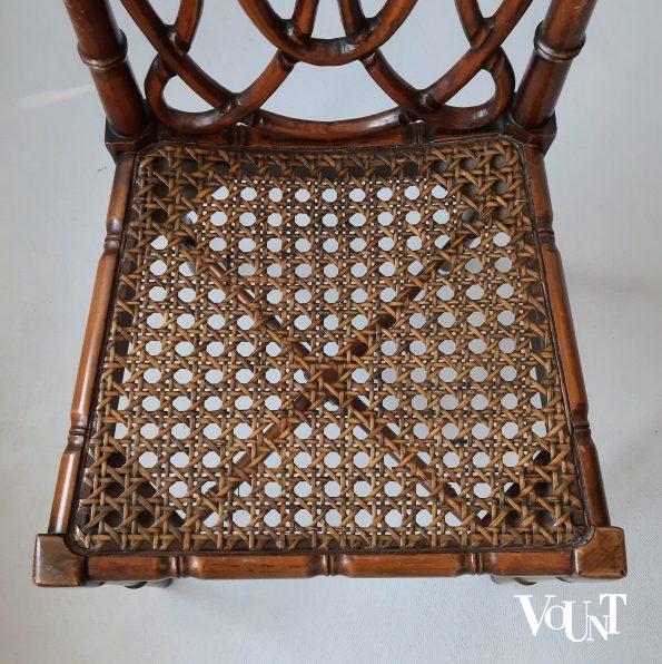 Dit model houten faux bamboo stoel kom je wat minder tegen. Opvallend is dat de decoratie in de rugleuning uit één stuk hout is gemaakt. De rotan webbing van deze stoel is vrij grof. Waarschijnlijk is dit nog de originele webbing. In goede conditie met voor de leeftijd normale gebruikssporen.