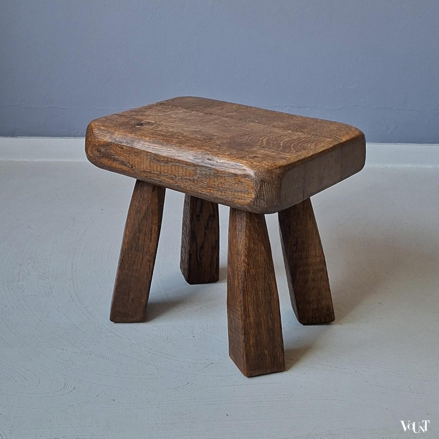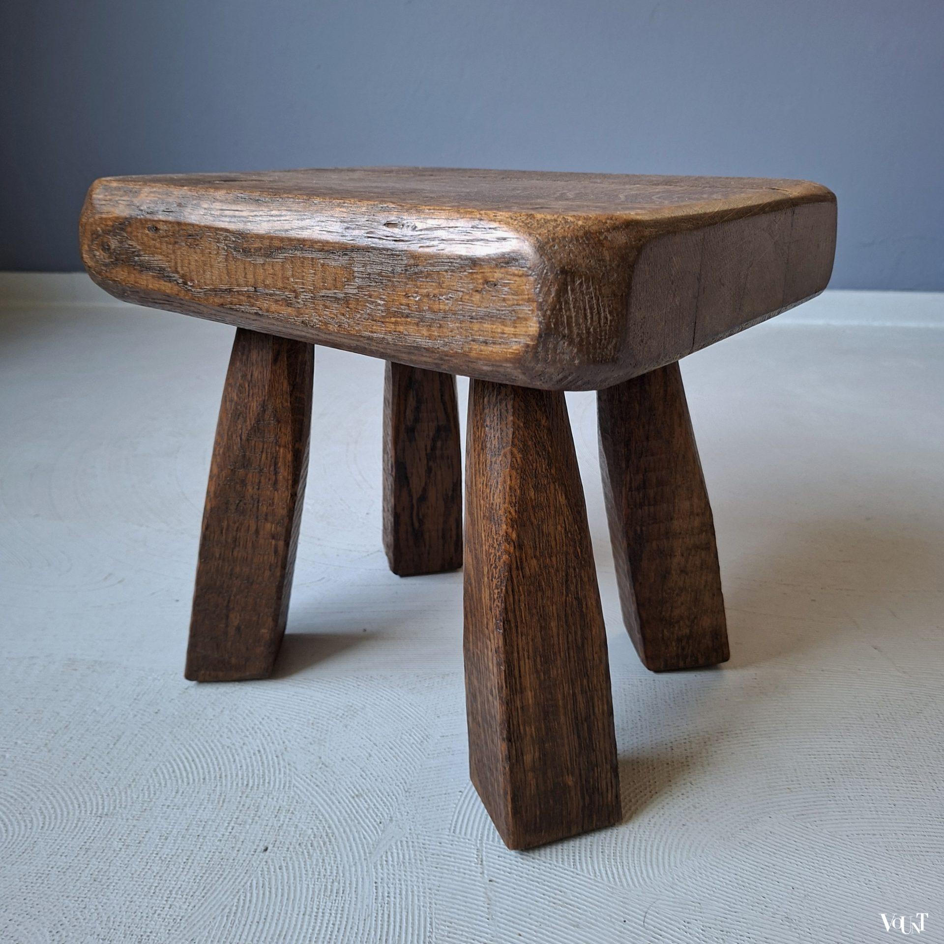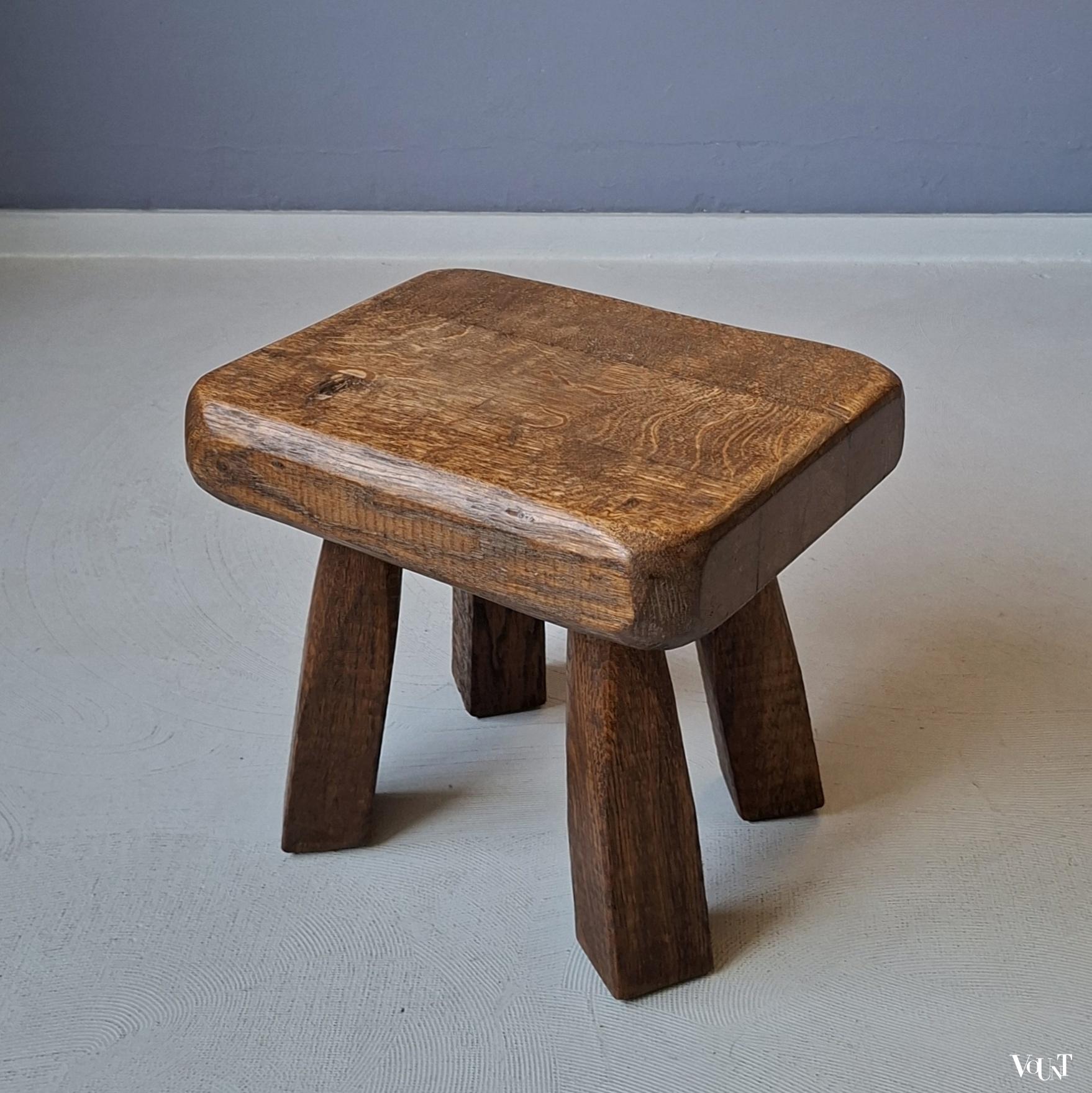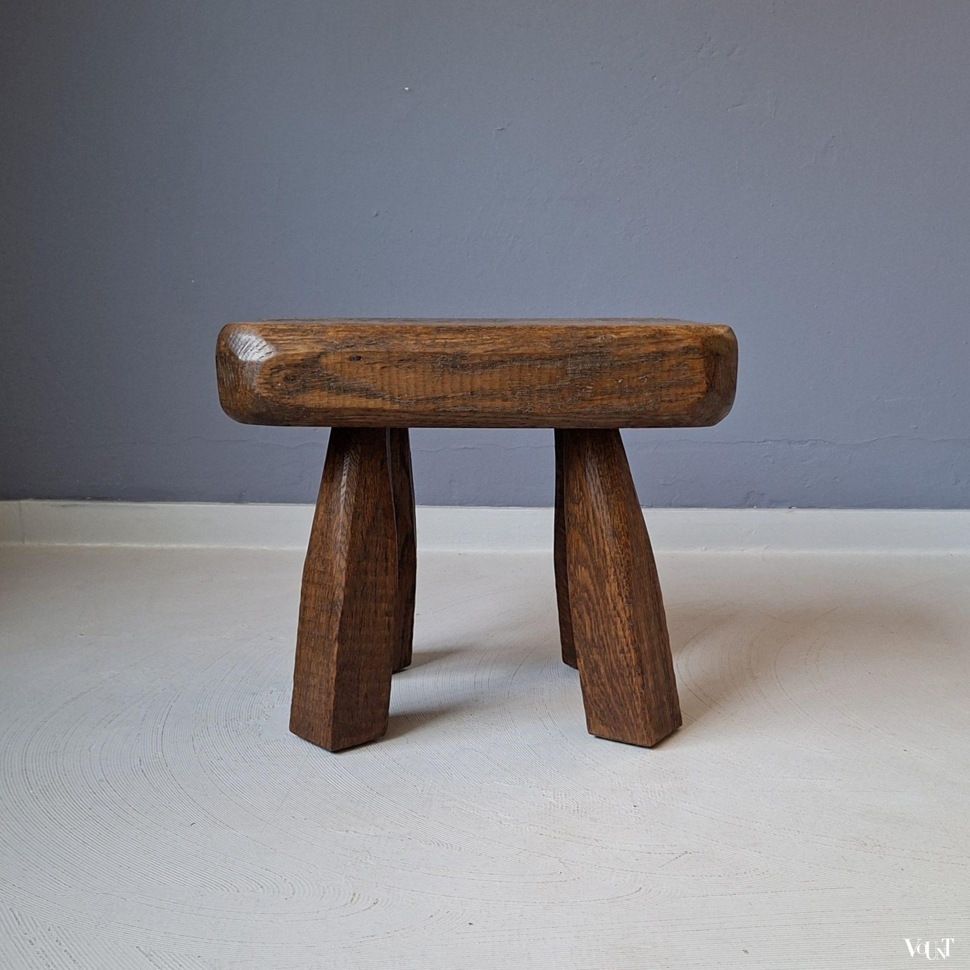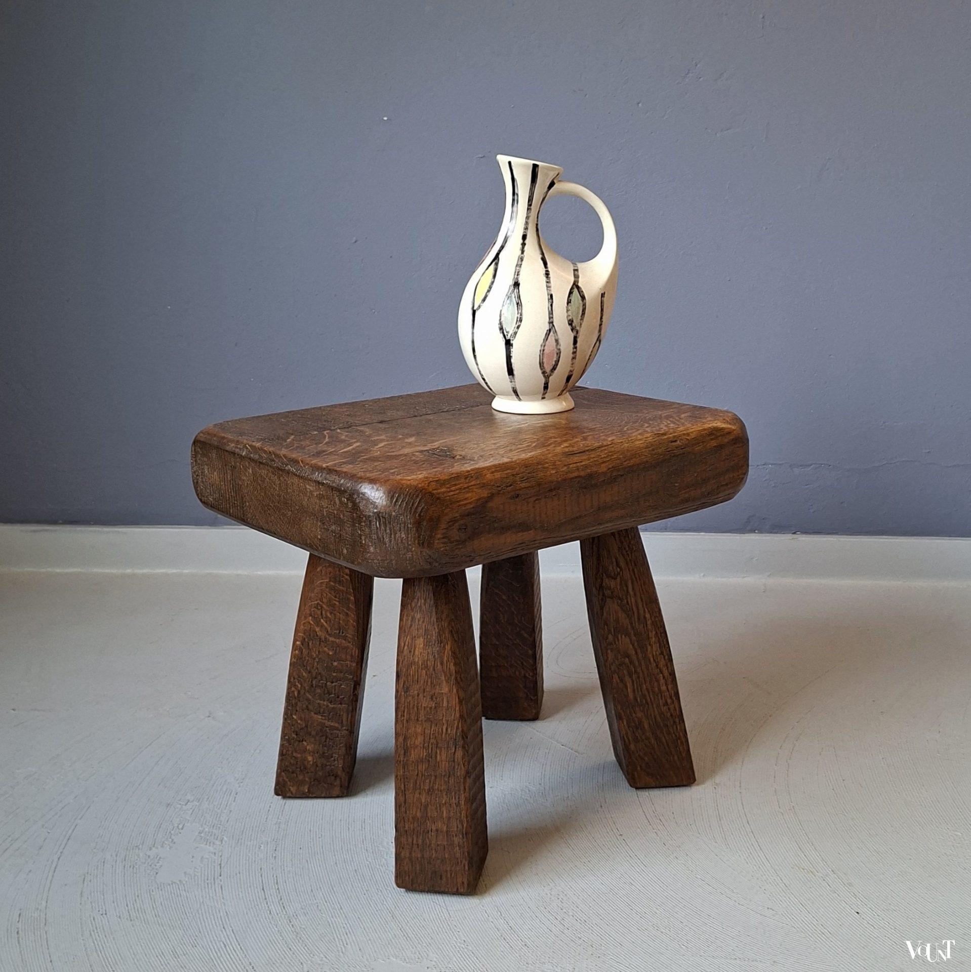 Dit eikenhouten, grof vormgegeven en compacte bijzettafeltje is in goede conditie. Brutalist-stijl. Gewicht: 6,5 kg.