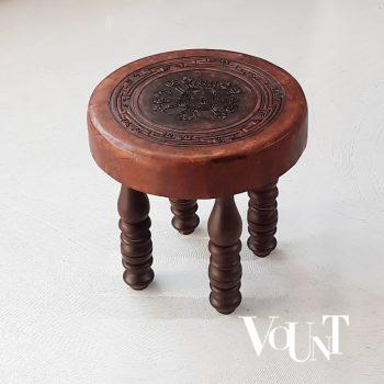 Dit brutalist Spaanse krukje uit de jaren ’60 bestaat uit een houten frame en een dikke leren zitting. In goede conditie. Voor de leeftijd normale gebruikssporen.