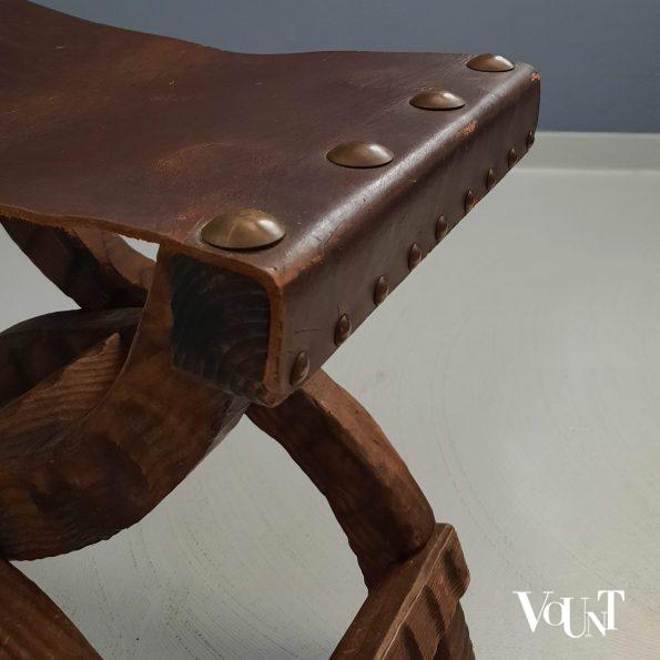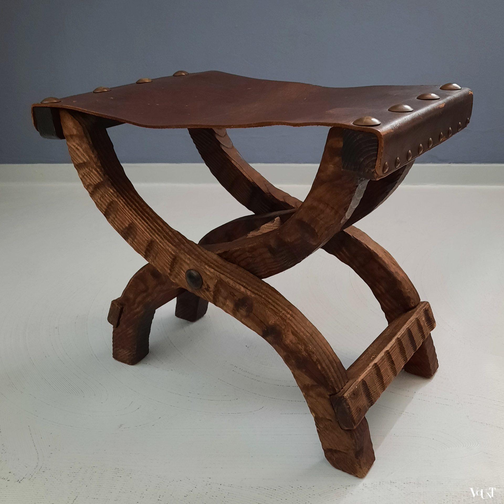 Dit brutalist Spaanse krukje uit de jaren ’60 bestaat uit een houten frame en een dikke leren zitting. In goede conditie. Voor de leeftijd normale gebruikssporen.