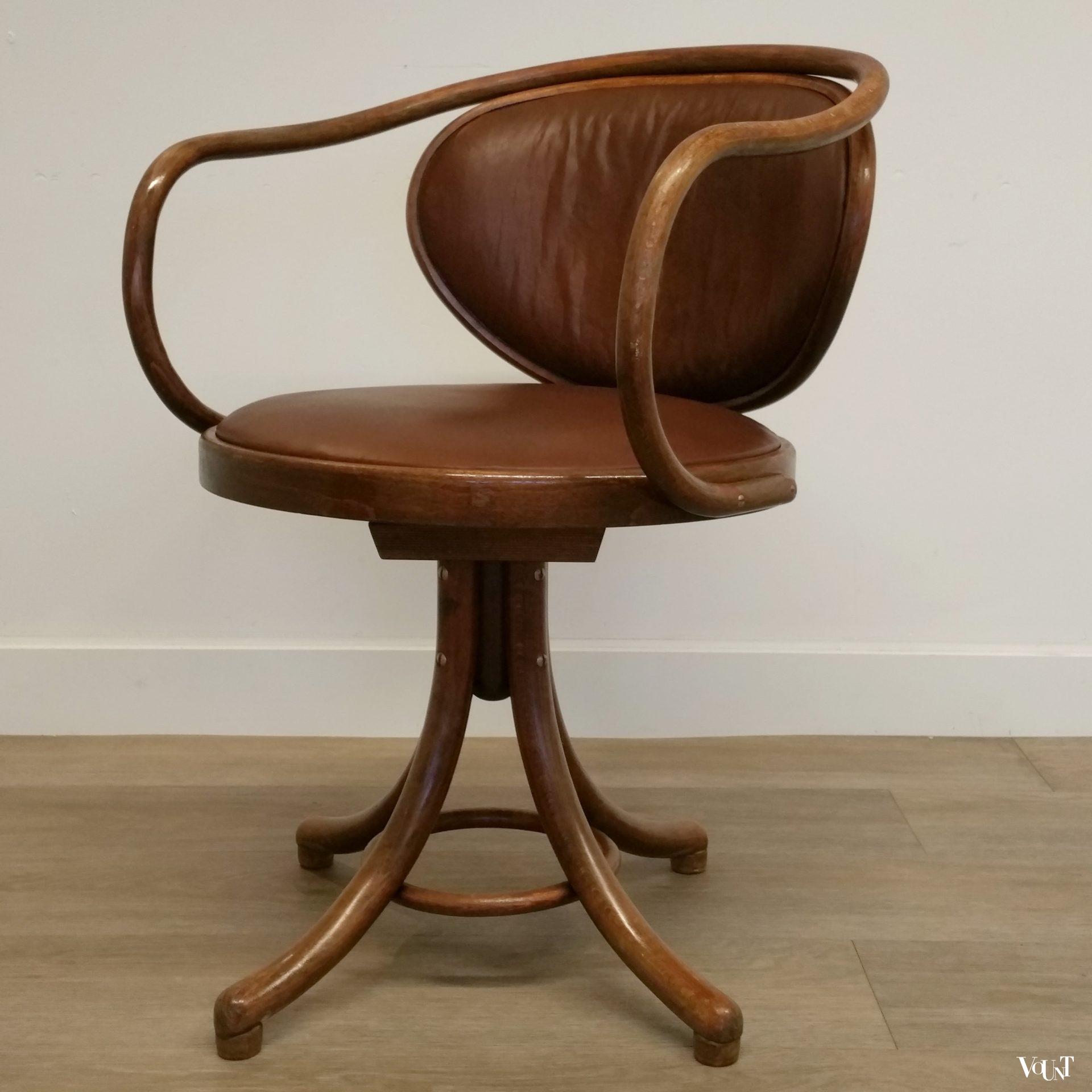 Deze bureaustoel / draaistoel bestaat uit een bruin houten (bentwood) frame en een met (echt, nieuw) leer beklede zitting en rugleuning. Het ontwerp van deze stoel is van Thonet en dateert uit 1866. Deze stoel heeft onder de zitting een sticker van TON. In 1953 werd Thonet in voormalig Tsjecho-Slowakije onder de naam TON voortgezet. In goede conditie.