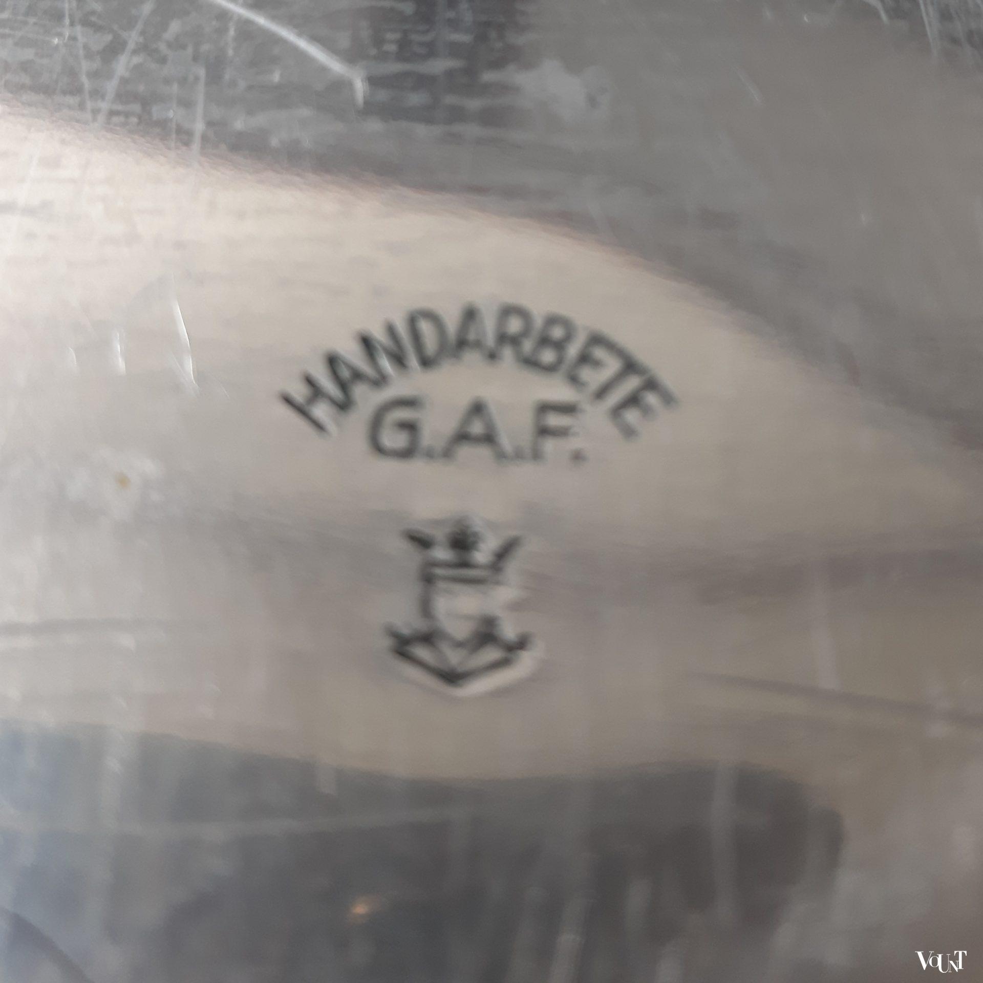 Dit Zweedse jaren ’50 dienblad met een tegelplateau van 3 met de hand beschilderde tegels met vissen is aan de rechterzijde gesigneerd J.Y. en aan de onderzijde gemerkt Handarbete G.A.F. Messing sierrand. In goede conditie.