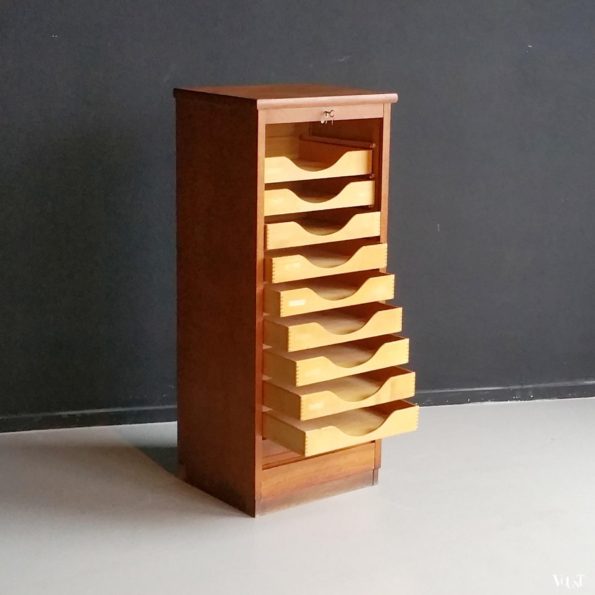 In goede staat verkerende eikenhouten roffeldeurkast met 9 lades. Aan de achterzijde van de kast zit bovenaan een klein gat, waarschijnlijk is dit ooit aangebracht om een snoer doorheen te leiden. Uiteraard niet zichtbaar als de kast tegen een muur staat. Etiketsporen op de lades. Sleutel aanwezig. Roffeldeur loopt soepel.