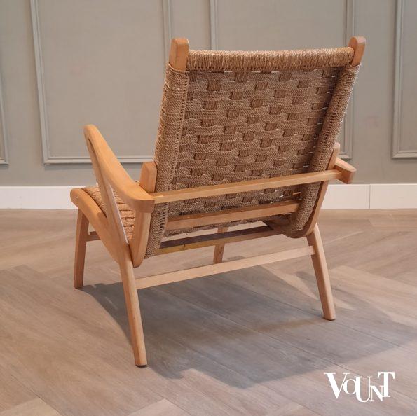 Deze fauteuil bestaat uit een houten frame dat met touw is bekleed en dateert uit de jaren ’40 / ’50. Hout en touw (geen breuken o.i.d.) zijn in goede conditie.