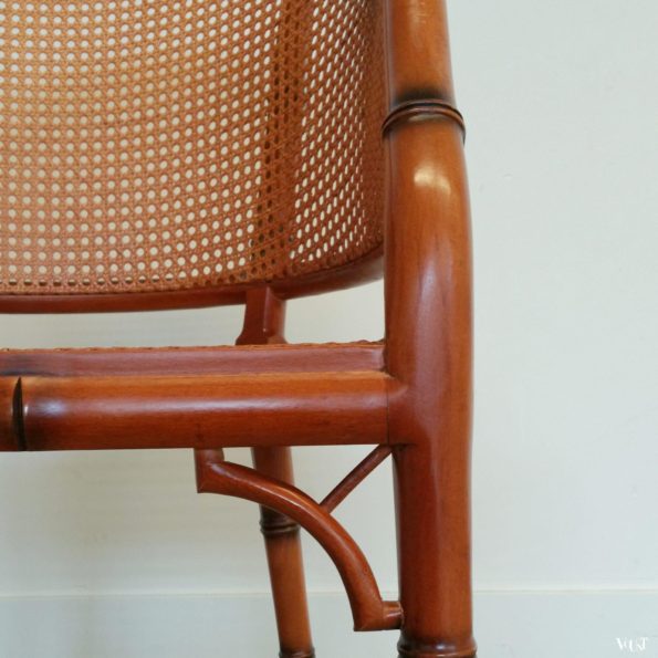 Faux bamboo fauteuil gecombineerd met rotan. Trend uit vooral de jaren ’70 die ook nu weer in opkomst is. Kan zowel met als zonder kussen gebruikt worden (kussen inclusief). Het hout en het rotan zijn in goede conditie.