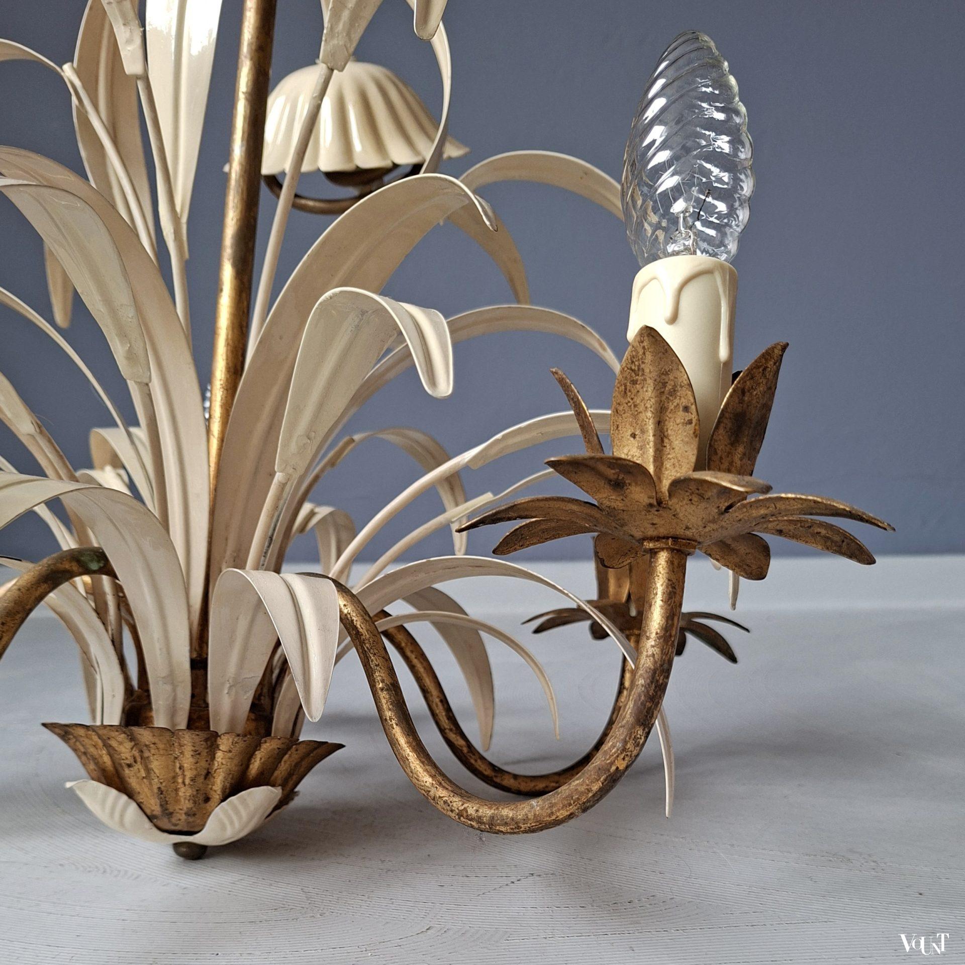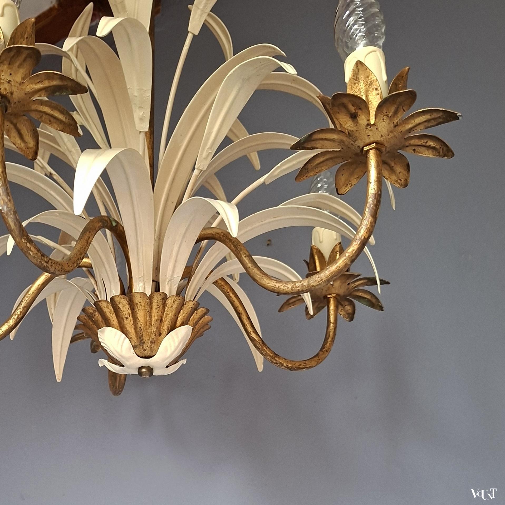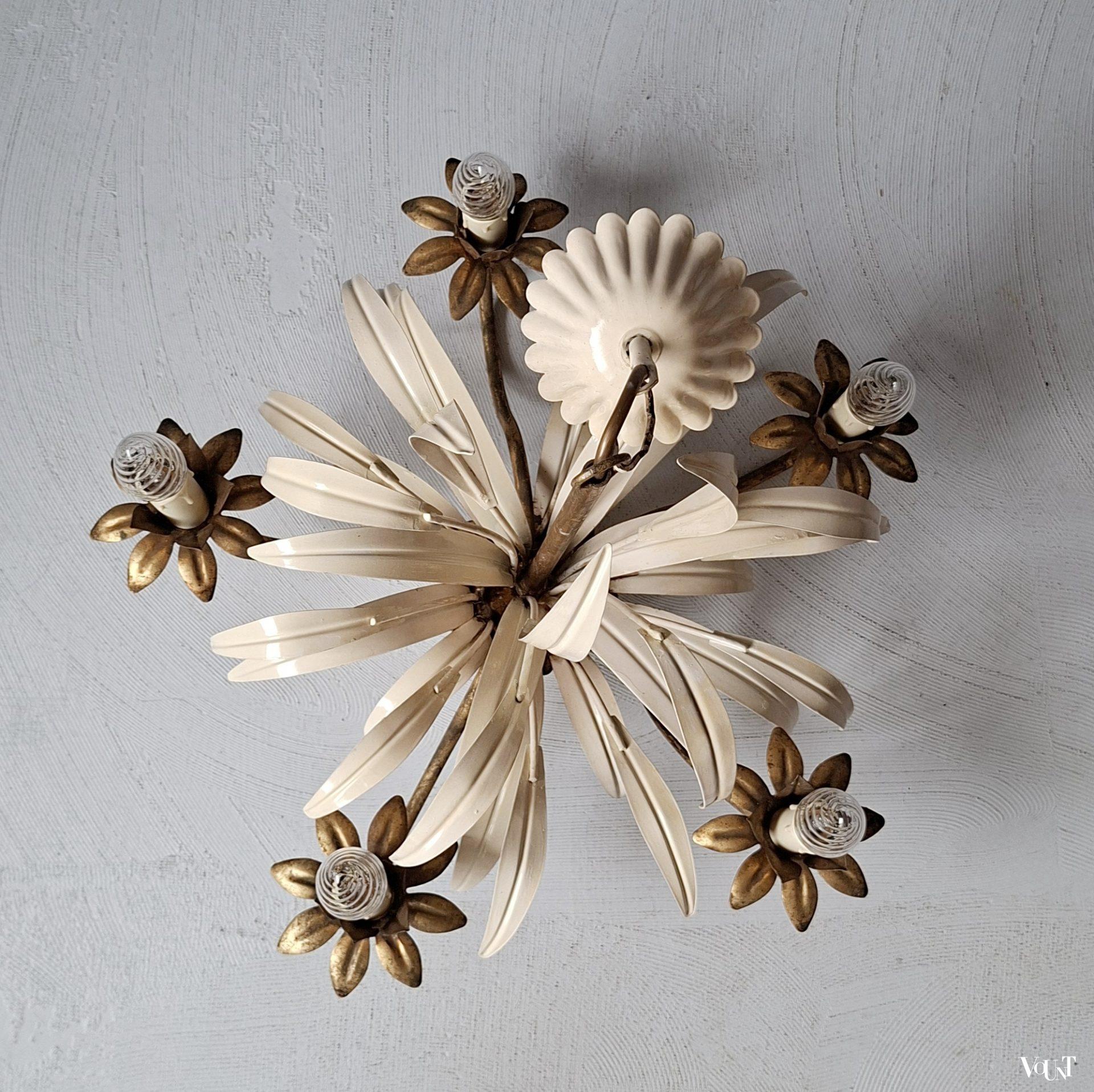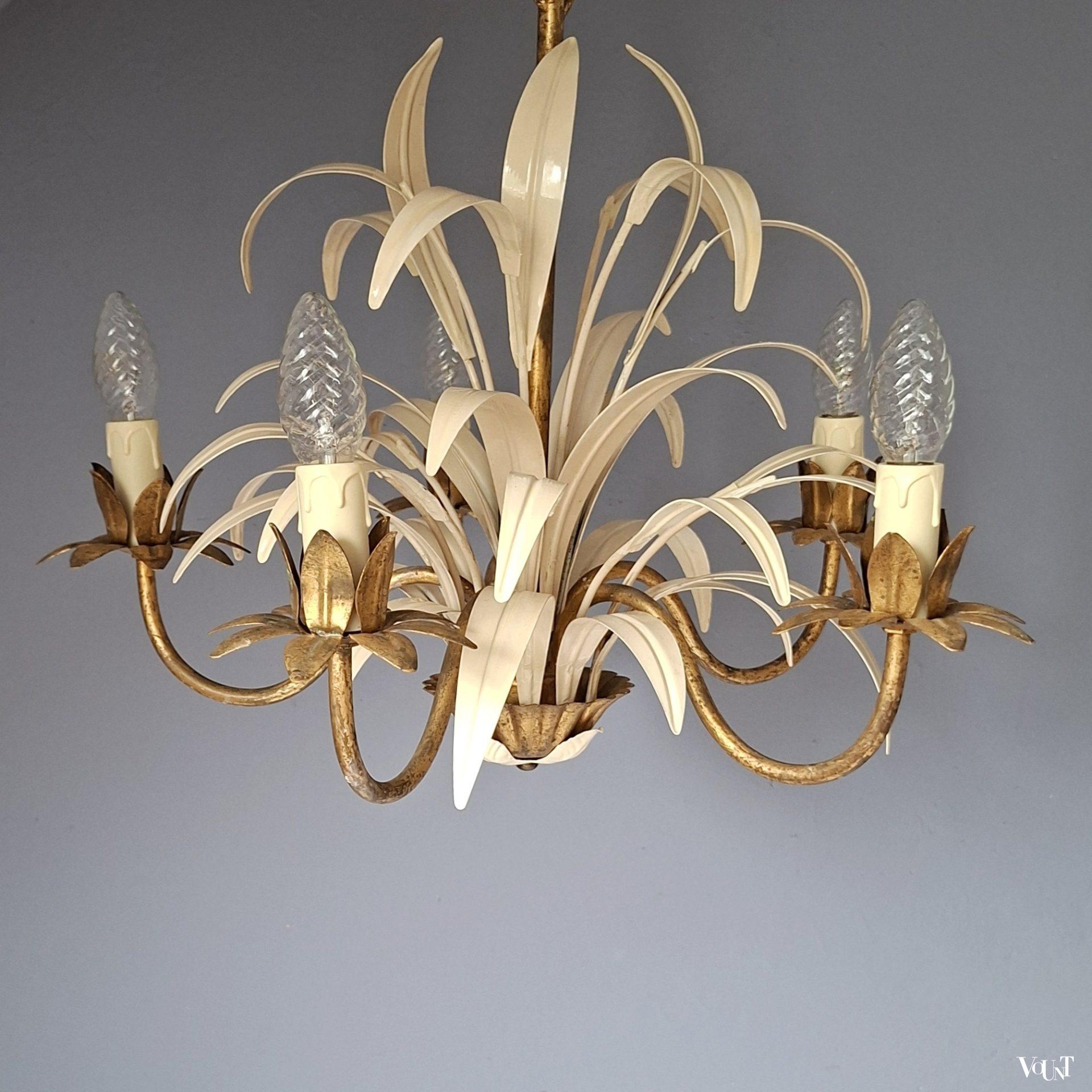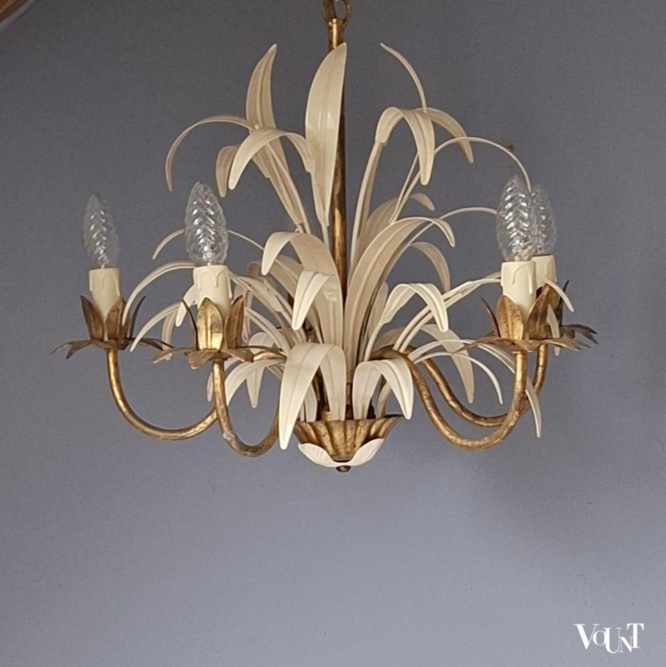 Deze metalen Franse Coco Chanel-stijl hanglamp uit de jaren ’60 heeft 2 kleuren: goud en creme. 5 lichtpunten. De lamp is in goede, werkende conditie.