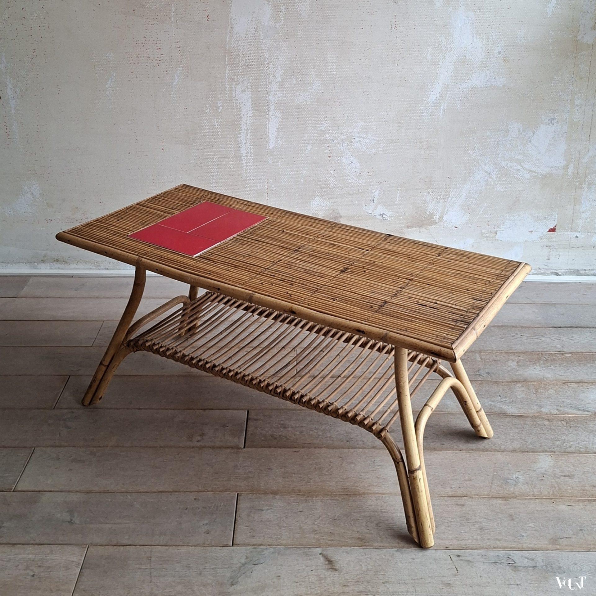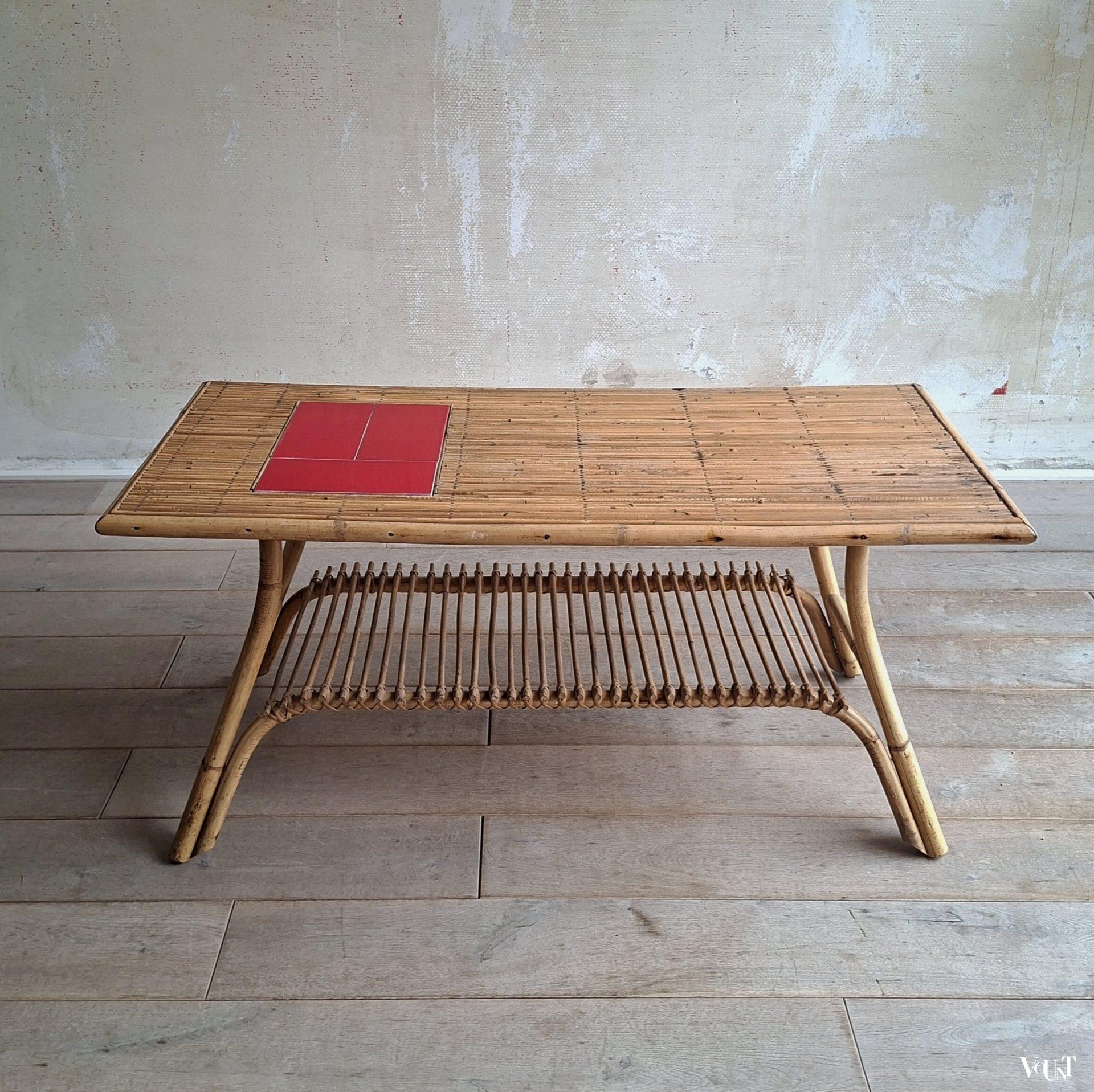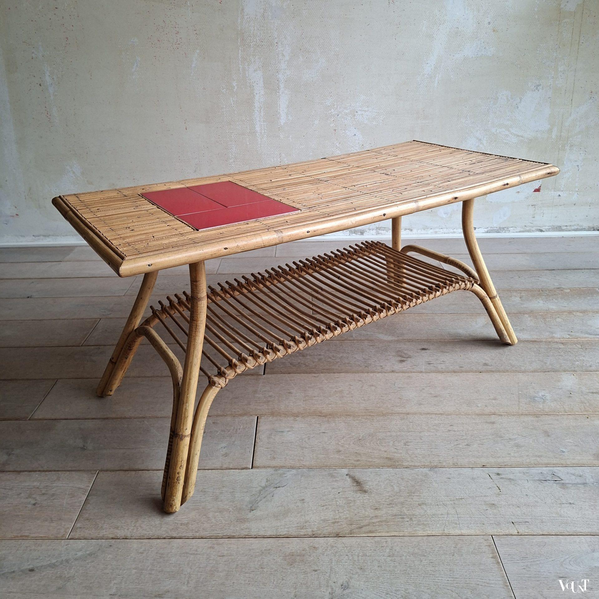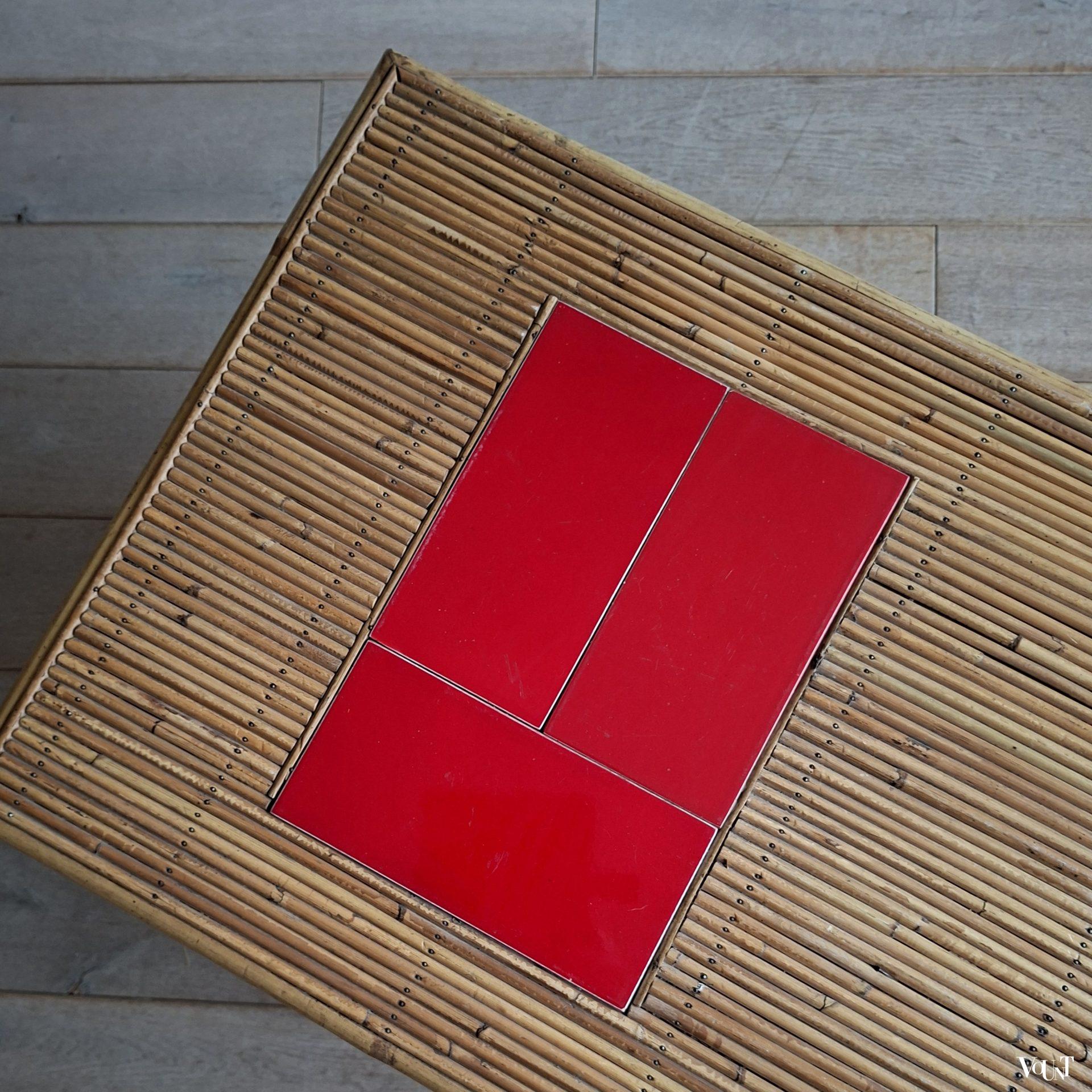 Deze tafel wordt vaak toegeschreven aan het Franse designersduo Audoux & Minnet. Of het ontwerp daadwerkelijk van hun hand is, kunnen wij niet bevestigen. Wel zal er een relatie zijn met de Franse plaats Vallauris* vanwege de keramiek die in deze tafels toegepast is. De tegels van deze tafel zijn egaal rood, maar je komt identieke tafels tegen met dezelfde rode of ook gele tegels gecombineerd met een designtegel/designtegels.