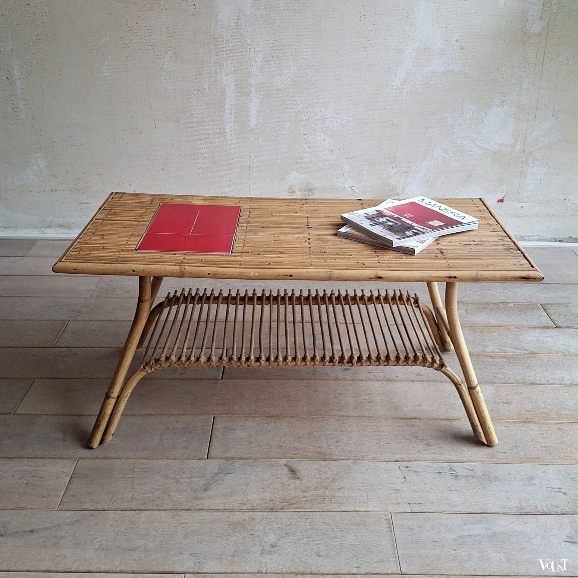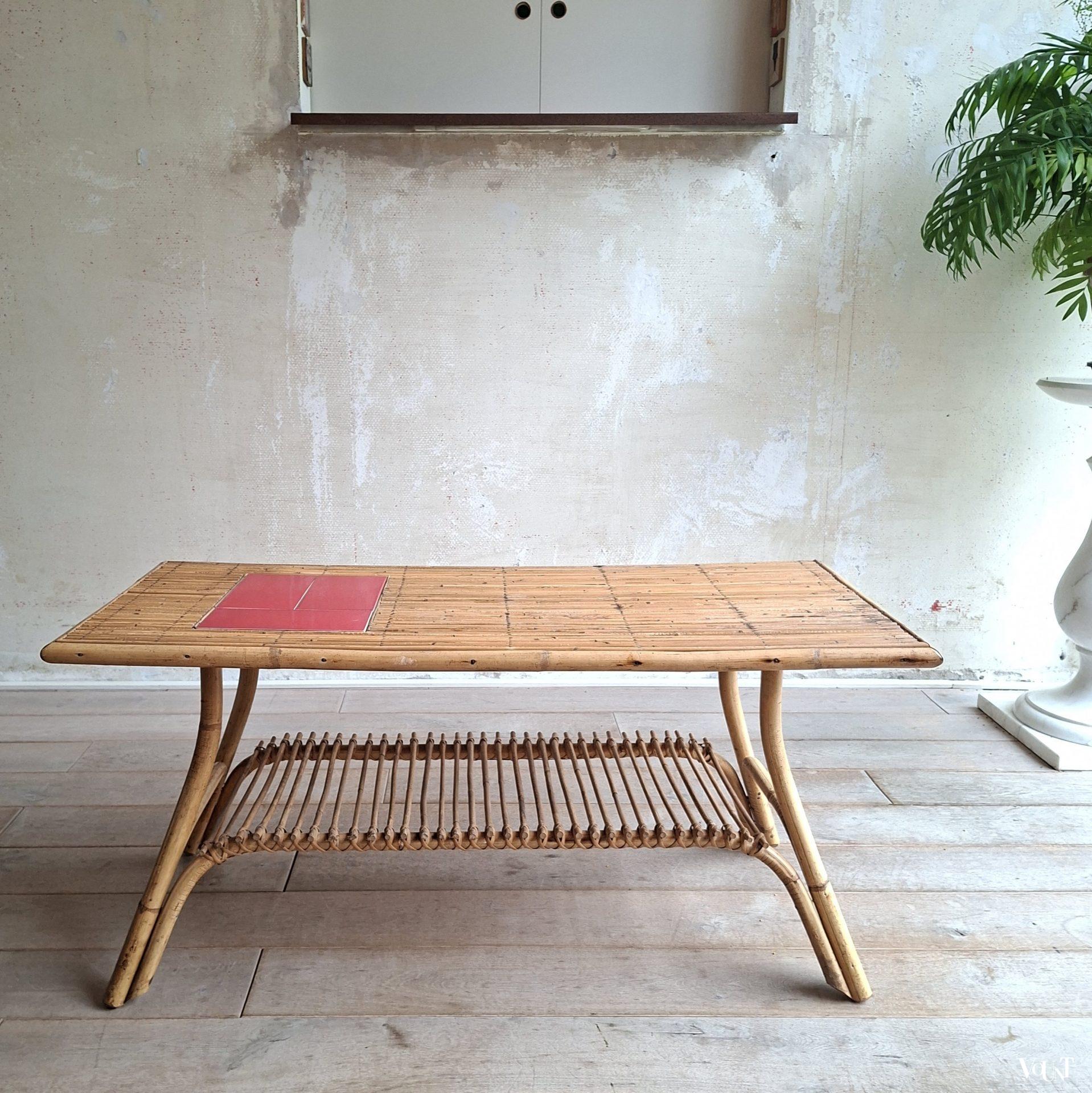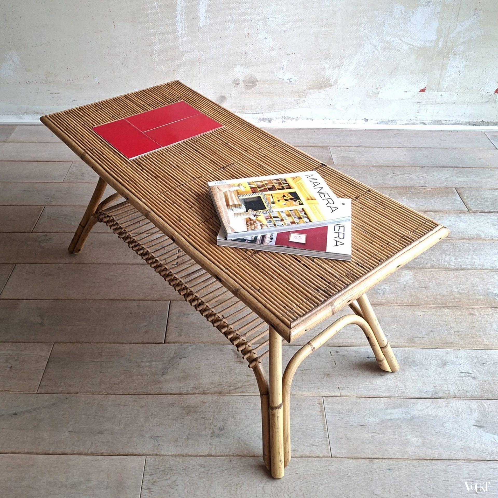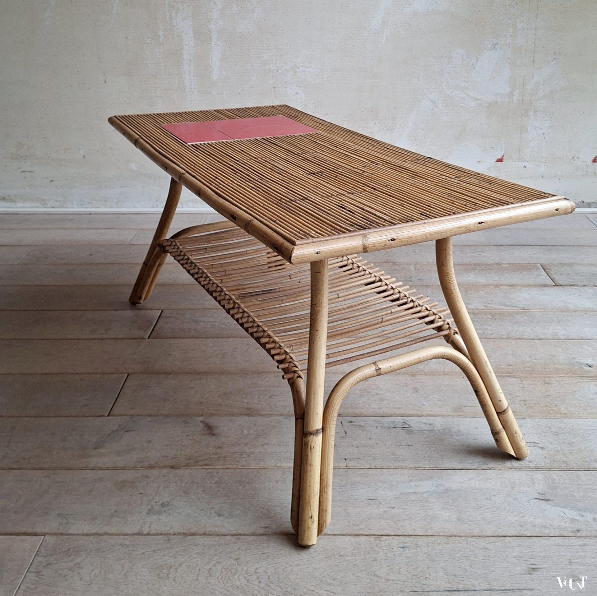 Deze tafel wordt vaak toegeschreven aan het Franse designersduo Audoux & Minnet. Of het ontwerp daadwerkelijk van hun hand is, kunnen wij niet bevestigen. Wel zal er een relatie zijn met de Franse plaats Vallauris* vanwege de keramiek die in deze tafels toegepast is. De tegels van deze tafel zijn egaal rood, maar je komt identieke tafels tegen met dezelfde rode of ook gele tegels gecombineerd met een designtegel/designtegels.