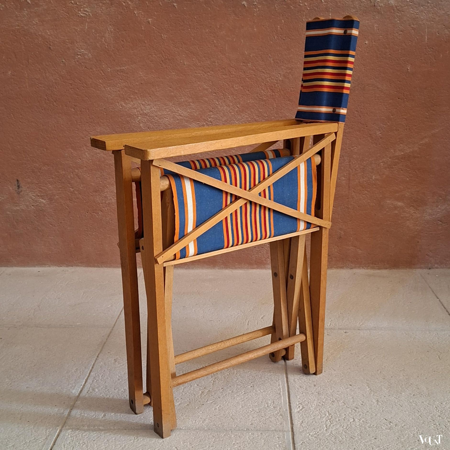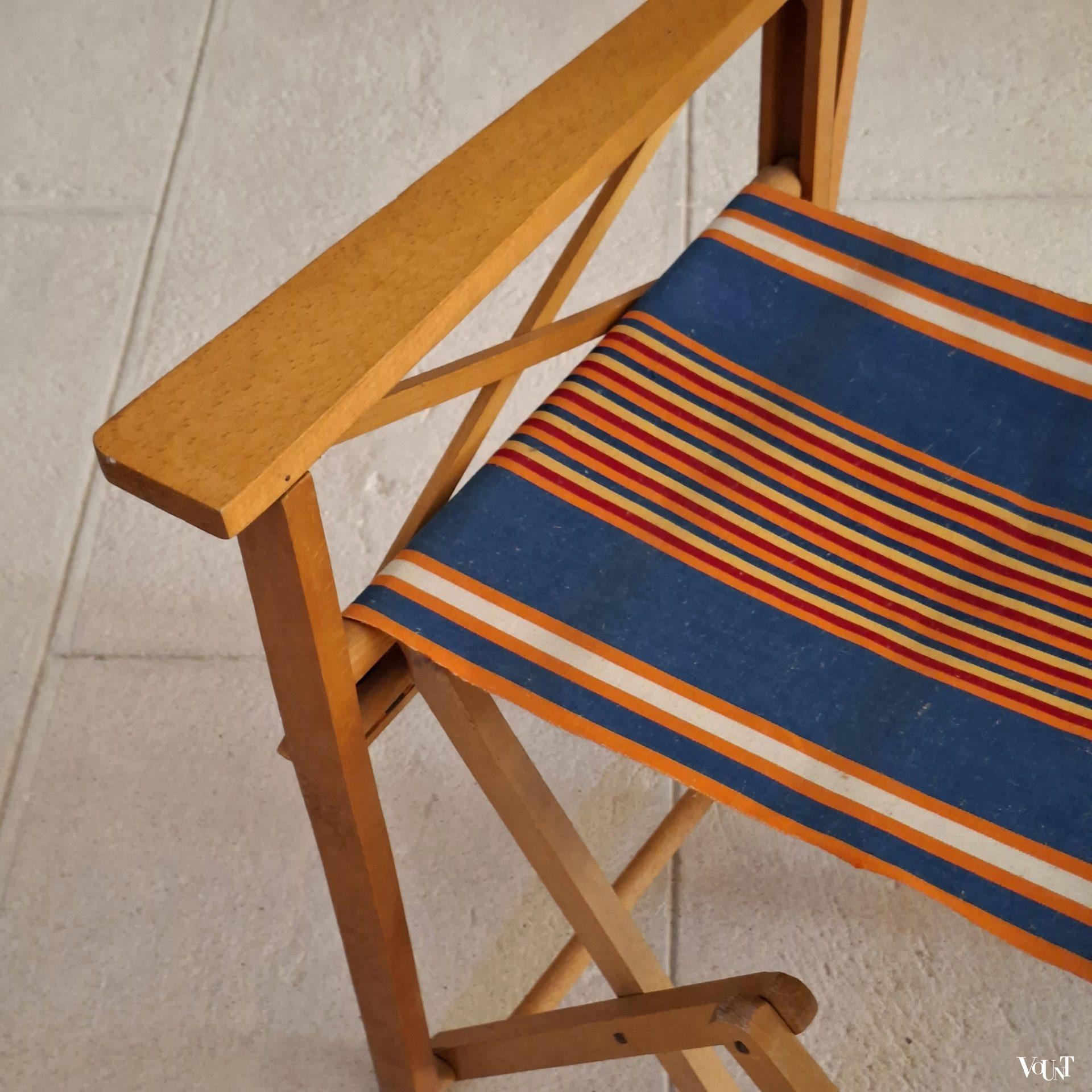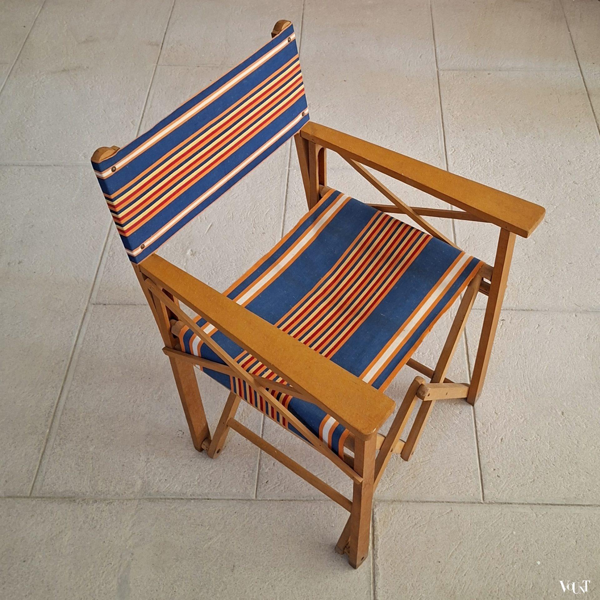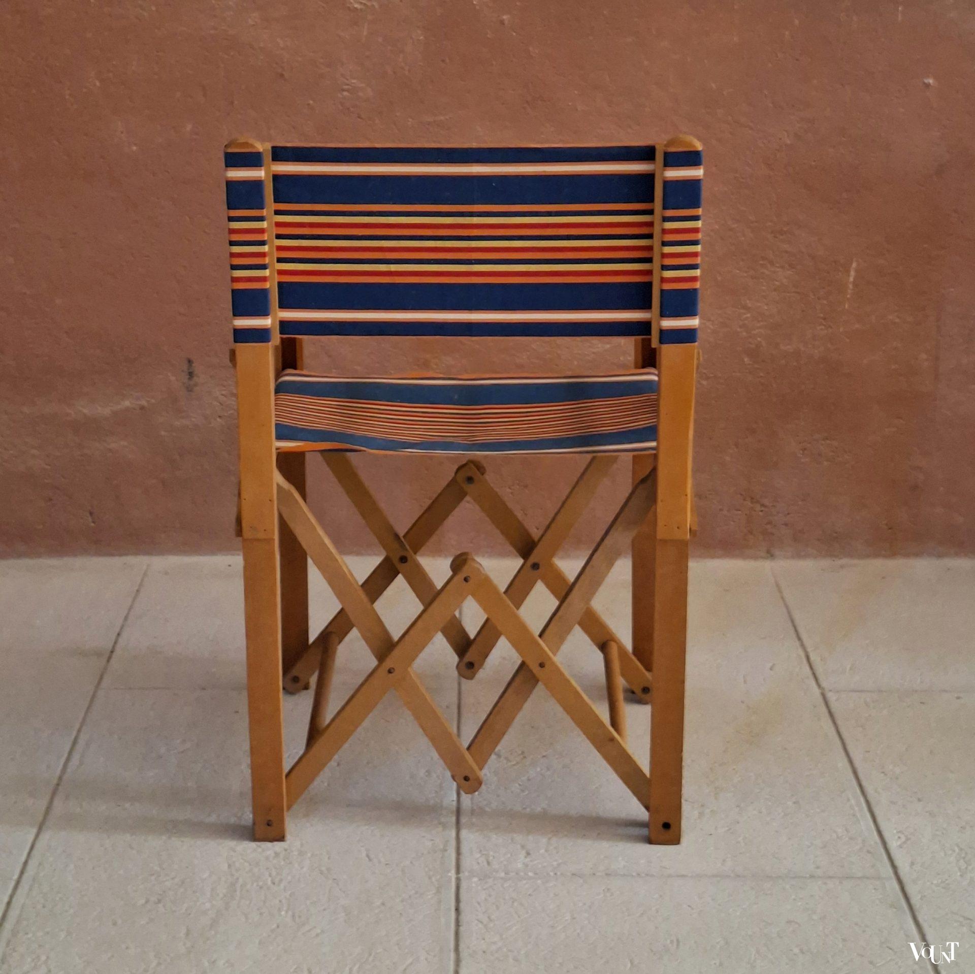 Bijzonder exemplaar, deze Franse regisseursstoel/klapstoel, vanwege de harmonicaverbinding van de poten. Bauhaus-stijl. De stoel is bekleed met een stevige gestreepte canvas stof. In heel goede conditie. Lichte sporen van ouderdom en gebruik. Stevig. Datering: ca. jaren ’50.