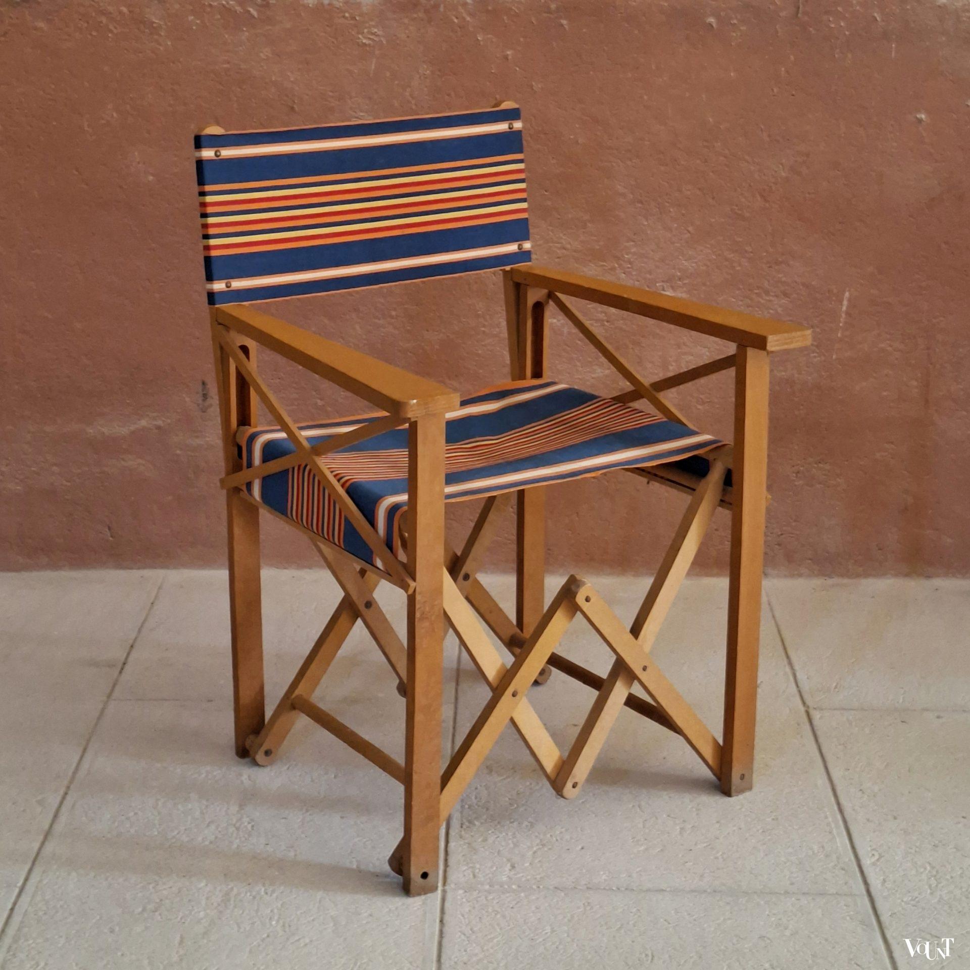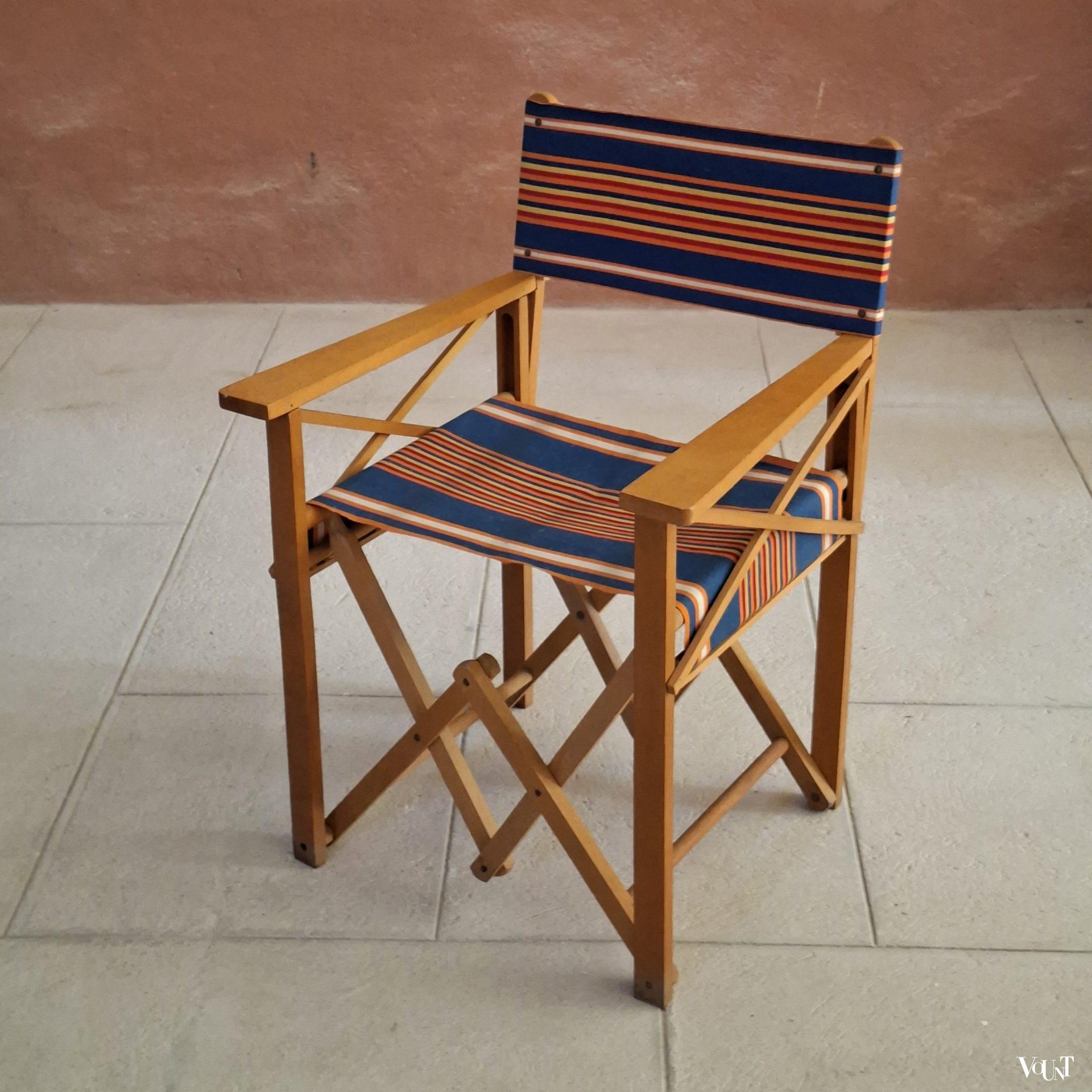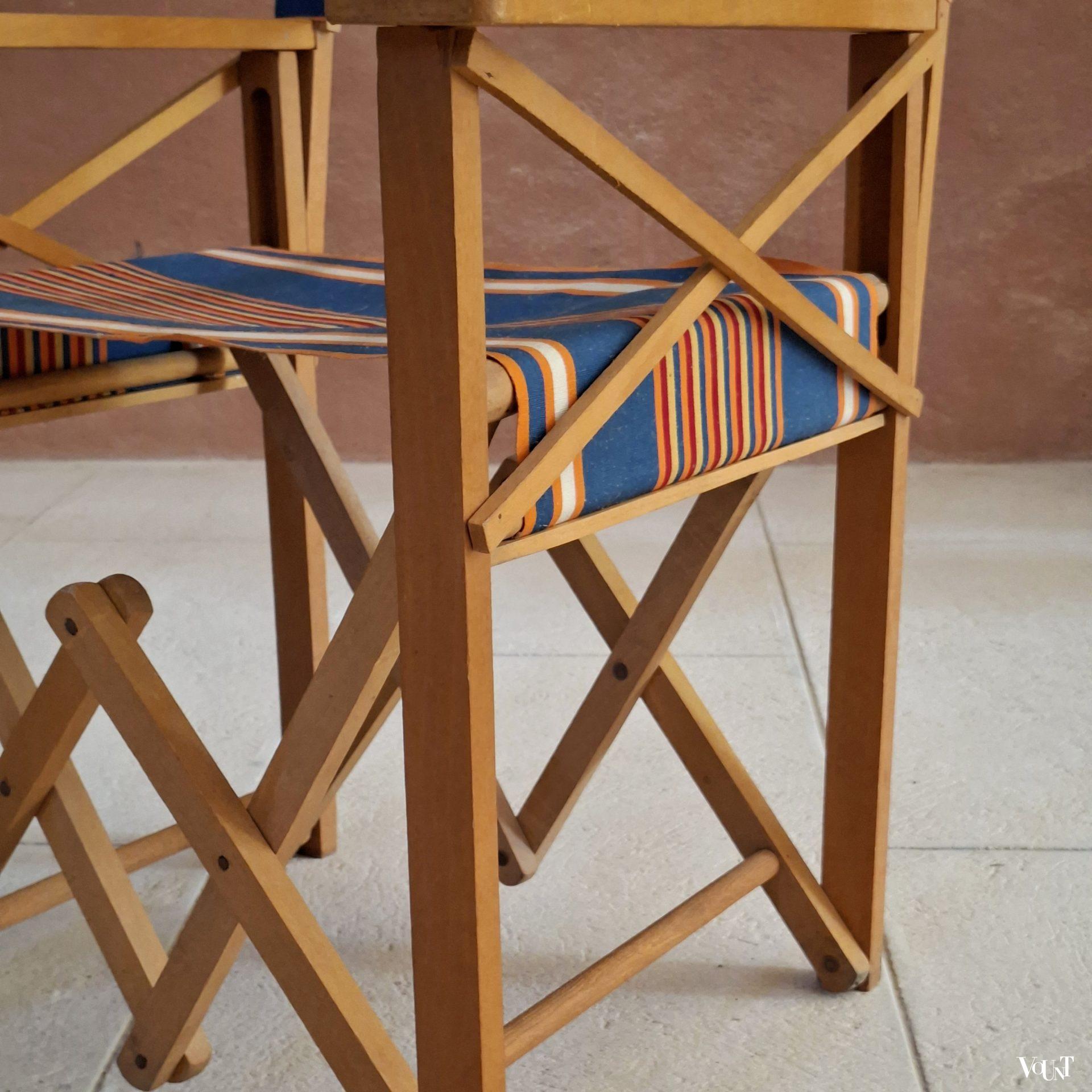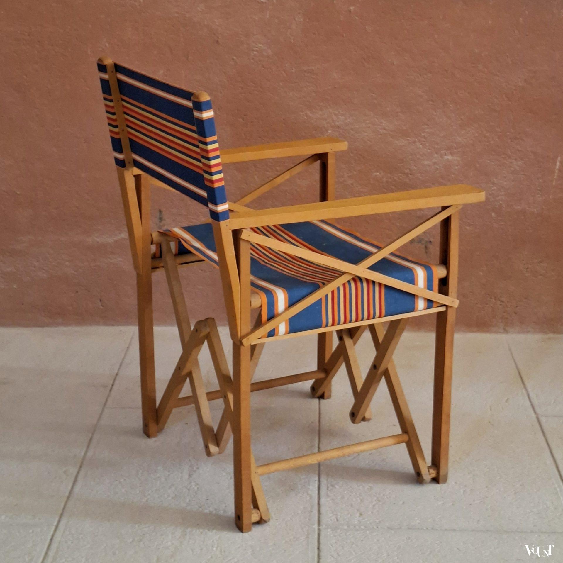 Bijzonder exemplaar, deze Franse regisseursstoel/klapstoel, vanwege de harmonicaverbinding van de poten. Bauhaus-stijl. De stoel is bekleed met een stevige gestreepte canvas stof. In heel goede conditie. Lichte sporen van ouderdom en gebruik. Stevig. Datering: ca. jaren ’50.