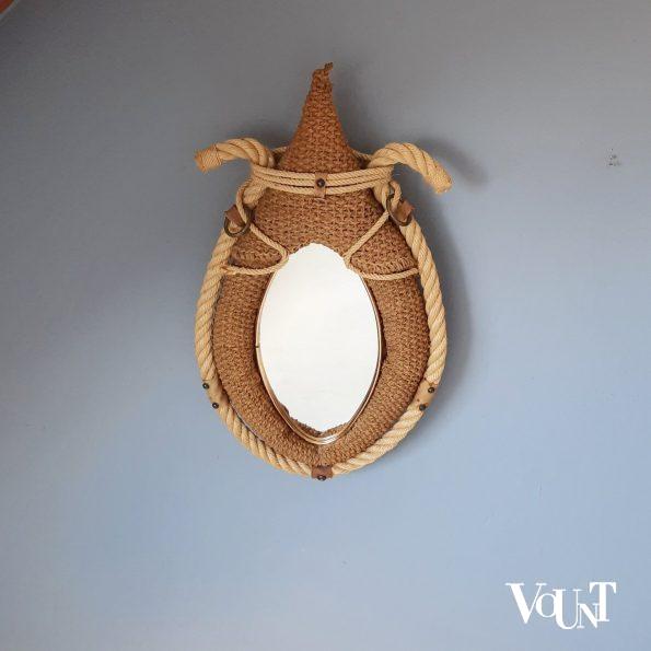 Het ontwerp/deze combinatie van een gareel van touw met daarin een spiegel wordt vaak toegeschreven aan het Franse designersduo Adrien Audoux & Frida Minnet. Jaren ’50/’60. Past weer helemaal in de trend van natuurlijke materialen. Decoratief item. In goede conditie. Aan achterzijde voorzien van een ring om deze op te hangen.