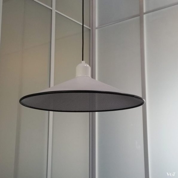Deze mooie strakke hanglamp is nog in perfecte staat. Waarschijnlijk is deze van het Belgische merk Massive Luminaires (tegenwoordig Philips). De grote witte kap bestaat uit geperforeerd metaal dat met een stevige zwarte rubberen rand is afgewerkt. In werkende staat. Nauwelijks gebruikssporen.