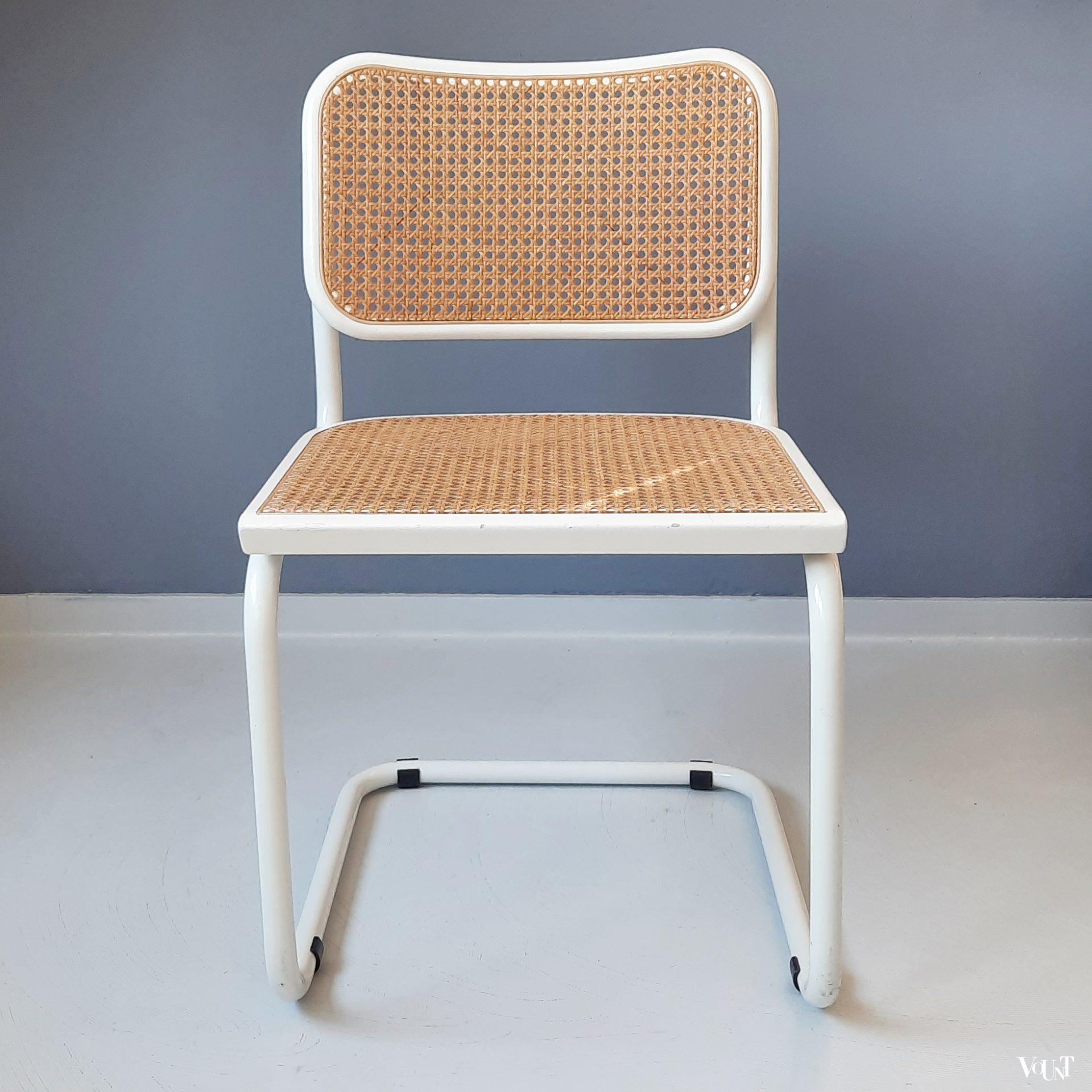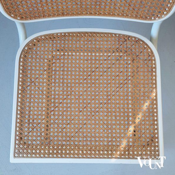 Deze stoel is in de jaren ’80/’90 in Italië geproduceerd. Gemerkt met sticker en in het hout “Made in Italy”. De uitvoering in wit of zwart is kenmerkend voor die jaren. Buisstalen stoelframe, zitting en rugleuning wit gespoten hout en rotan webbing. Kwalitatief goede stoel. In originele, maar goede staat. Voor de leeftijd normale gebruikssporen.