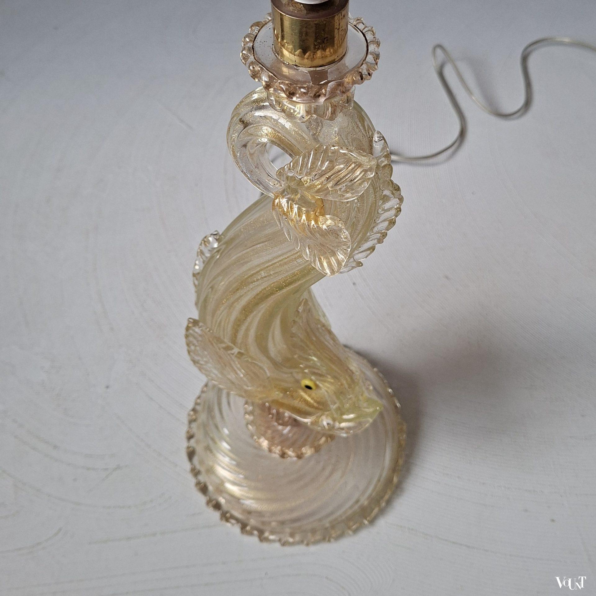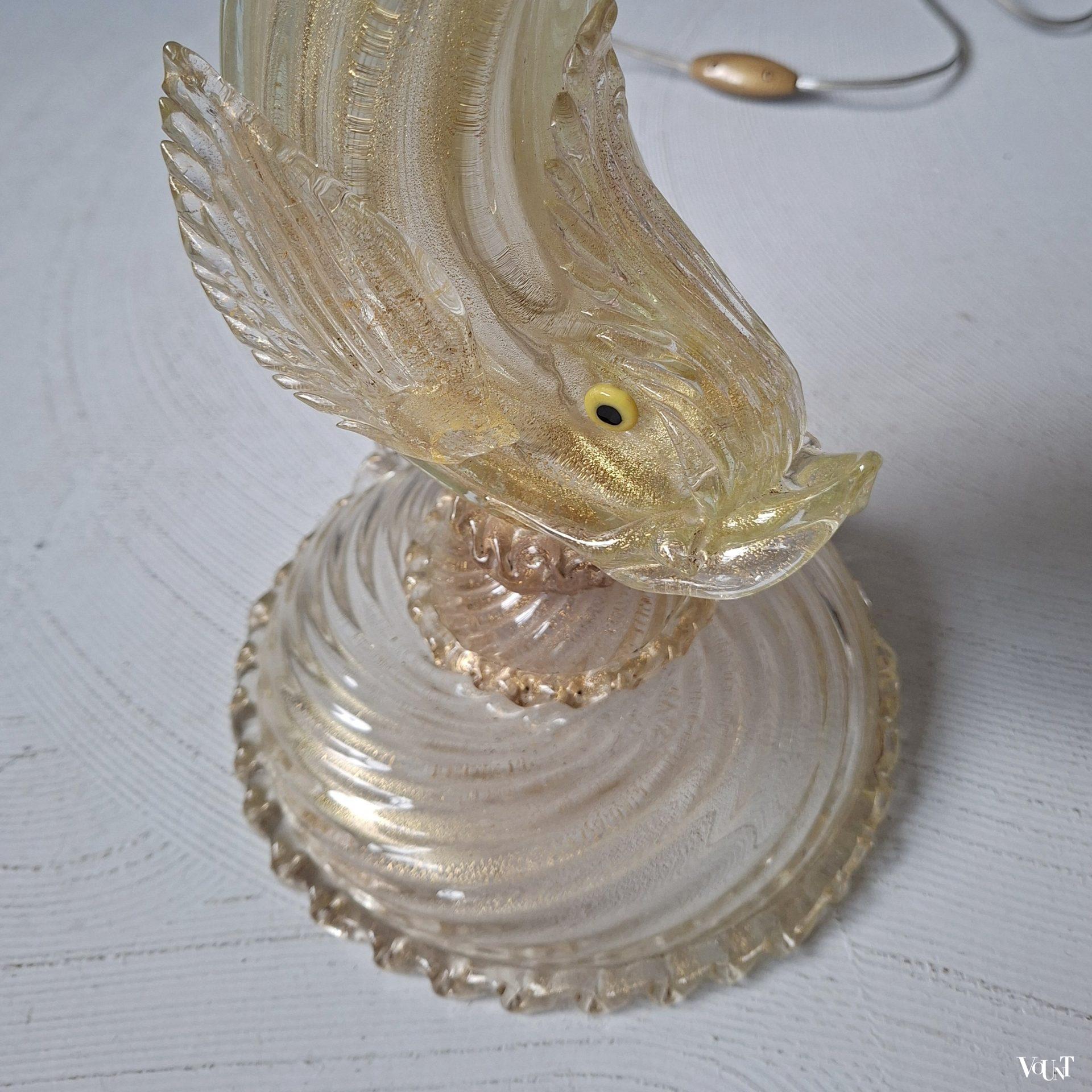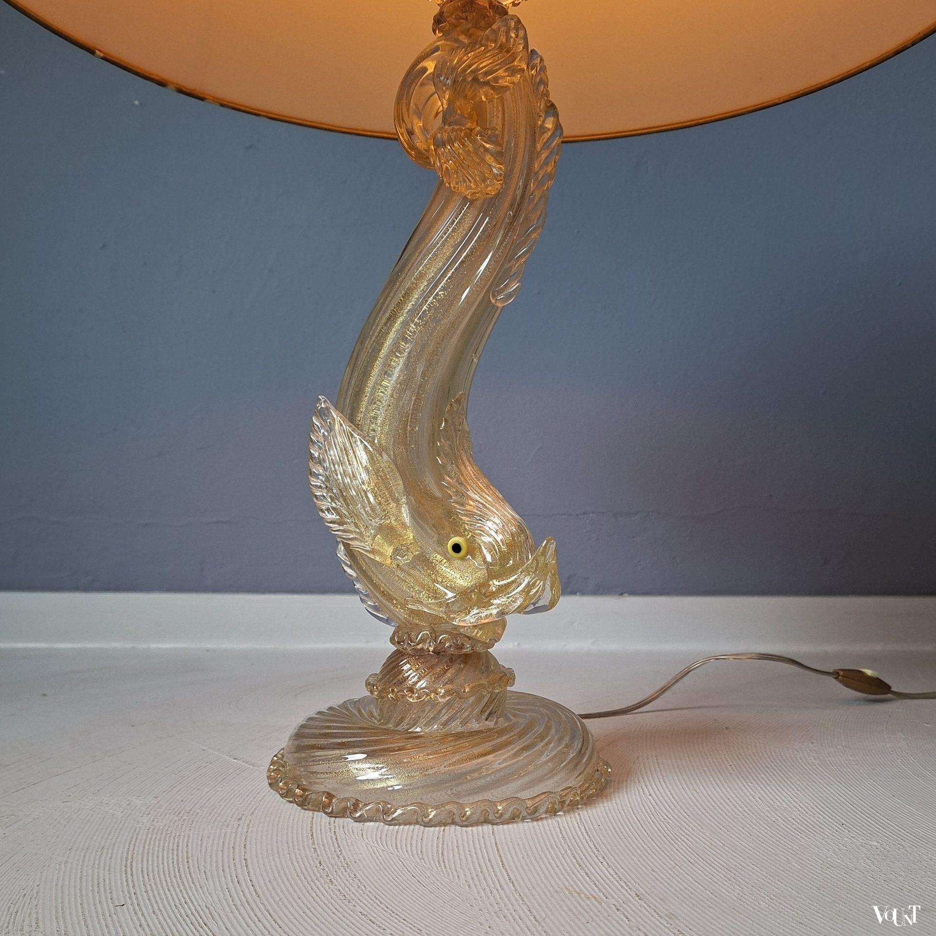Deze tafellamp in de vorm van een dolfijn van Murano-glas dateert uit de jaren ’60  en is in goede conditie: werkend, en geen chips of iets dergelijks. Het glas heeft goudaccenten. Aan de onderzijde voorzien van een “gootje” voor het snoer. Bedrading onlangs vervangen. De kaphouder is indien gewenst gemakkelijk te verwijderen.