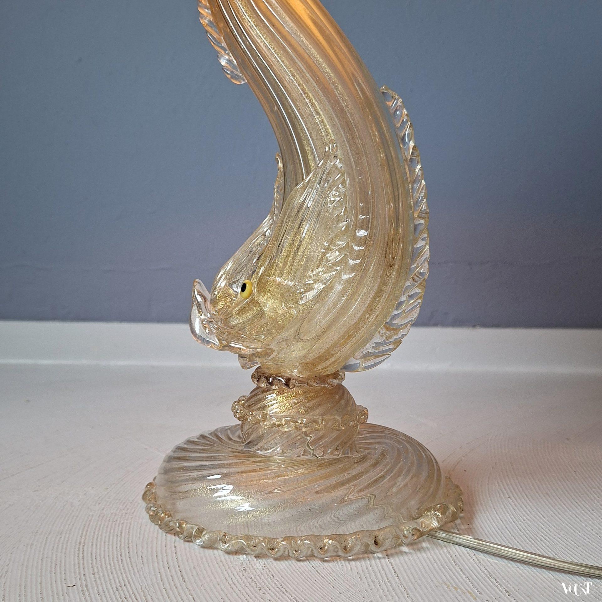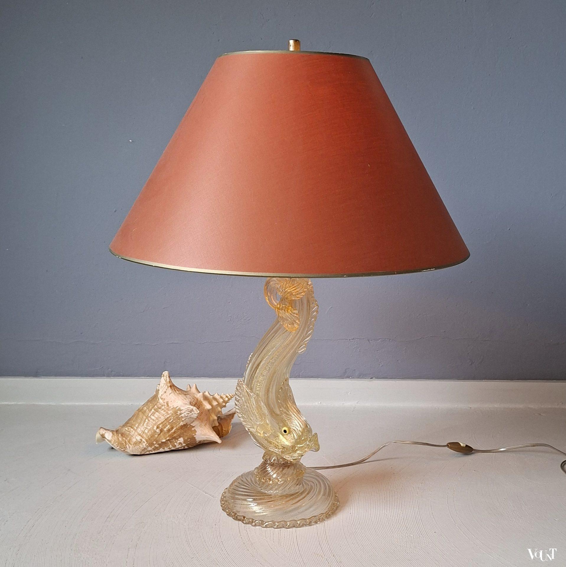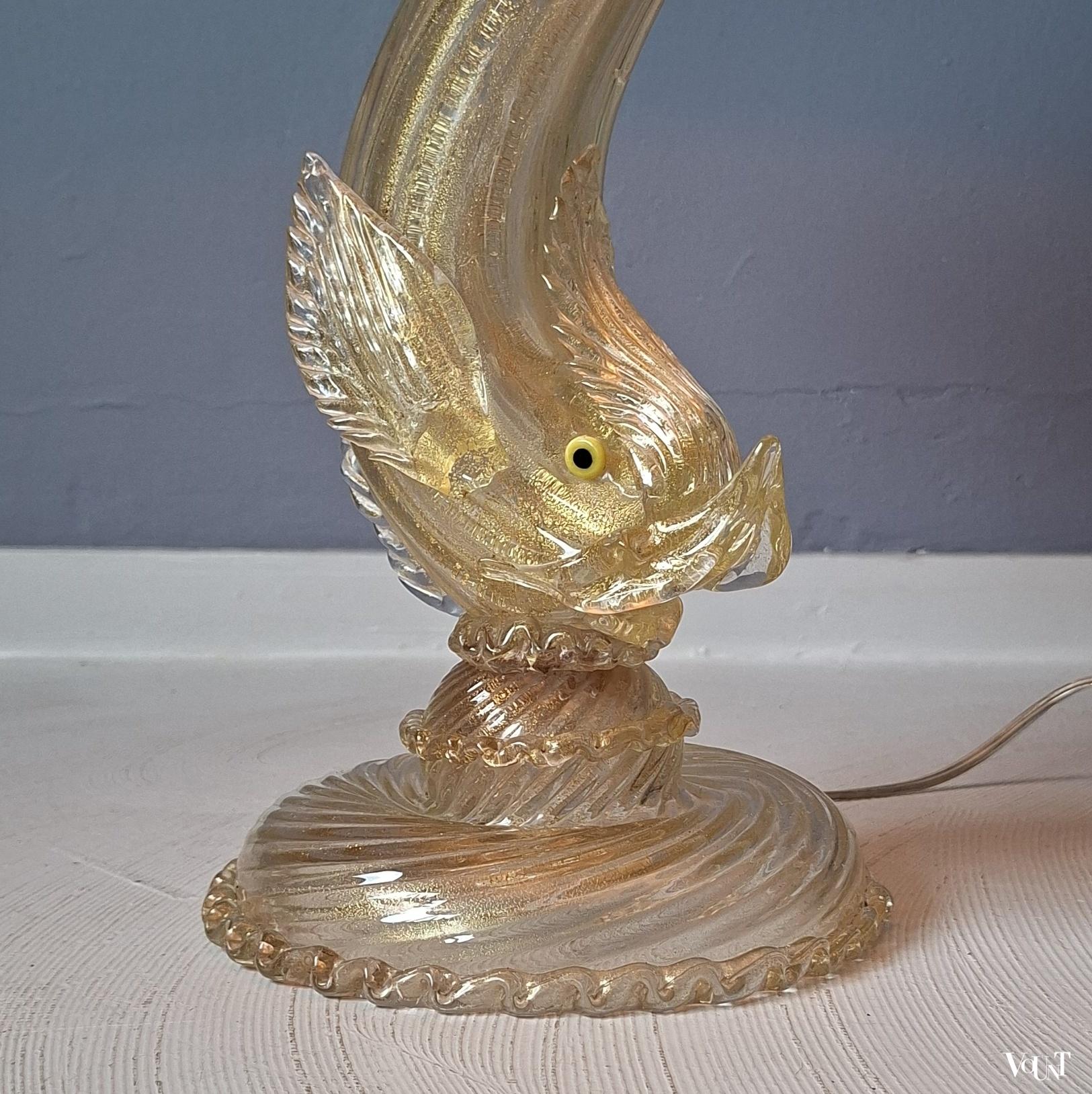 Deze tafellamp in de vorm van een dolfijn van Murano-glas dateert uit de jaren ’60  en is in goede conditie: werkend, en geen chips of iets dergelijks. Het glas heeft goudaccenten. Aan de onderzijde voorzien van een “gootje” voor het snoer. Bedrading onlangs vervangen. De kaphouder is indien gewenst gemakkelijk te verwijderen.