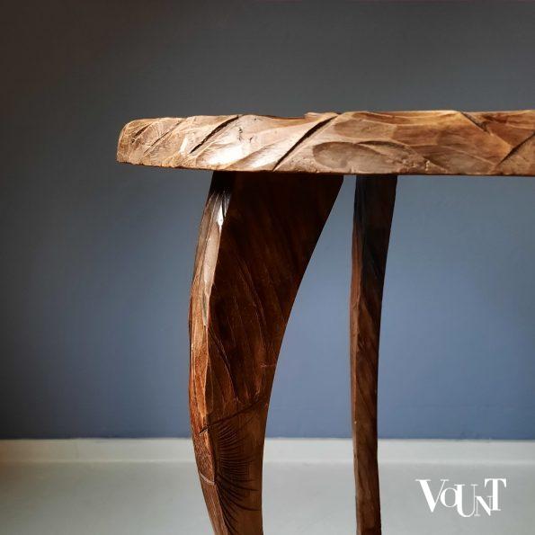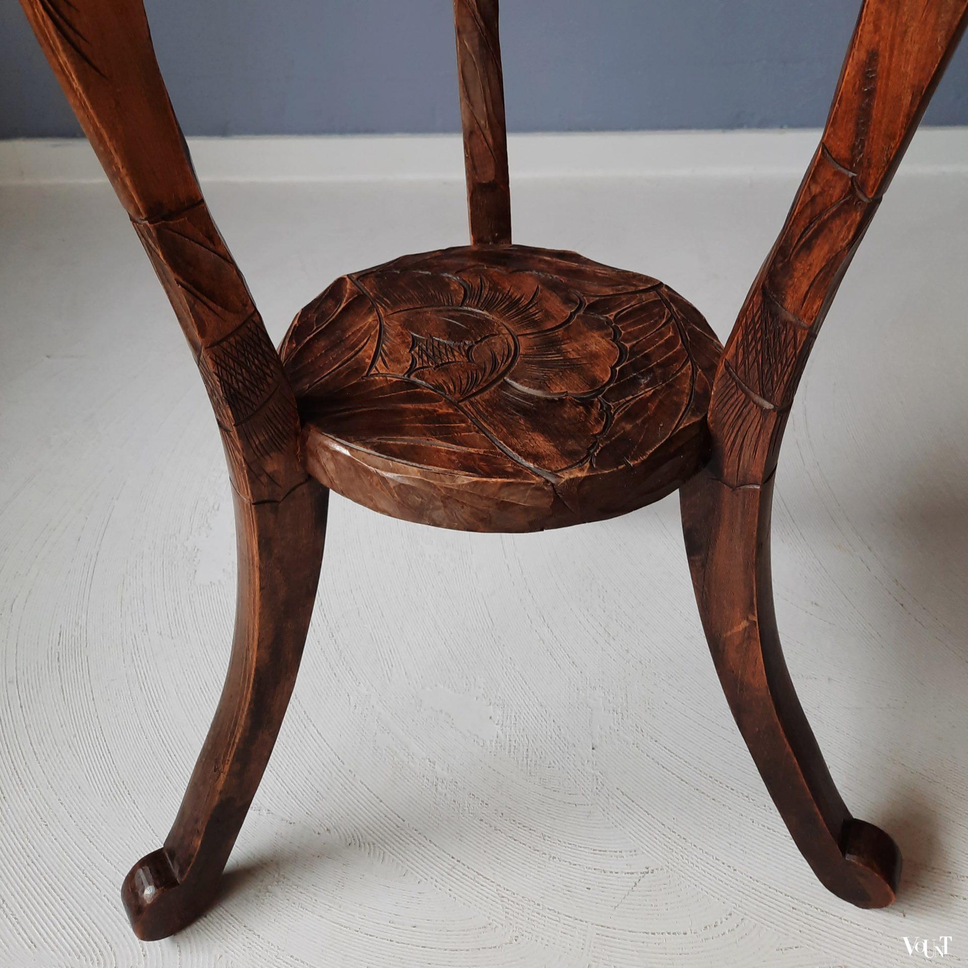 Deze tafel is voorzien van twee bladen met houtsnijwerk in de vorm van bloemen, ook de poten zijn voorzien van decoratie. Dit soort tafels werd rond 1900 door het bekende Engelse warenhuis Liberty’s in Japan besteld. In heel goede conditie.