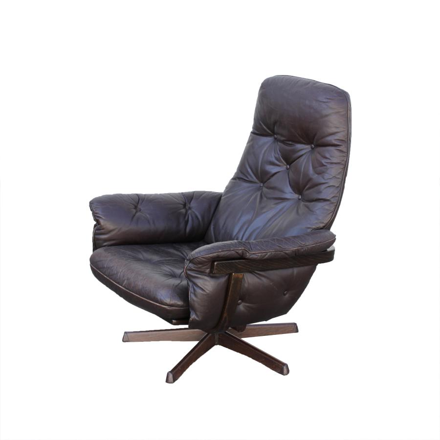 Comfortabele jaren ’70 draaifauteuil van Göte Möbel (Zweden) met verstelbare rugleuning. Het bruine skaileer is in goede staat (geen scheurtjes o.i.d.) en heeft mooi patina. De stoel heeft een houten gebogen frame (lichte gebruikssporen) en staat op een metalen stervoet met houtmotief.