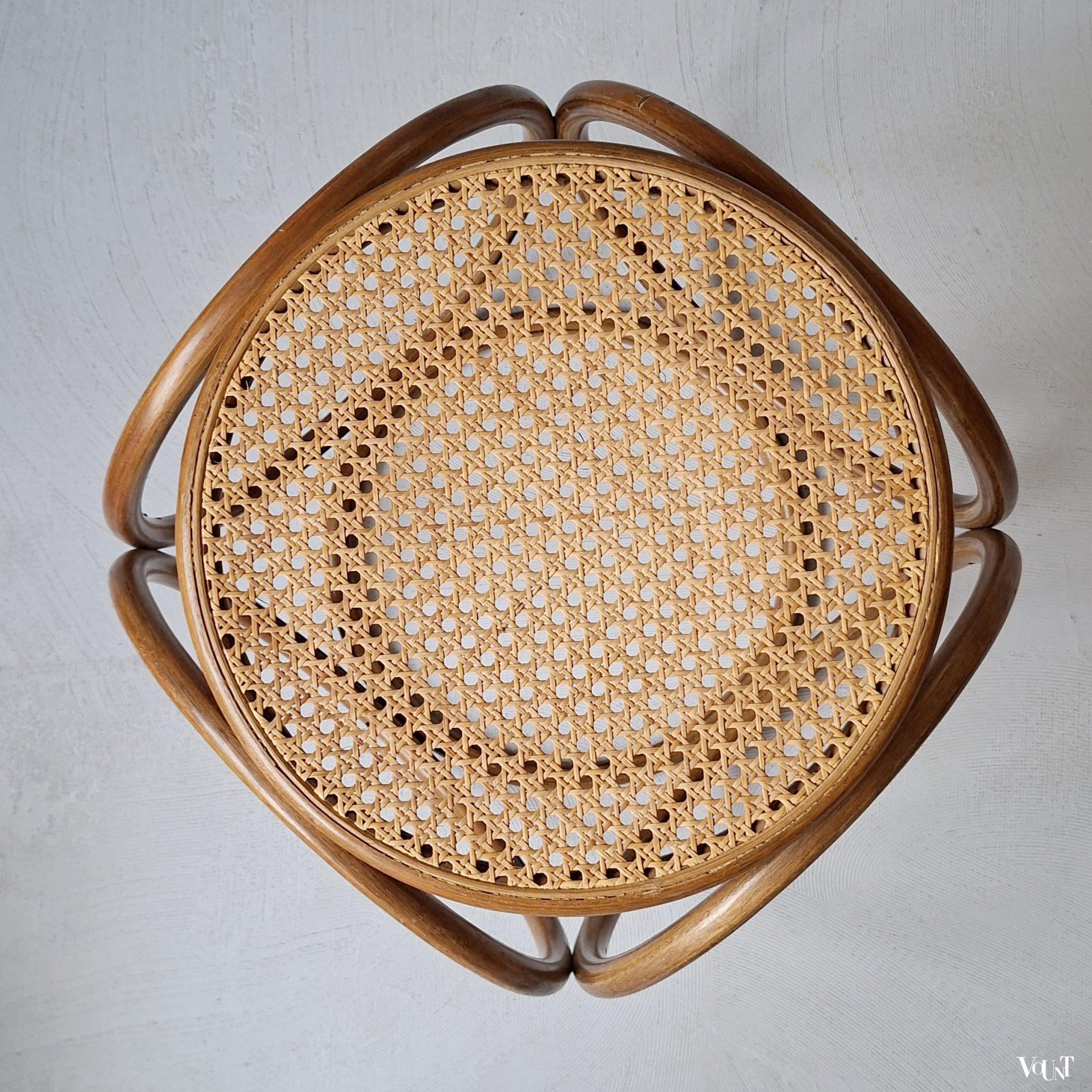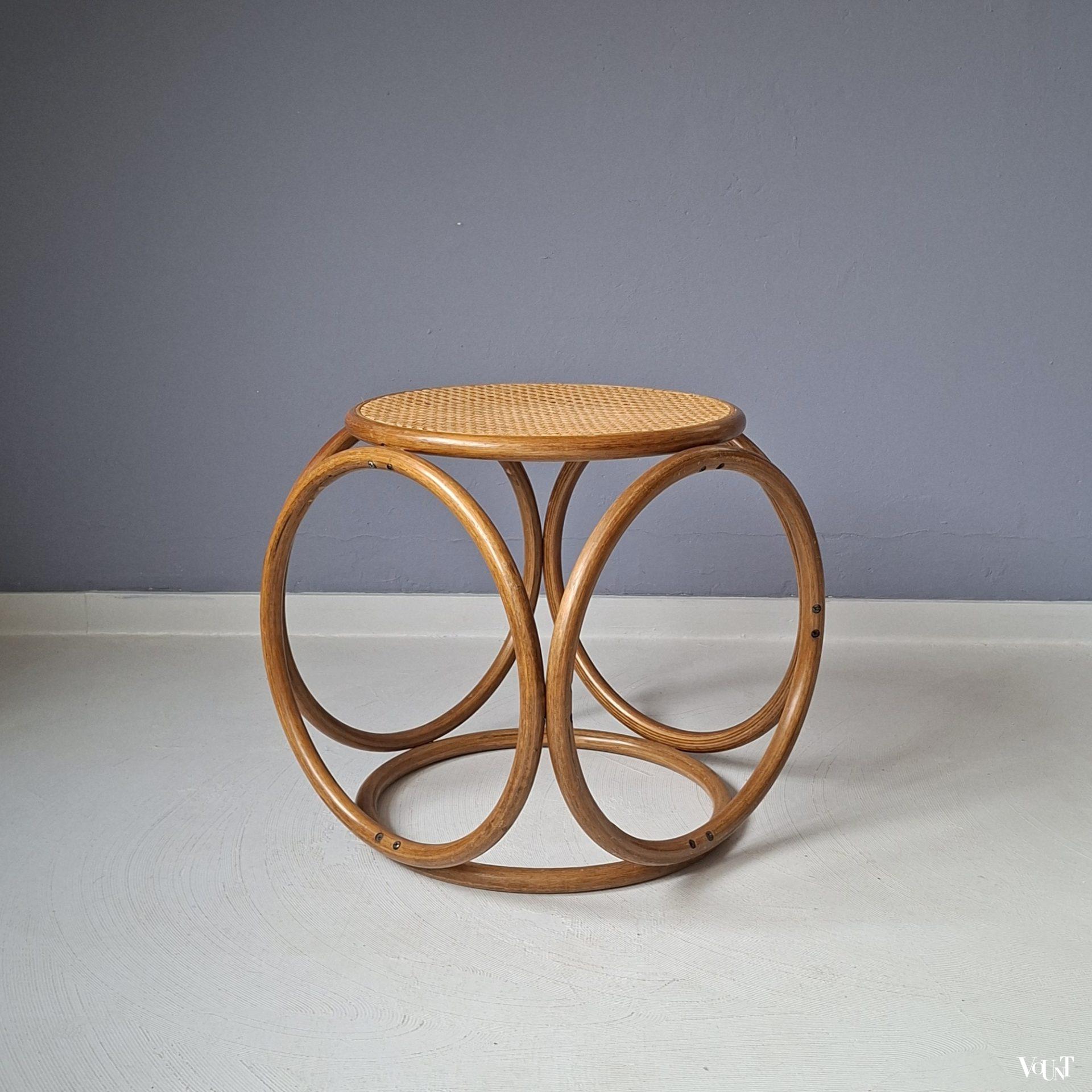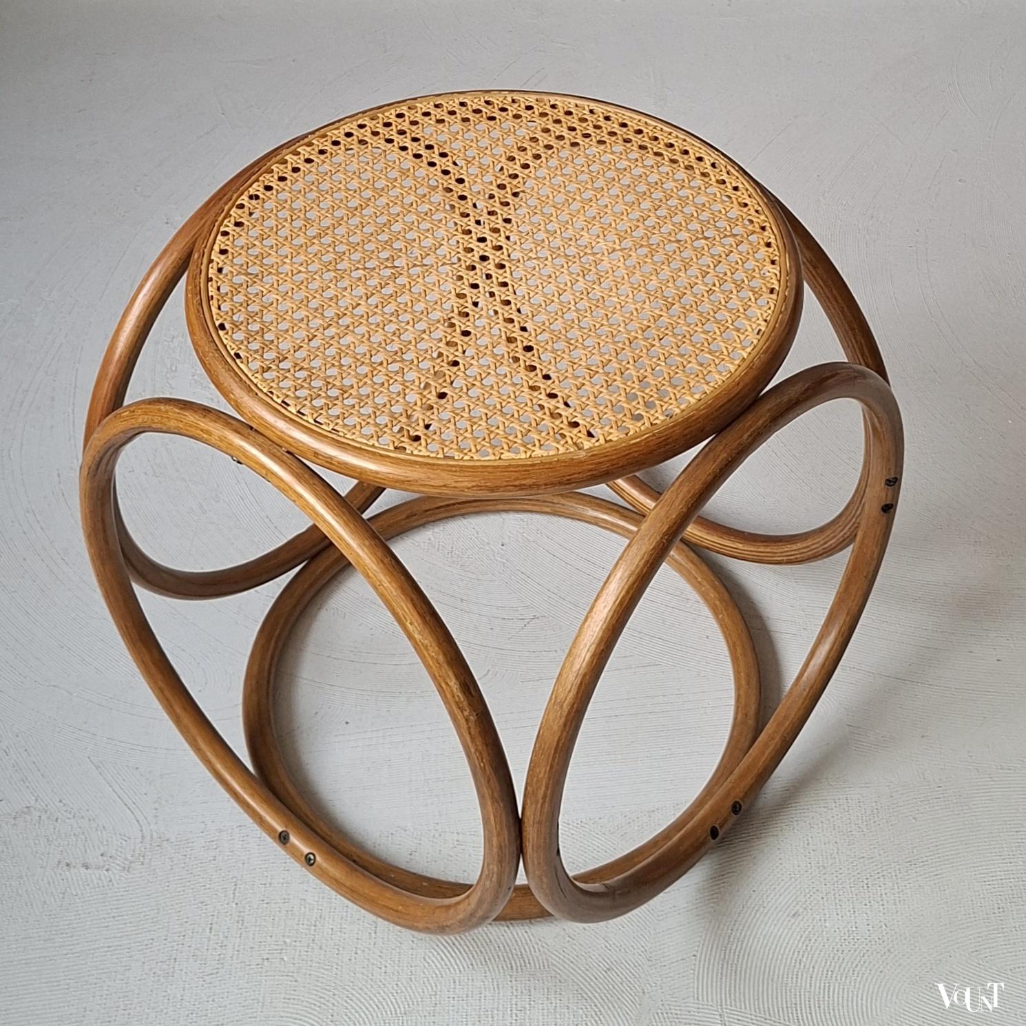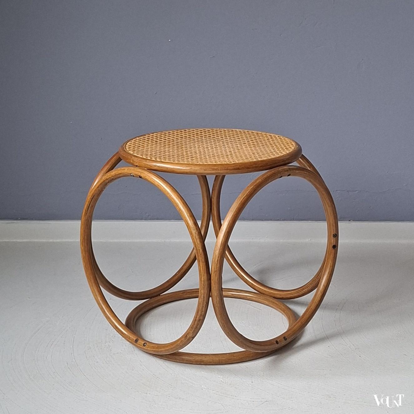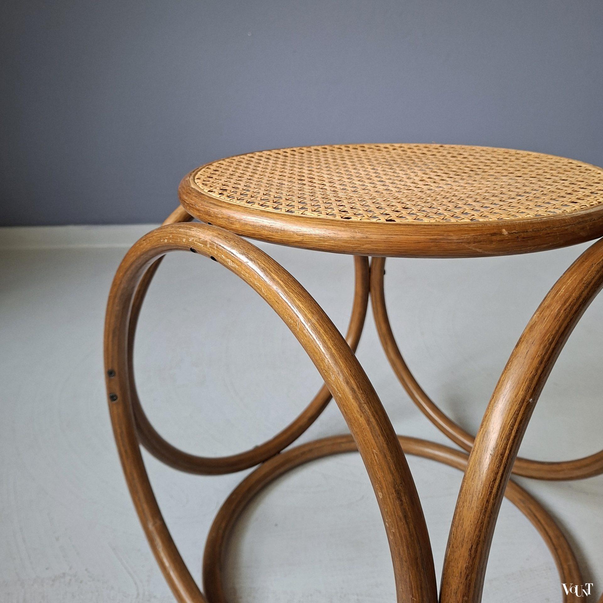 Het ontwerp van deze kruk, die bestaat uit ringen van gebogen hout (bentwood) en een gevlochten rotan zitting (webbing), wordt ook wel toegeschreven aan Thonet. Vanwege de vormgeving een bijzonder decoratief item. Hout en rotan in goede conditie.