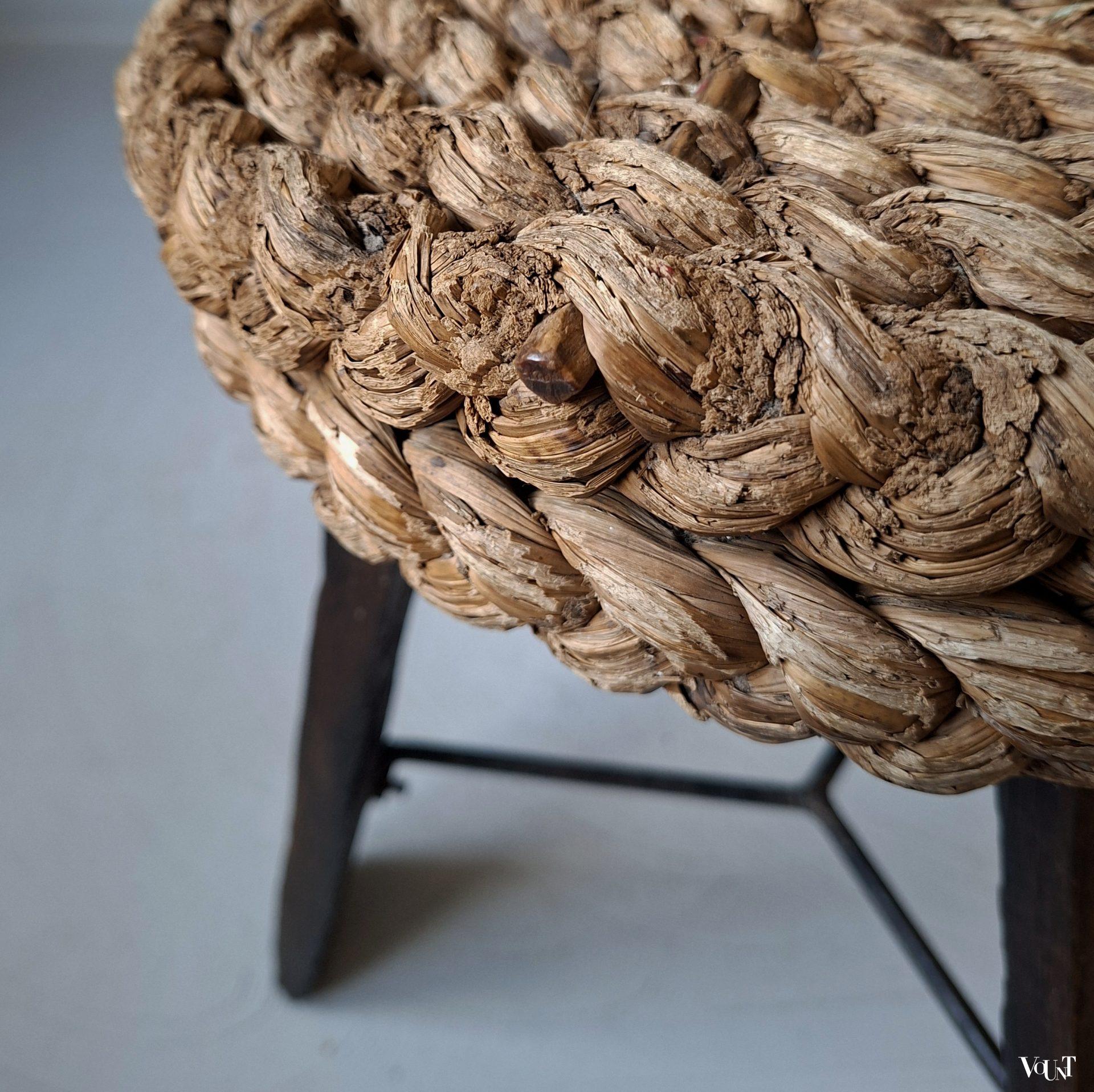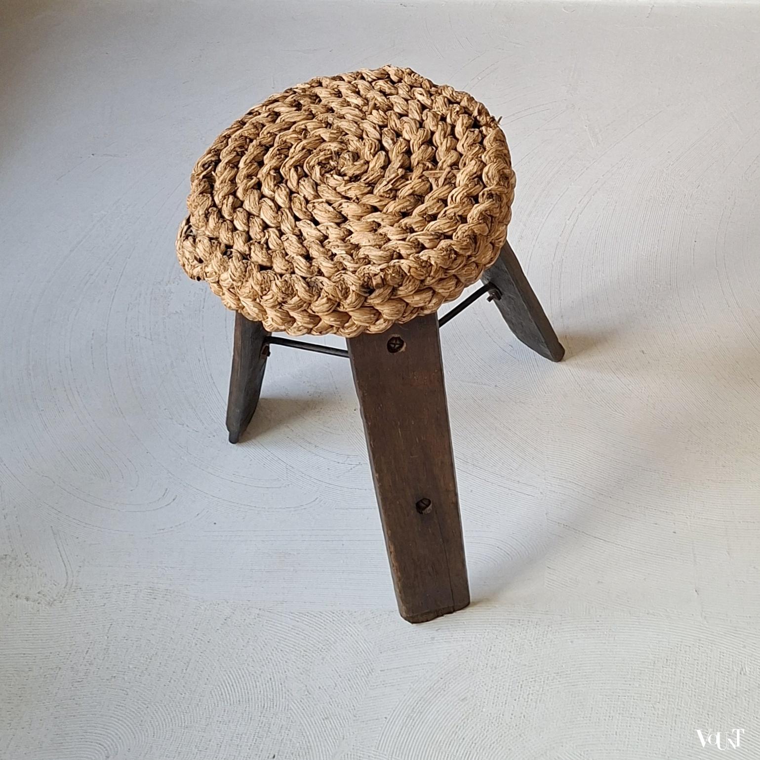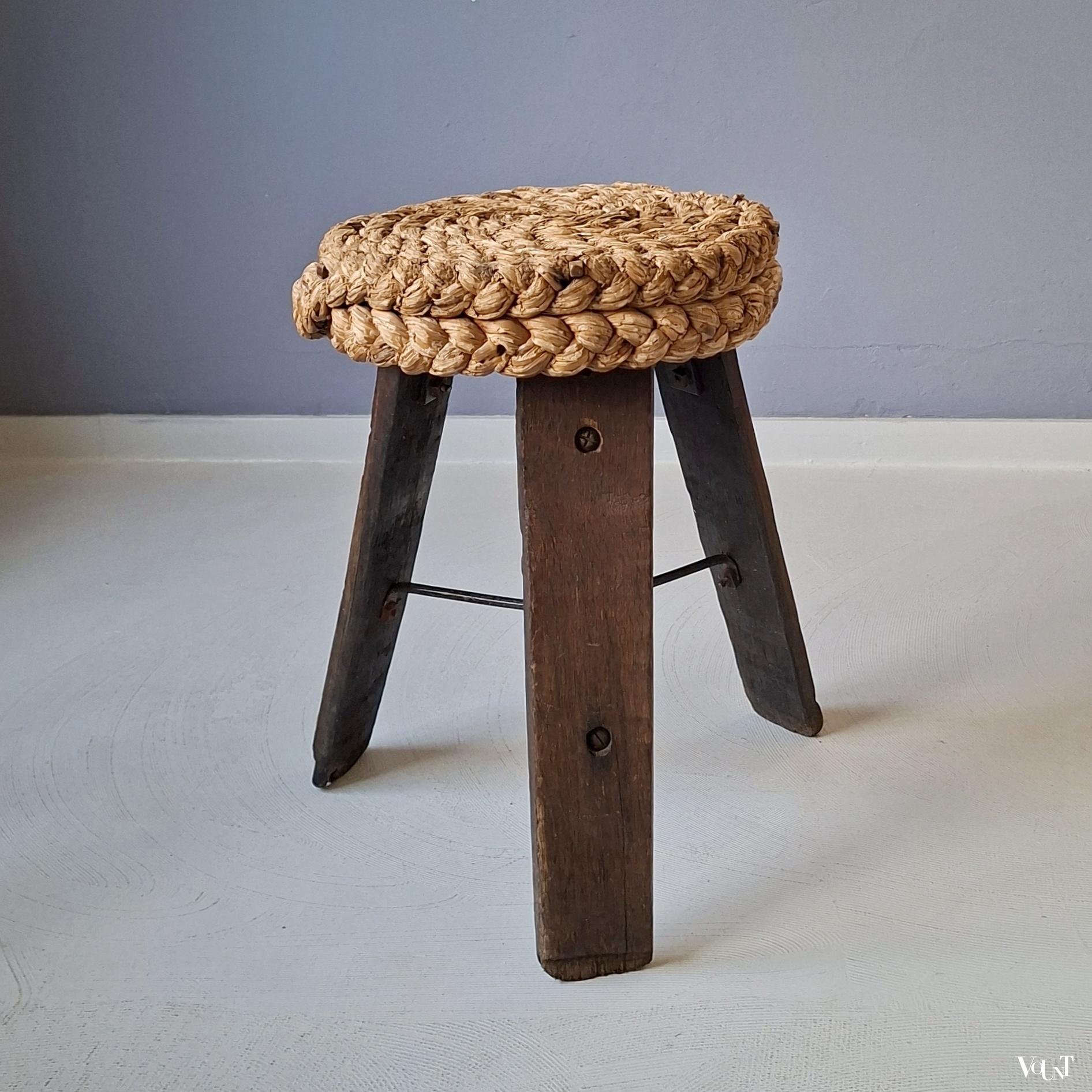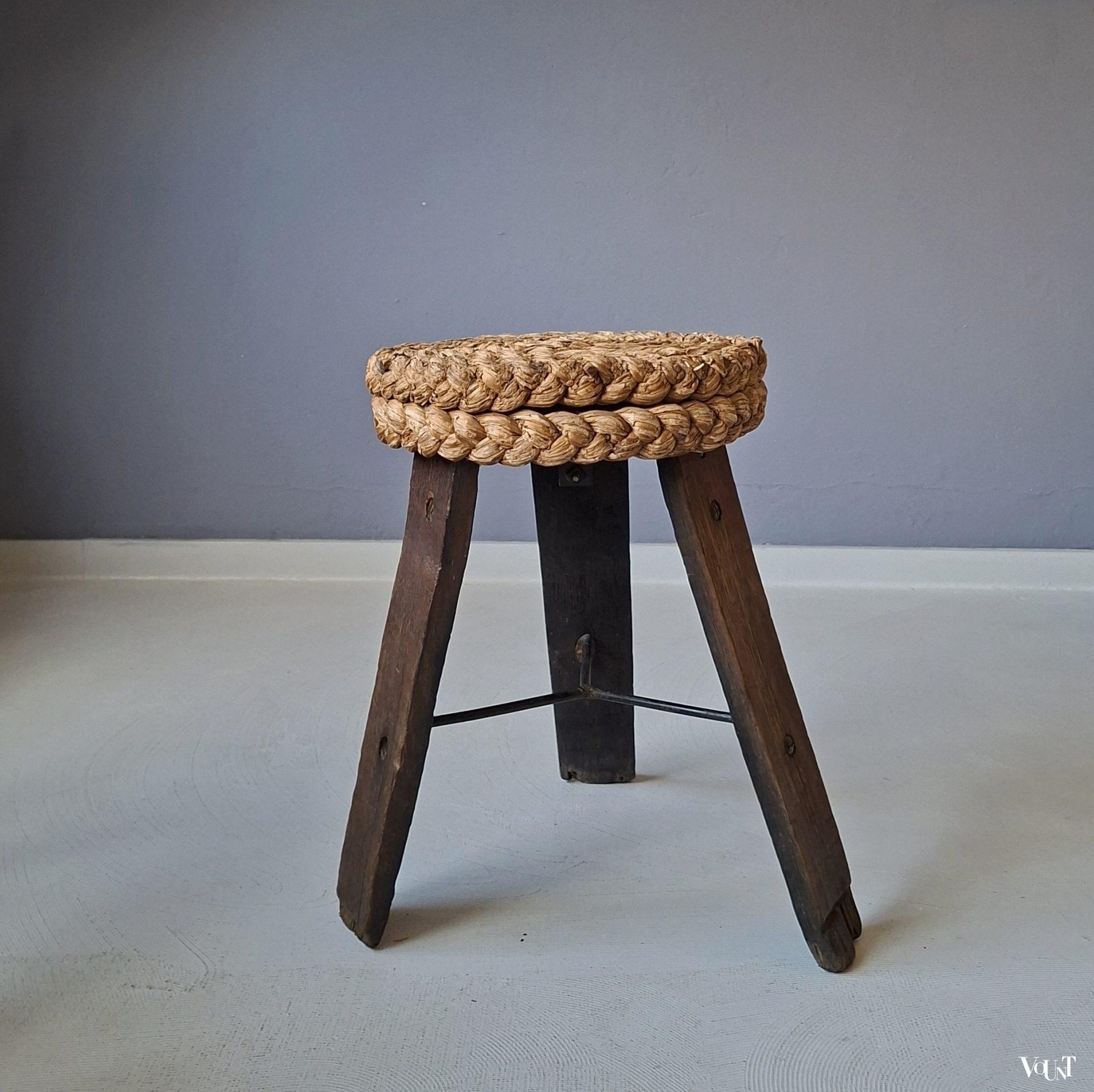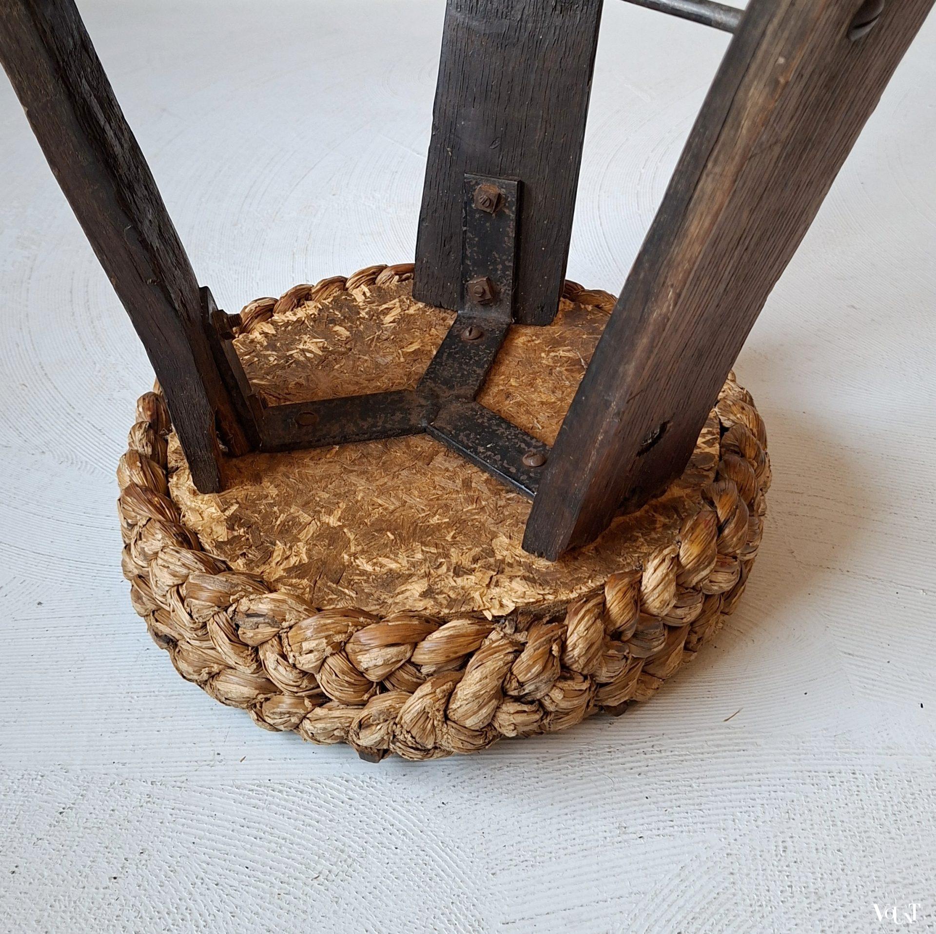 Deze kruk uit de jaren ’50 wordt toegeschreven aan het Franse designersduo Adrien Audoux en Frida Minnet (ook wel geschreven als “Minet”). Audoux & Minnet staan bekend om hun meubelontwerpen waarin ze onder meer, zoals hier, oud hout (van wijnvaten) en zeegras toepassen. Deze kruk (hout en zeegras) vertoont sporen van ouderdom en gebruik, maar is in goede vintage conditie. Stevig.