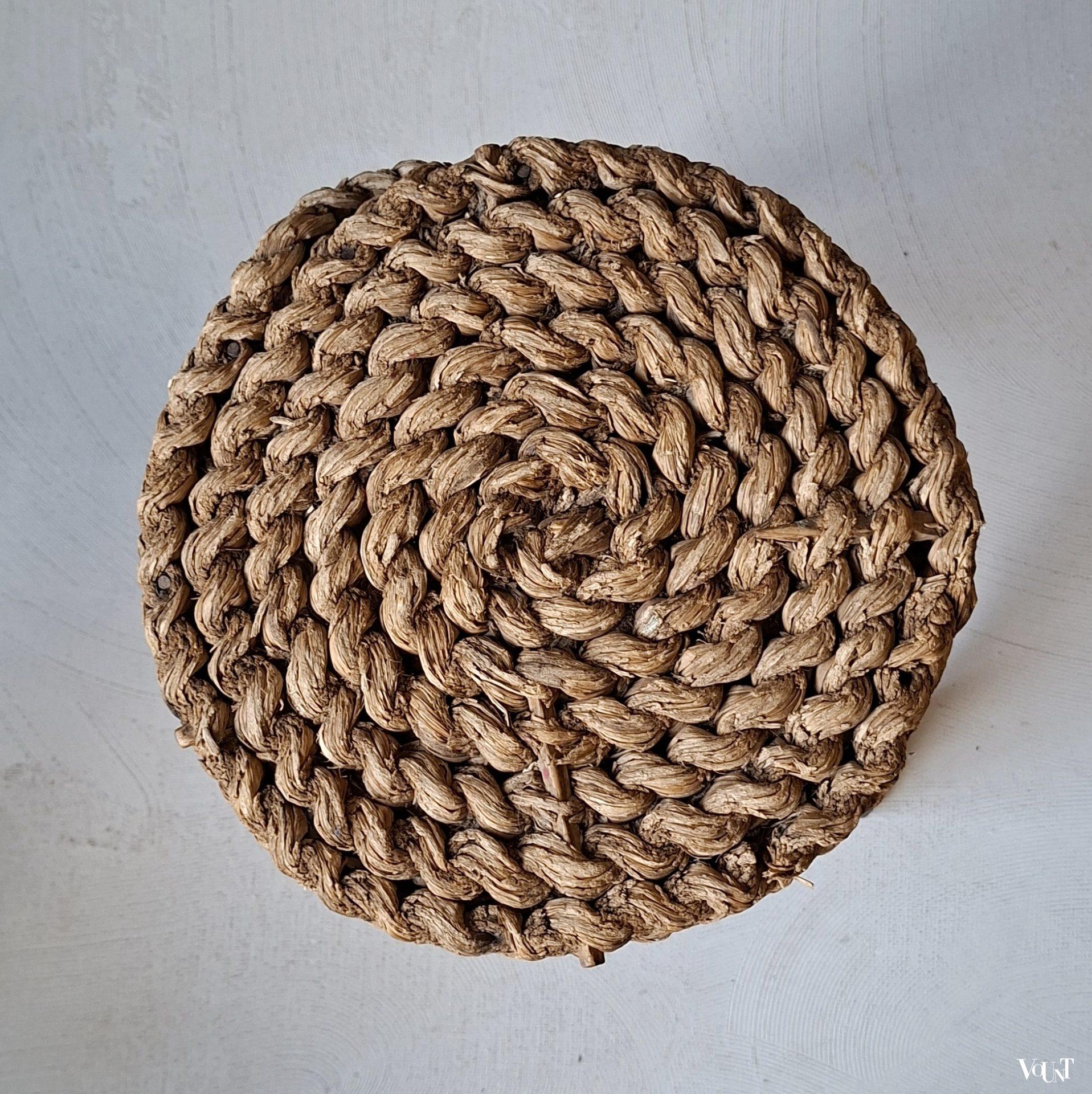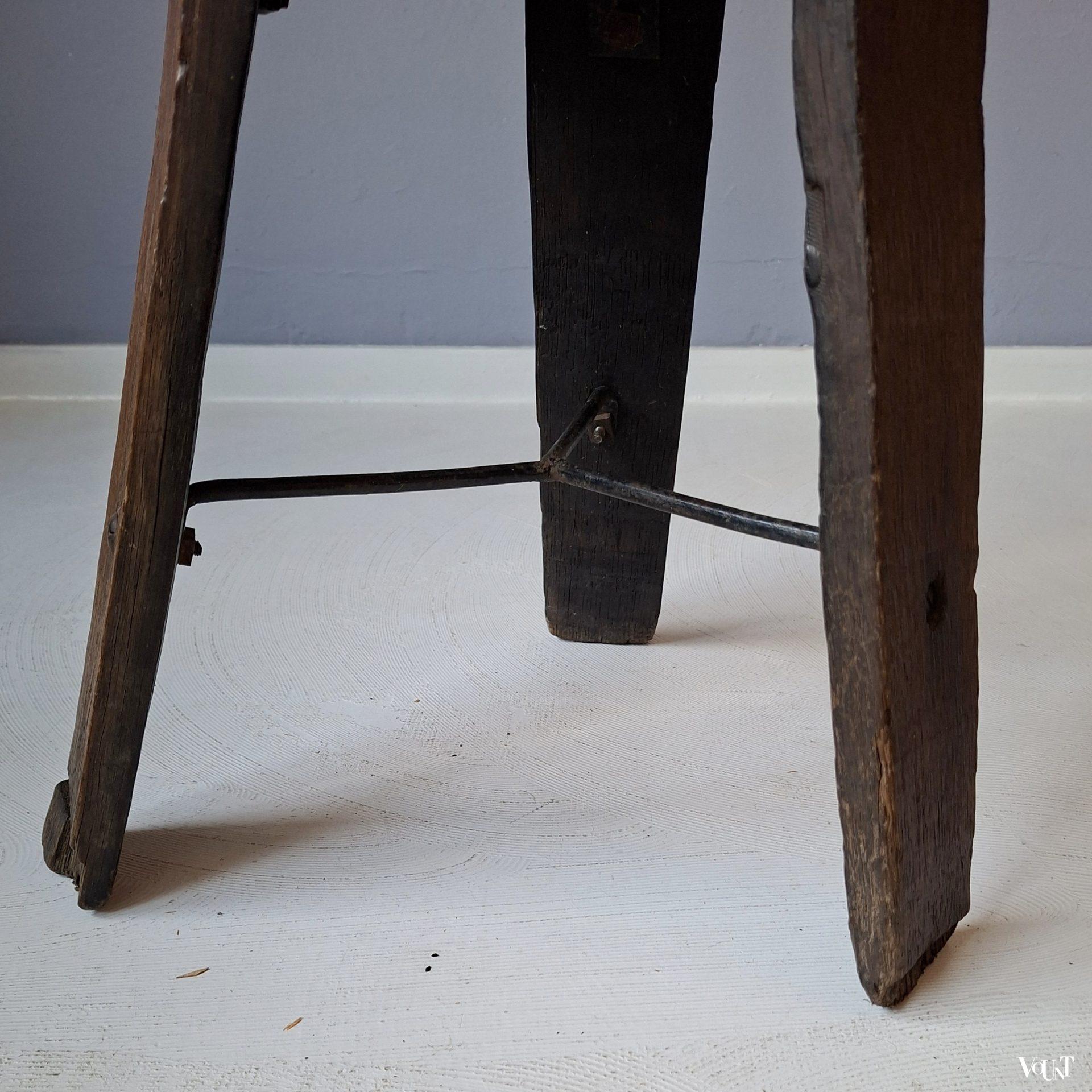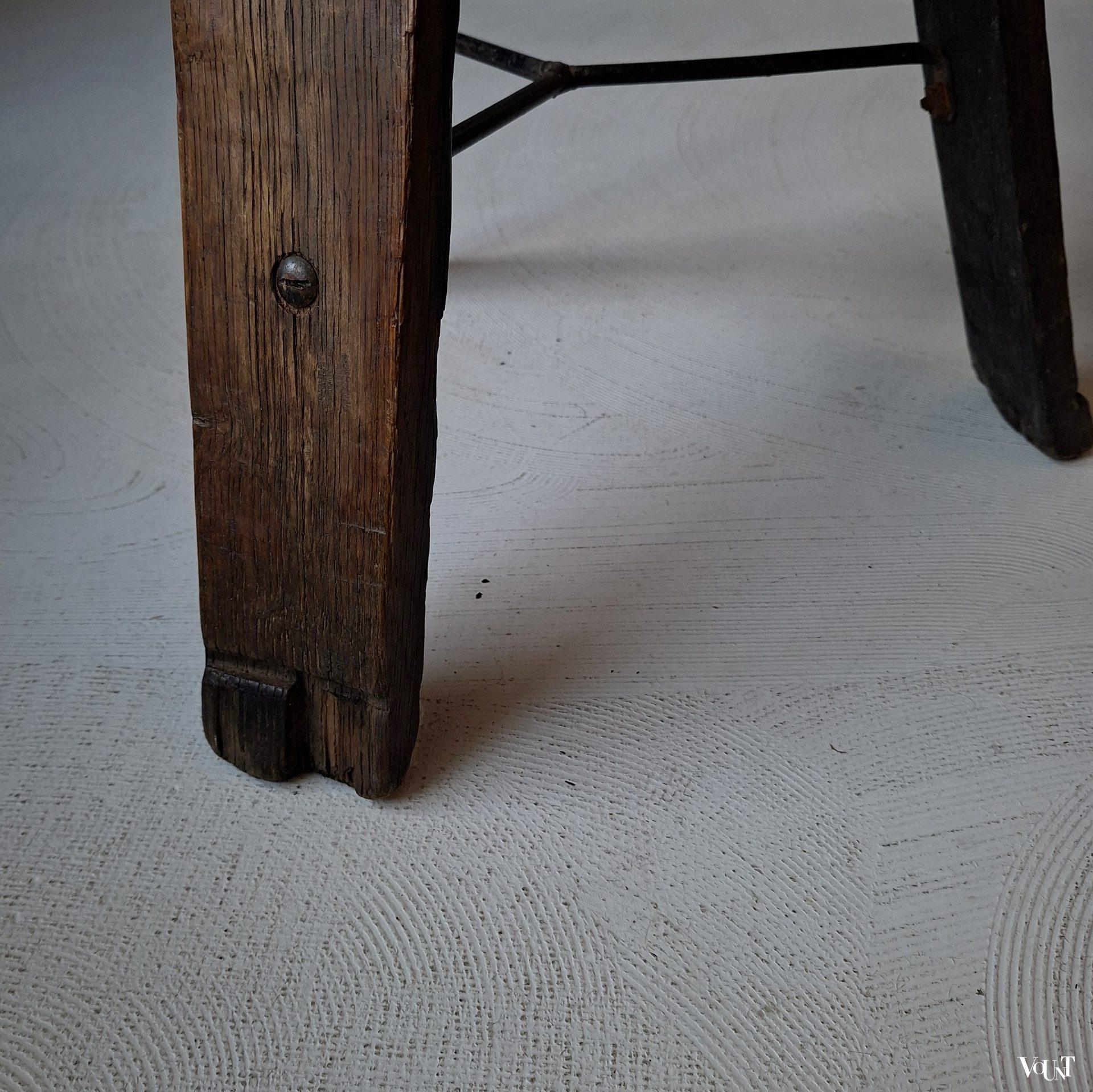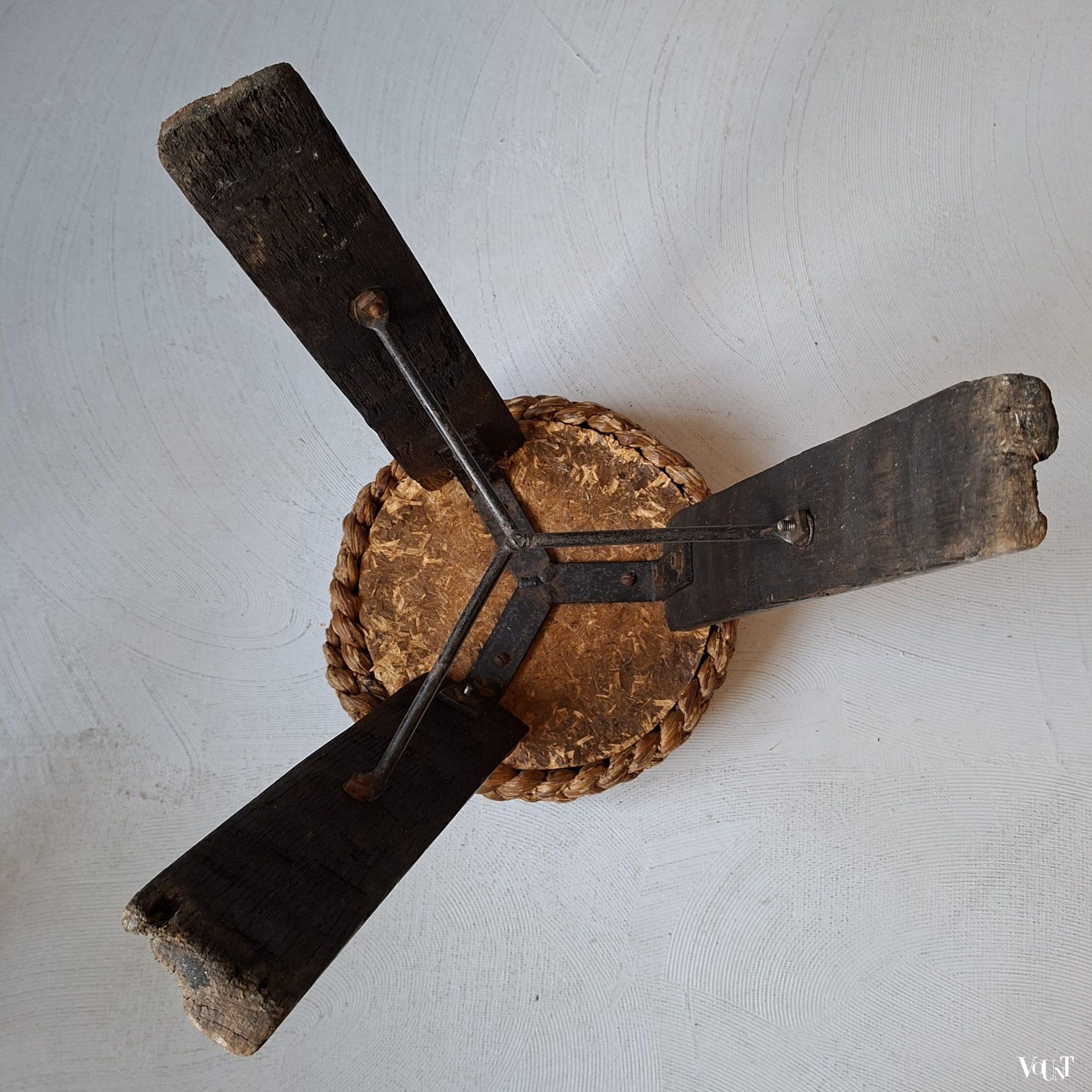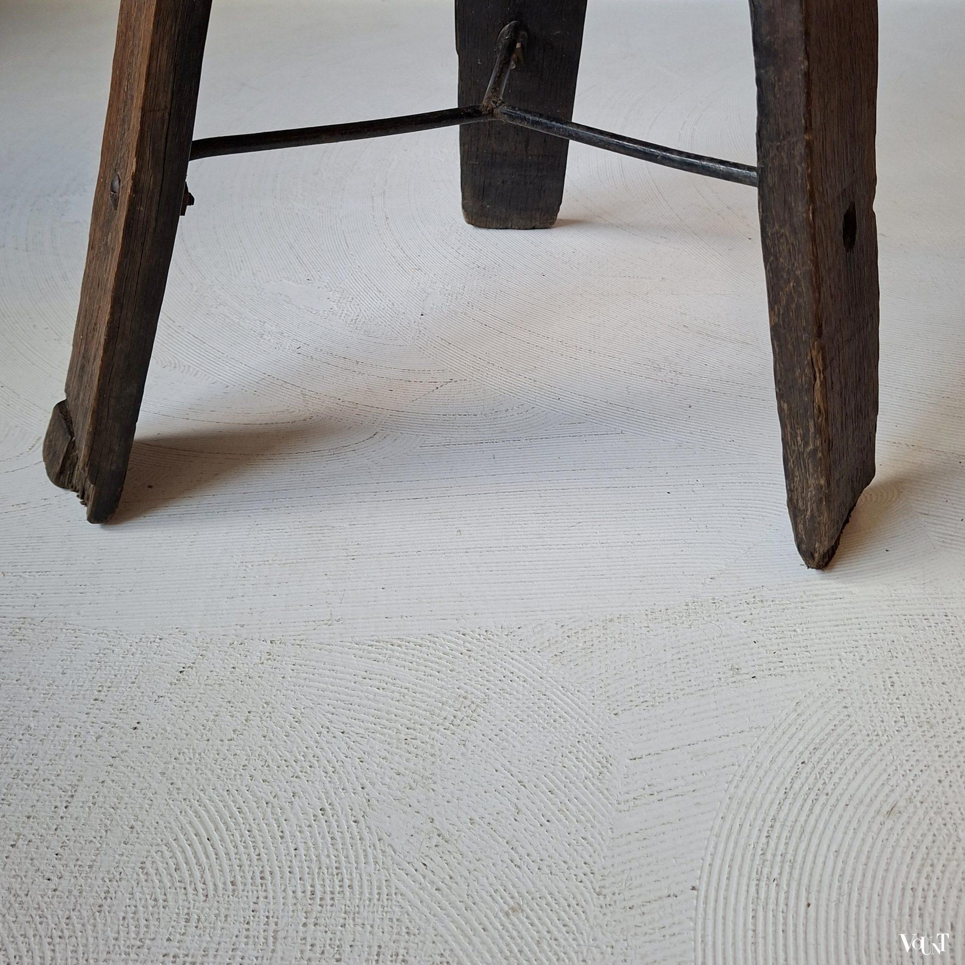 Deze kruk uit de jaren ’50 wordt toegeschreven aan het Franse designersduo Adrien Audoux en Frida Minnet (ook wel geschreven als “Minet”). Audoux & Minnet staan bekend om hun meubelontwerpen waarin ze onder meer, zoals hier, oud hout (van wijnvaten) en zeegras toepassen. Deze kruk (hout en zeegras) vertoont sporen van ouderdom en gebruik, maar is in goede vintage conditie. Stevig.