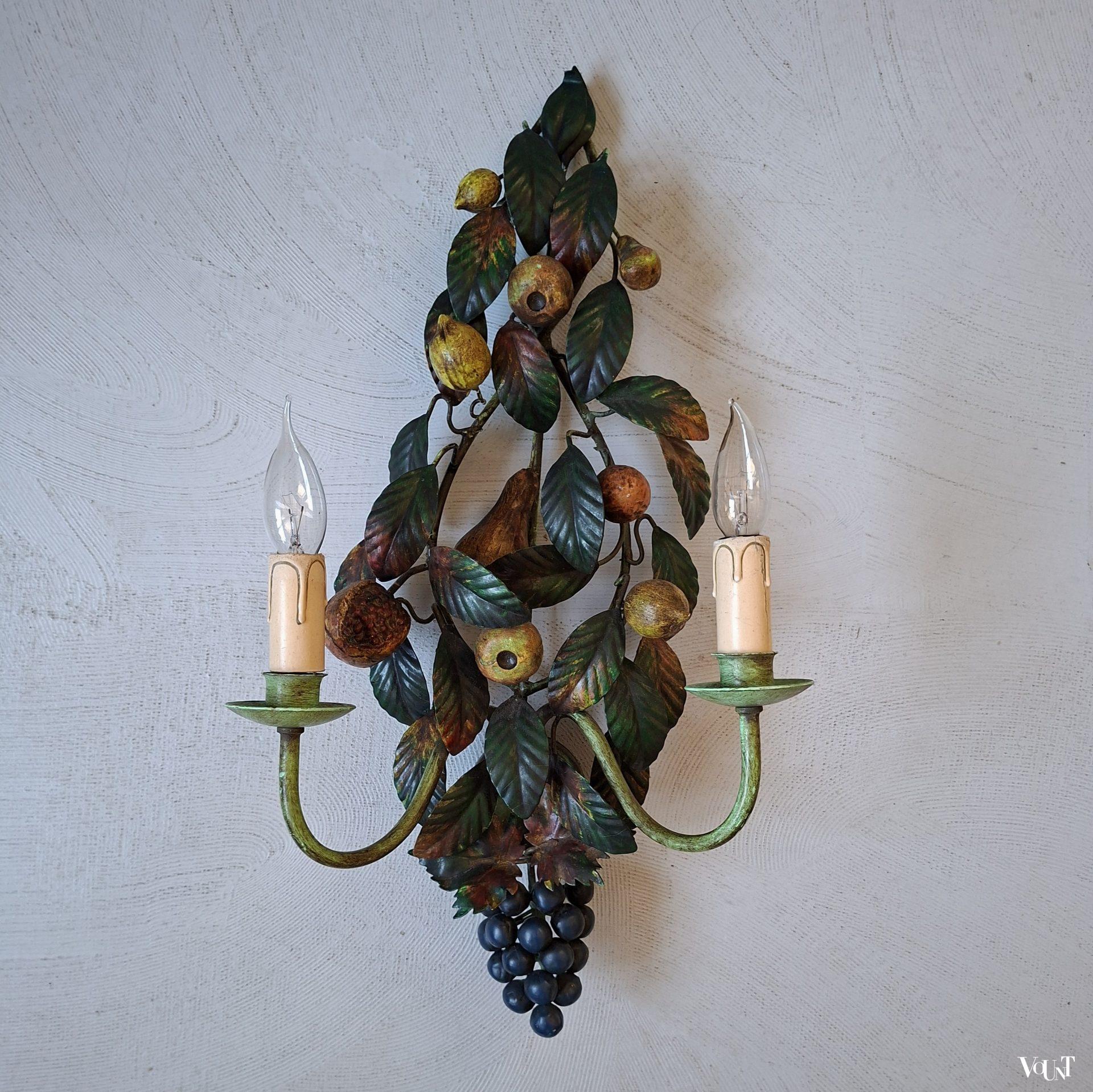 Deze wandlamp met 2 lichtpunten is voorzien van metalen fruitdecoratie in de vorm van druiven, peren, citroenen en een granaatappel. Waarschijnlijk afkomstig uit Italië. Aan de achterzijde voorzien van een metalen oog om deze op te hangen.
