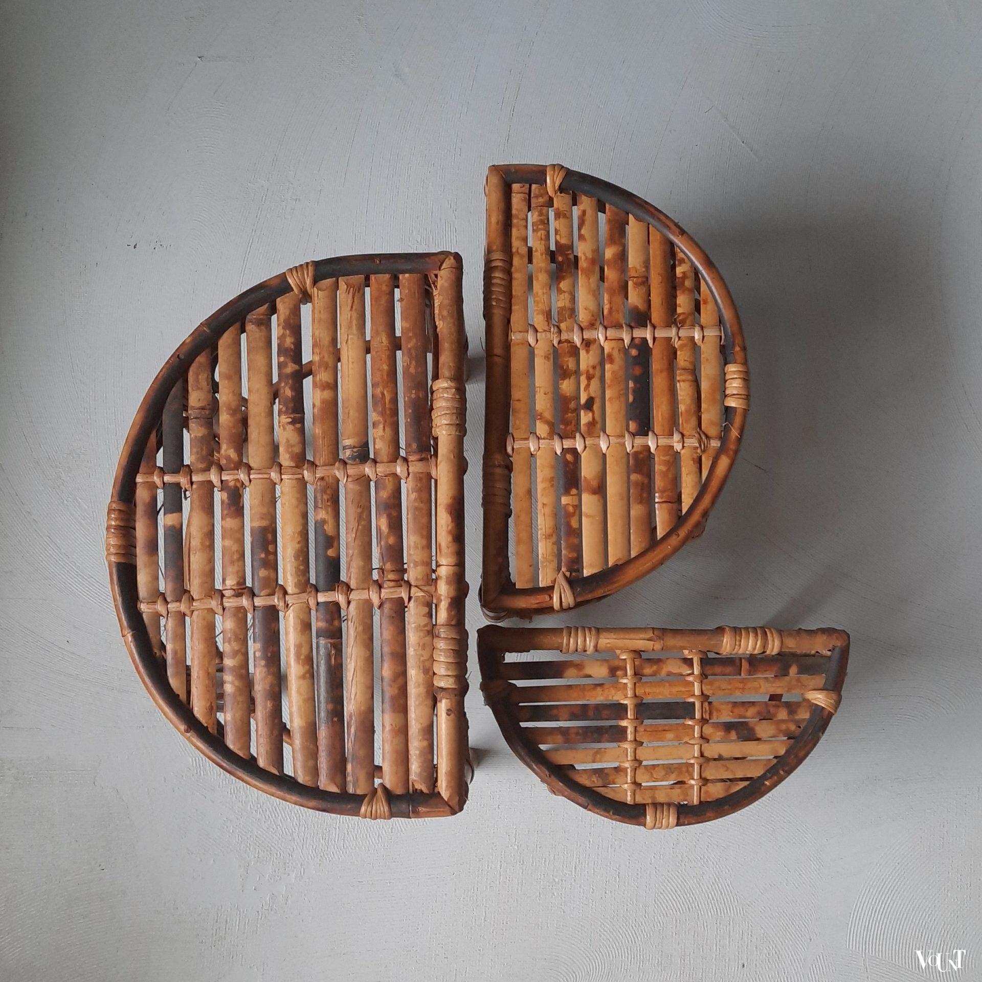 Mimiset van 3 bamboe bijzettafeltjes. Ideaal voor tiny houses. Passen perfect in elkaar. In goede vintage-conditie.