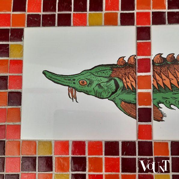 Mozaïekpaneel in typisch jaren ’70 kleuren. De tegels die samen een steur vormen, zijn afkomstig uit de Mosa tegelfabriek in Maastricht, jaren ’70. In een eenvoudige houten lijst.