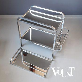 Dit bijzondere naaimeubel uit de jaren ’50 wordt toegeschreven aan het Nederlandse Metalux. Het bestaat uit een zwart metalen standaard met daaraan in vier verschillende kleuren uitgevoerde houten dozen met deksel. De dozen kunnen gedraaid worden op en losgehaald worden van de standaard. In heel goede, originele conditie met lichte gebruikssporen.