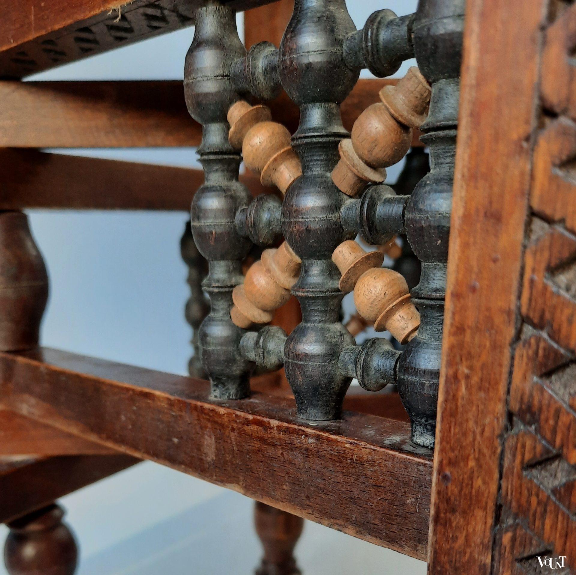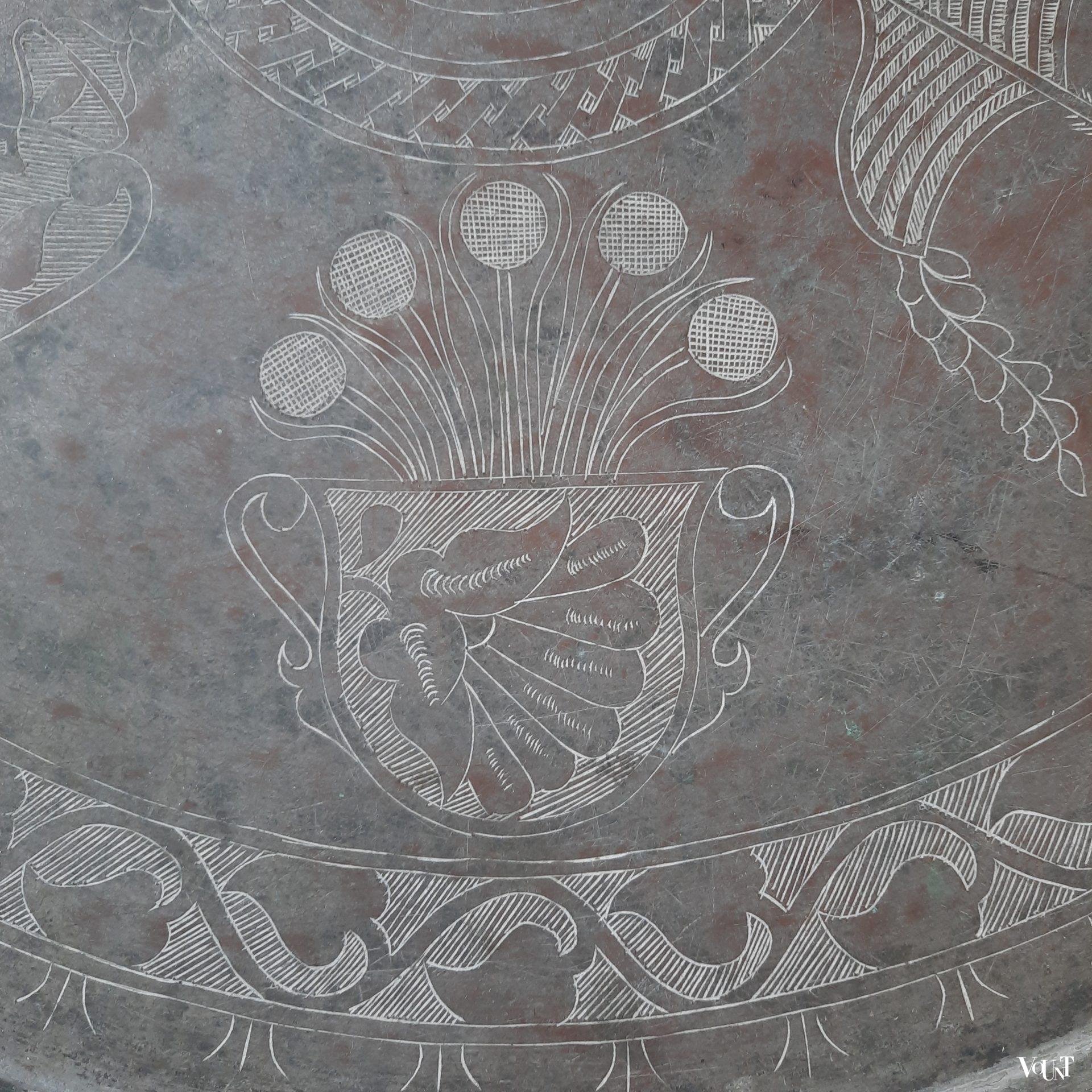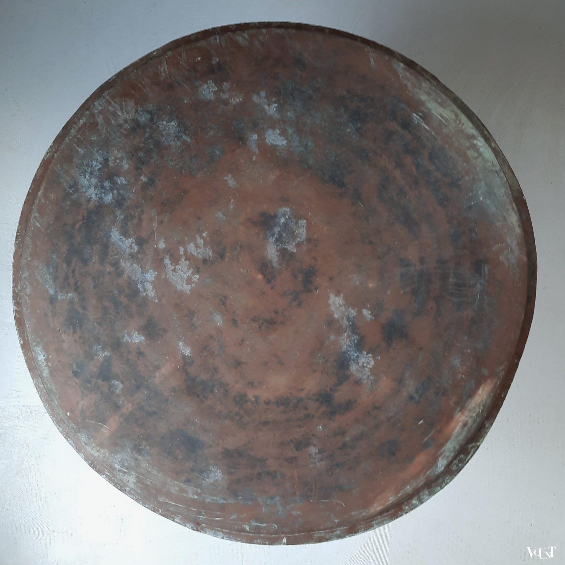 Deze in Frankrijk aangekochte tafel is afkomstig uit Algerije of Marokko. Het is een oud exemplaar. Het grote koperen blad van ca. 5 kg is met de hand bewerkt / geëtst. Normale sporen van leeftijd en gebruik.