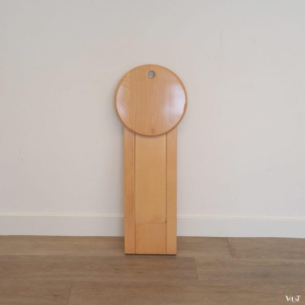 Deze kruk, die door Adrian Reed is ontworpen, wordt vaak verward met de TS kruk van de Franse designer Roger Tallon voor Sentou of omgekeerd. Er zijn verschillen, maar de overeenkomst is toch wel erg frappant. Er bestaat een hoge en een lage uitvoering van de kruk. Dit is de hoge uitvoering van 62 cm. De kruk is gemakkelijk in te klappen en kan vanwege het gat in de zitting eenvoudig aan een haak tegen de muur opgehangen worden. Gemaakt van beukenhout. In goede conditie. Sticker van de fabrikant onder de zitting.