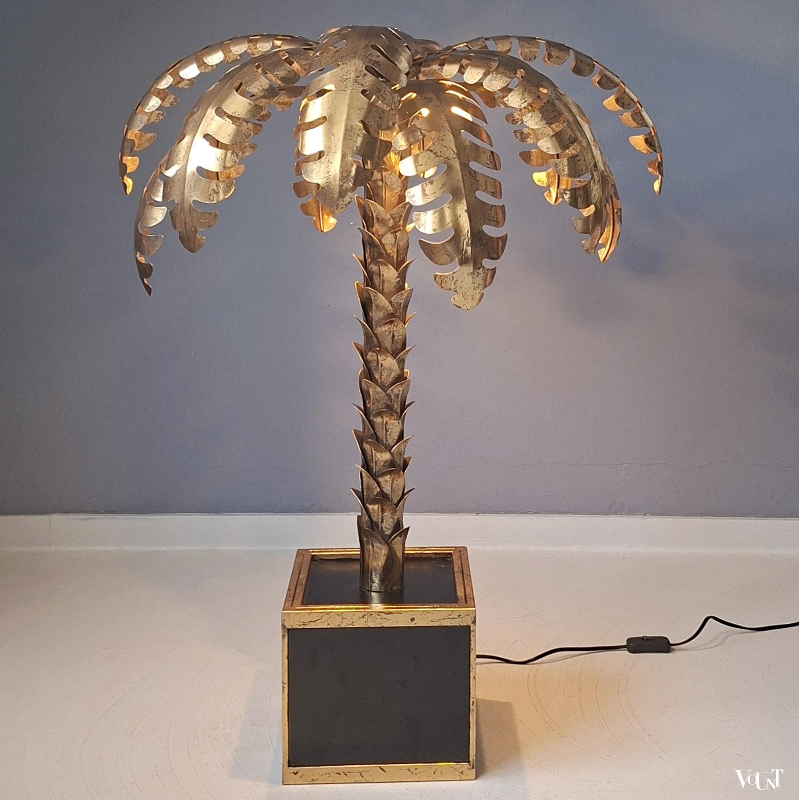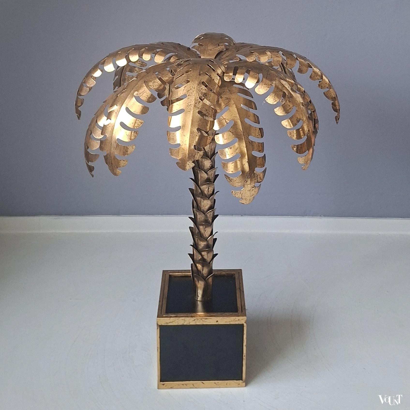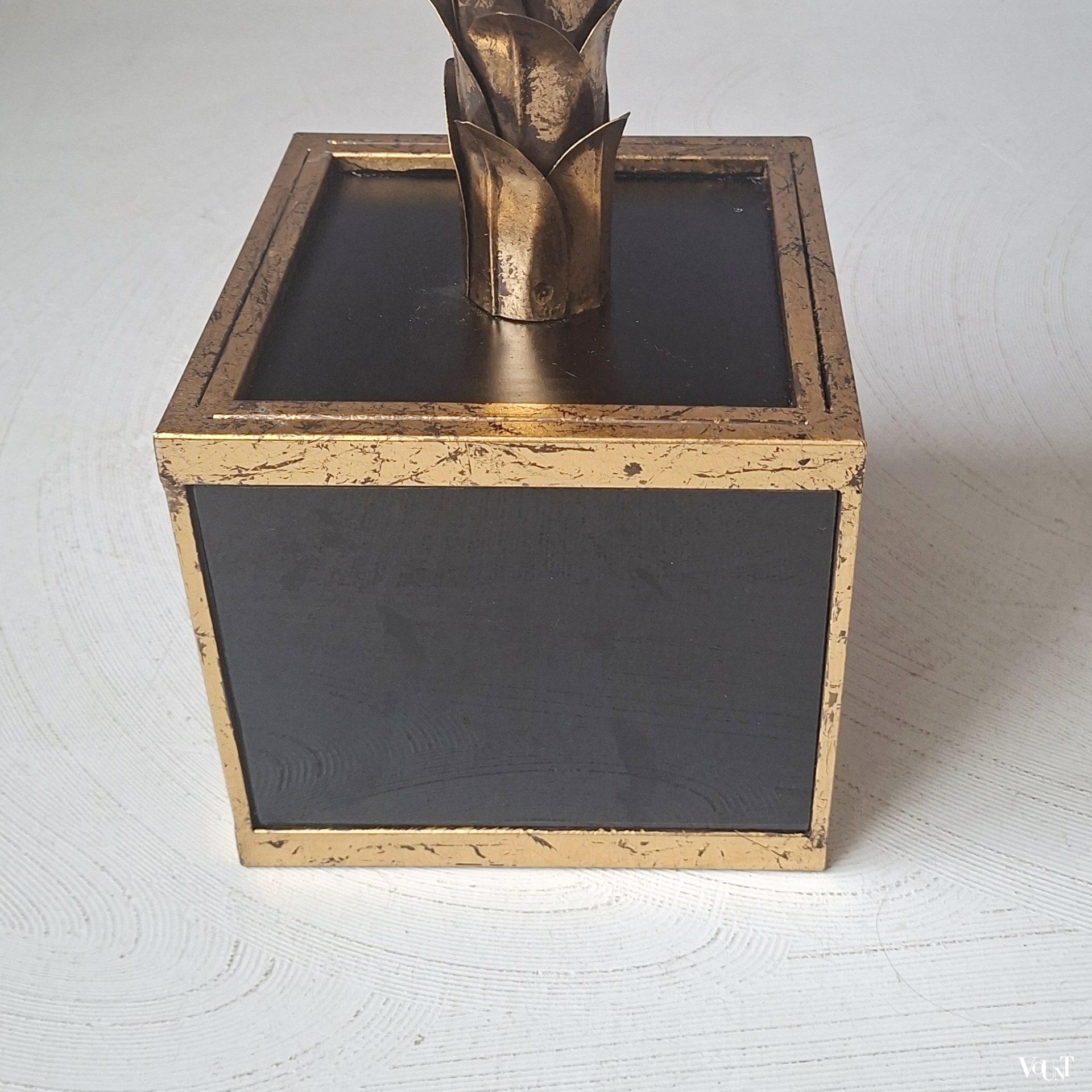 Deze palmboomlamp bestaat uit een vierkante voet in een goudkleurig metalen frame, zwarte glazen platen aan weerszijden en een metalen zwarte plaat bovenop. De stam en de bladeren zijn eveneens van goudkleurig metaal. De lamp kan zowel als vloerlamp als als (grote) tafellamp worden gebruikt. Voorzien van 2 lichtpunten. Geeft mooi warm licht. Voorzien van een zwart snoer met schakelaar (45 cm). Datering: jaren ’70. Werkend en in heel goede conditie.