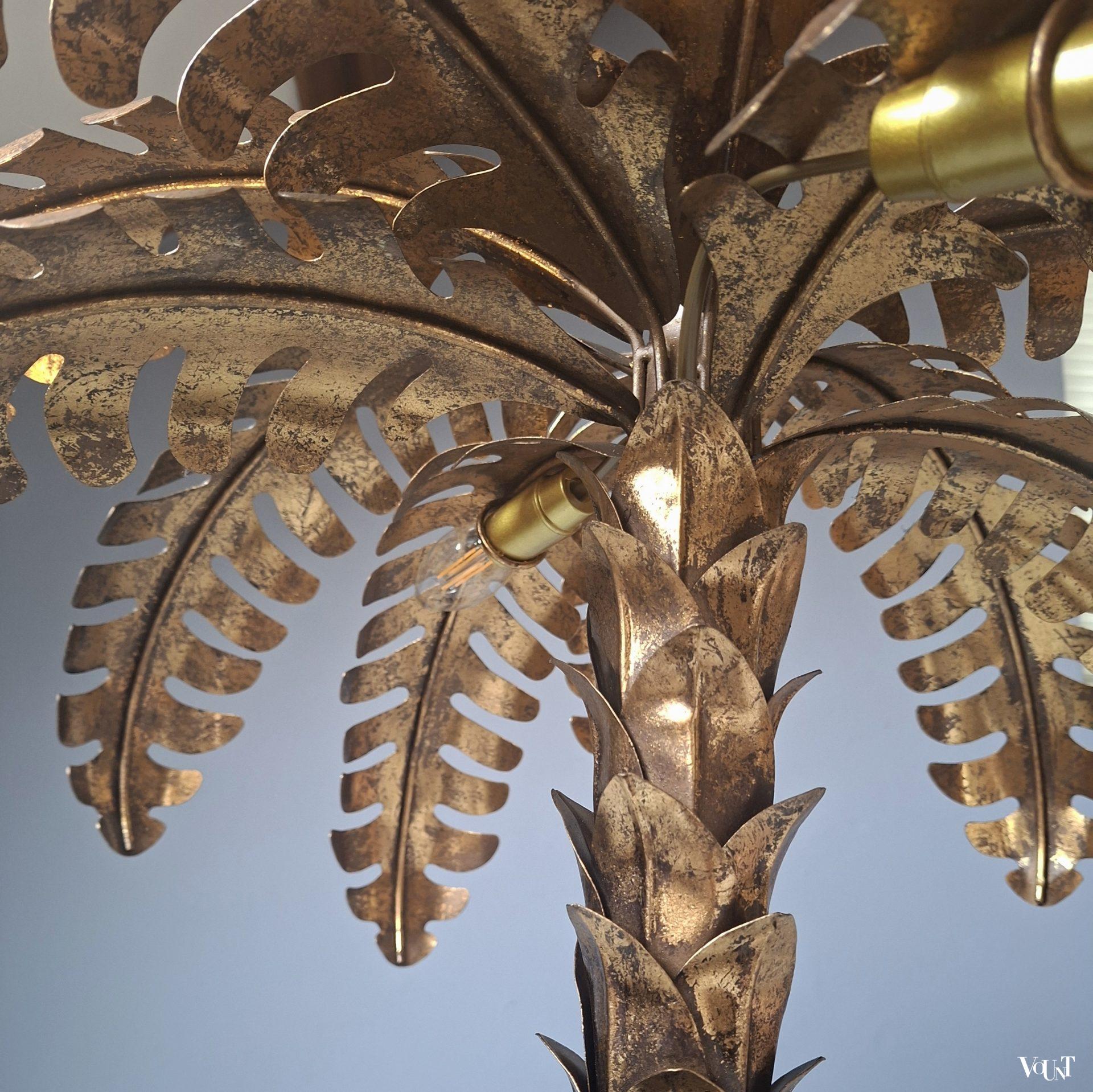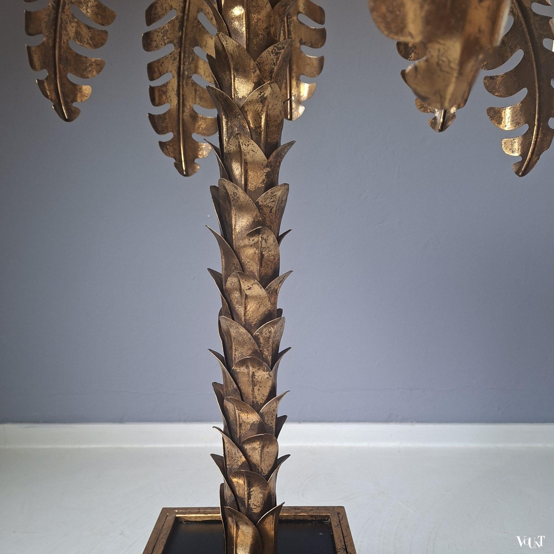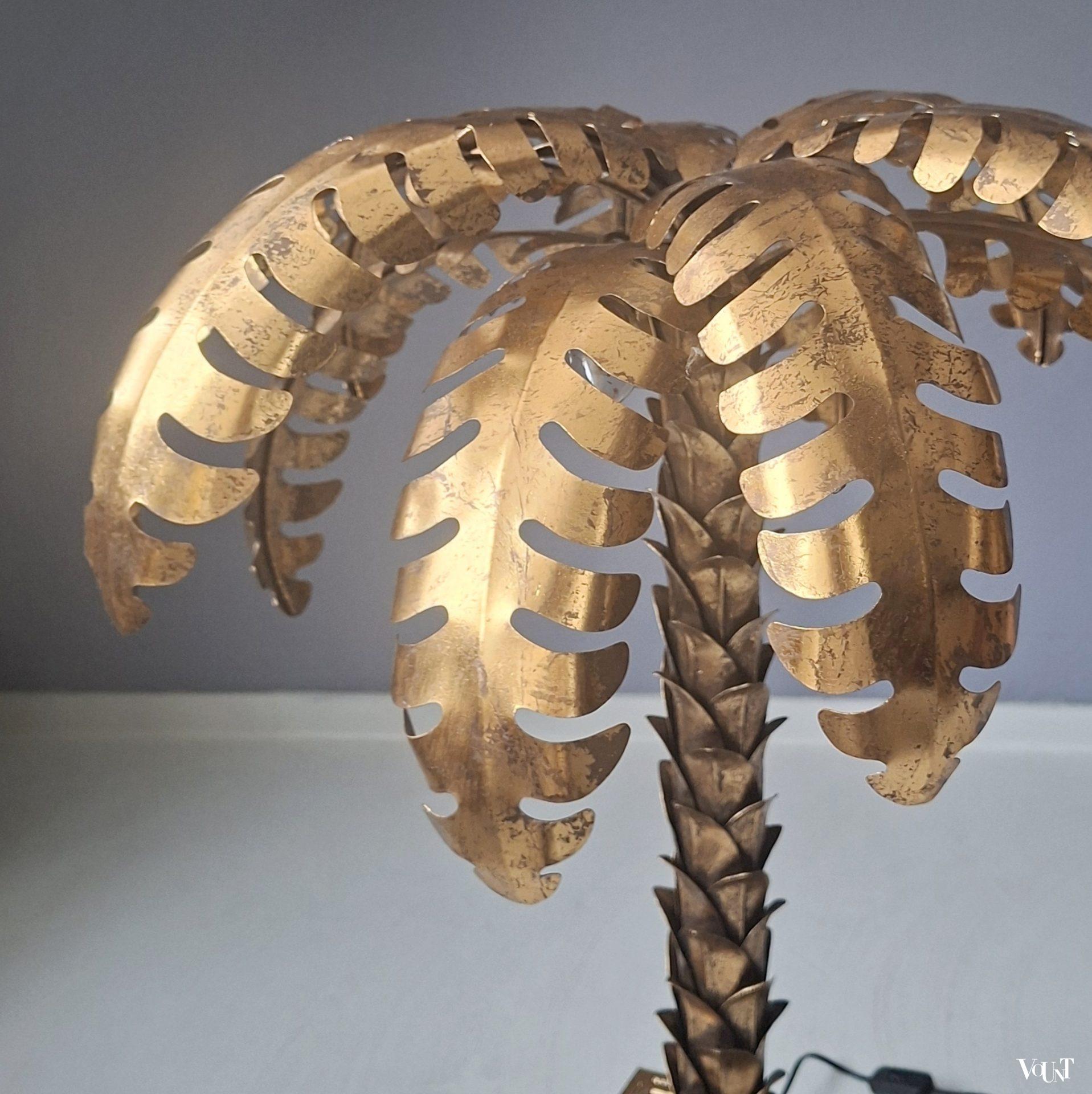 Deze palmboomlamp bestaat uit een vierkante voet in een goudkleurig metalen frame, zwarte glazen platen aan weerszijden en een metalen zwarte plaat bovenop. De stam en de bladeren zijn eveneens van goudkleurig metaal. De lamp kan zowel als vloerlamp als als (grote) tafellamp worden gebruikt. Voorzien van 2 lichtpunten. Geeft mooi warm licht. Voorzien van een zwart snoer met schakelaar (45 cm). Datering: jaren ’70. Werkend en in heel goede conditie.