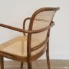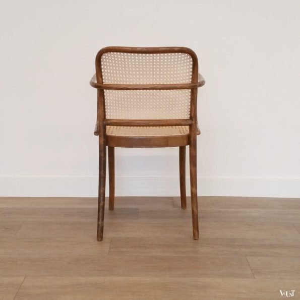 Het ontwerp van deze Praag of 811 stoel is van de Oostenrijker Josef Hoffmann, die de stoel in de jaren ’20 heeft ontworpen voor Thonet. Tijdloos design: de stoel was zowel in de jaren ’30 als in de jaren ’50/’60 populair (onder anderen onder architecten), en is ook nu weer erg gewild. Deze stoel is in de jaren ’50/’60 door de Poolse firma ZPM Radomsko of de firma FMG vervaardigd (“Made in Poland”). ZPM Radomsko en FMG zijn voortgekomen uit de nationalisering/onteigening van Thonet-fabrieken na de 2e Wereldoorlog. De stoel draagt dus niet de naam Thonet, maar is wel in dezelfde fabriek en met dezelfde machines vervaardigd. In goede staat. Rugleuning en zitting hebben een nieuwe met de hand geweven rotan webbing.