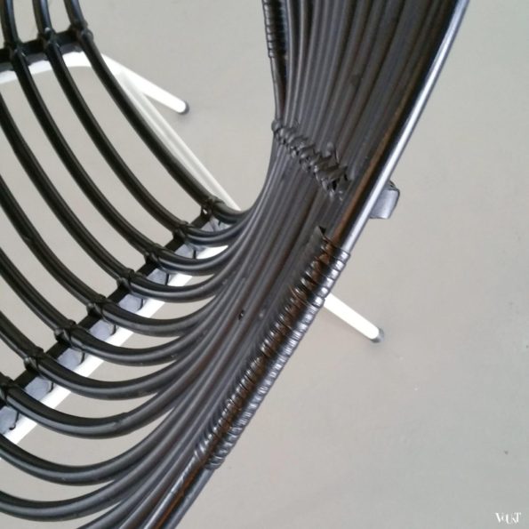 Dit ronde jaren ’60 rotanstoeltje bestaat uit een wit metalen frame en zwart geverfde rotan. Het ontwerp wordt toegeschreven aan H. Broekhuizen. De stoel is voor de leeftijd in zeer goede staat. Geringe gebruikssporen.