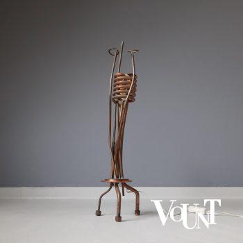 Bijzondere rotan tafellamp uit de jaren ’70. Gecombineerd met messing elementen. In goede, werkende conditie.