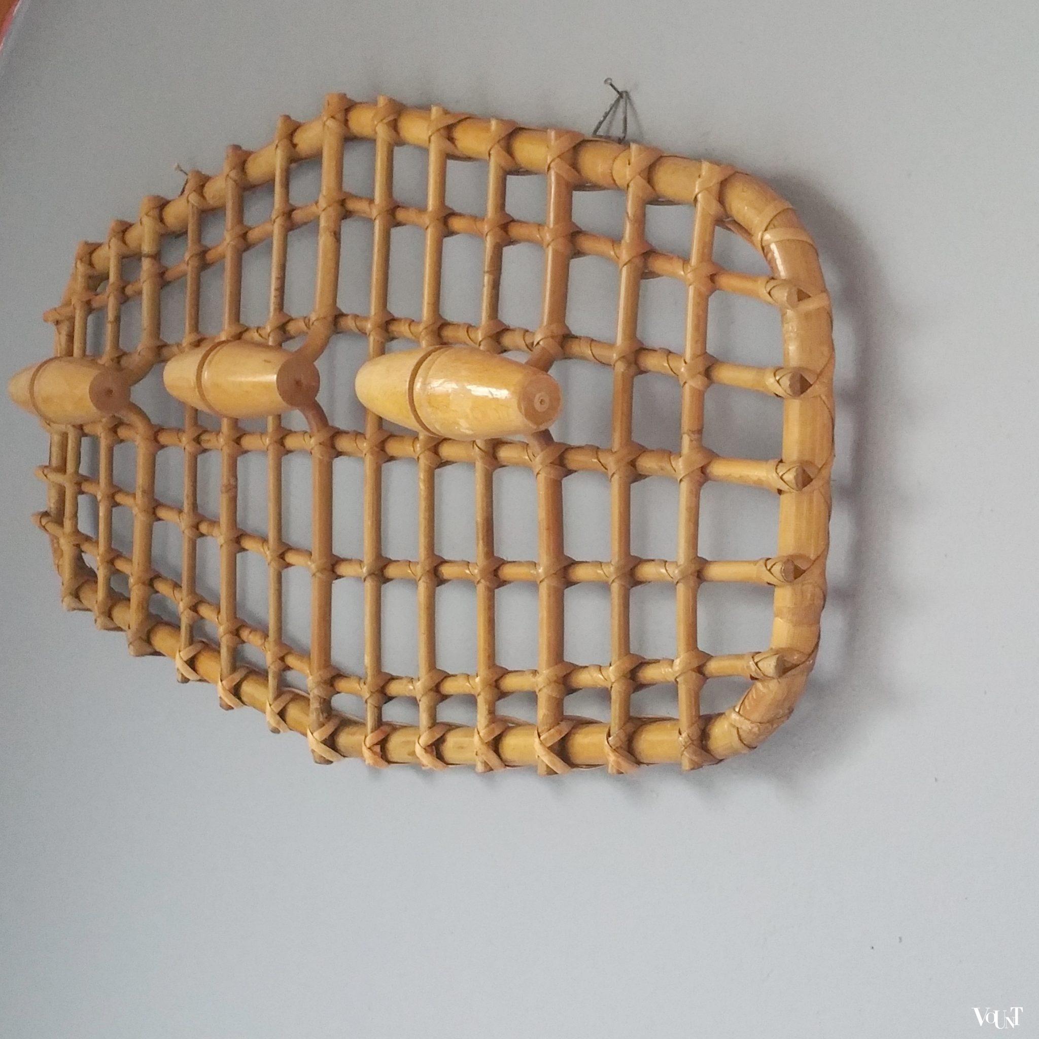 Bijzondere wandkapstok uit de jaren ’50, gemaakt van rotan, met 3 houten knoppen. Gebruikssporen overeenkomstig leeftijd.