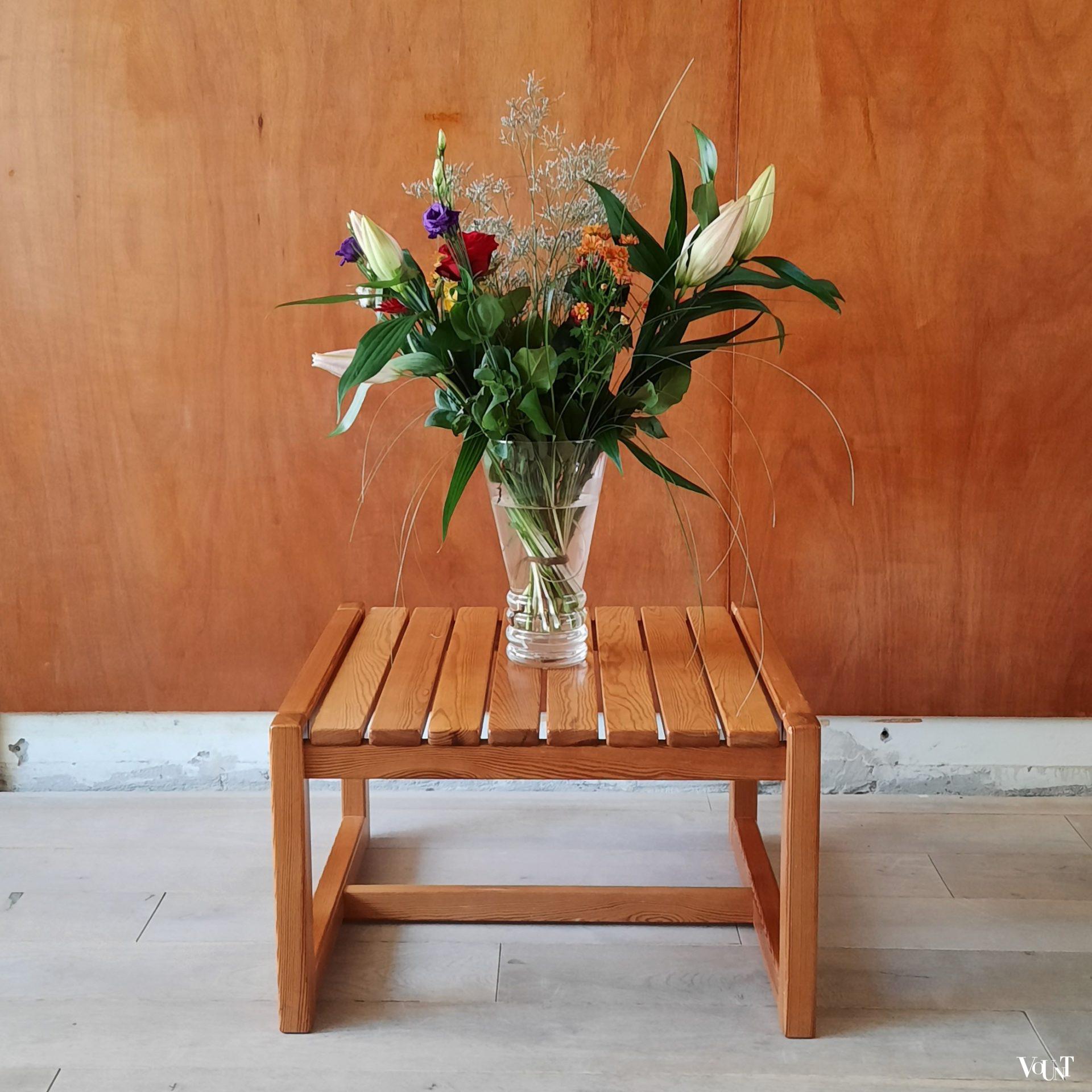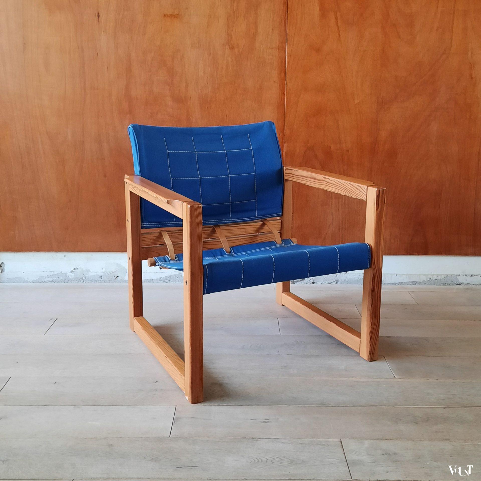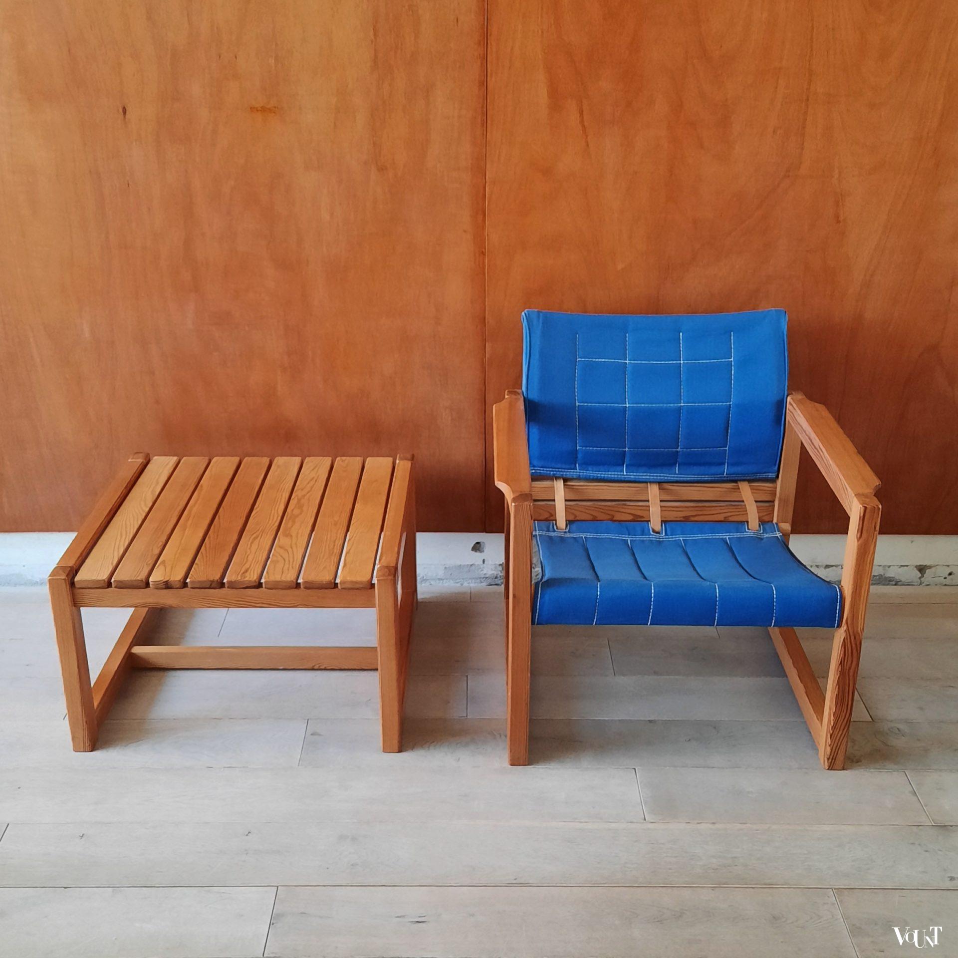 Deze safaristoel “Diana” werden in de jaren ’70 door Karin Mobring ontworpen voor Ikea, evenals het bijbehorende tafeltjes. Blauwe doorgestikte katoenen bekleding (deze kleur kom je niet veel tegen) en leren riempjes aan de achterzijde van de stoel. Stoel en tafeltje zijn in goede conditie. Voor leeftijd en gebruik normale gebruikssporen.