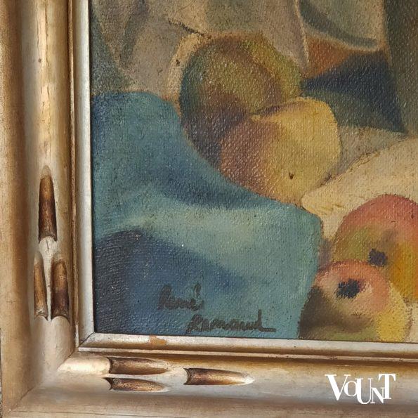 René Renaud (1907 – 1991) is een Frans kunstenaar die zich toelegde op schilderijen en keramiek. Hij exposeerde onder meer in de jaren ’40 van de vorige eeuw in Parijs. Dit schilderij van een stilleven met kruik heeft nog de originele houten lijst (goud-/zilverkleurig). Gesigneerd in de linkeronderhoek.